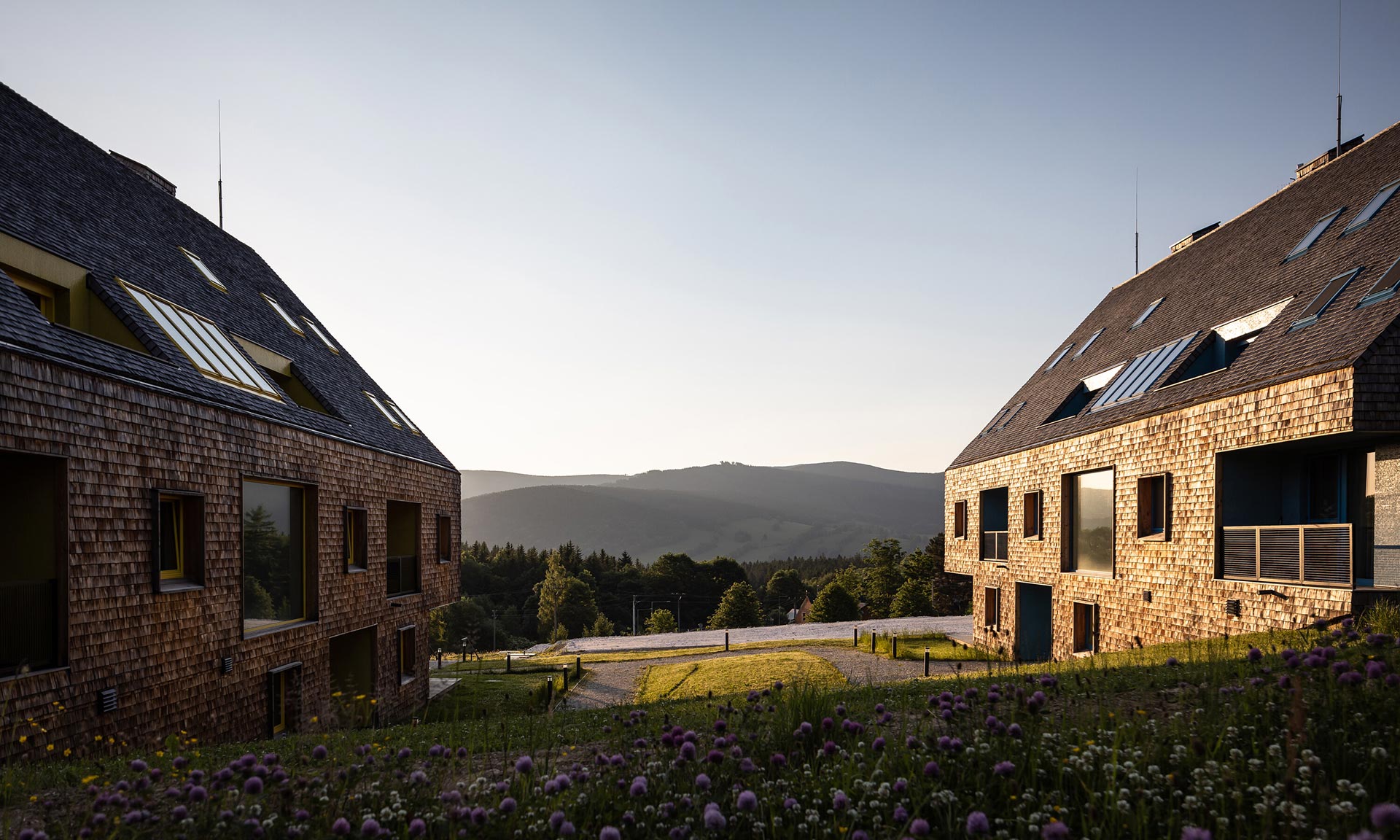 „Stavba je pojata v tradičních materiálech – s dřevěným obložením modřínový šindel pocházející z místních lesů, který je volnou parafrází fasád místních stodol, ale i štítů obytných staveb. Do kontrastu s přirozeně šednoucím obkladem jsou posazeny barevné lodžie, které stavbám dodávají barevný akcent a živost,“ dodávají.