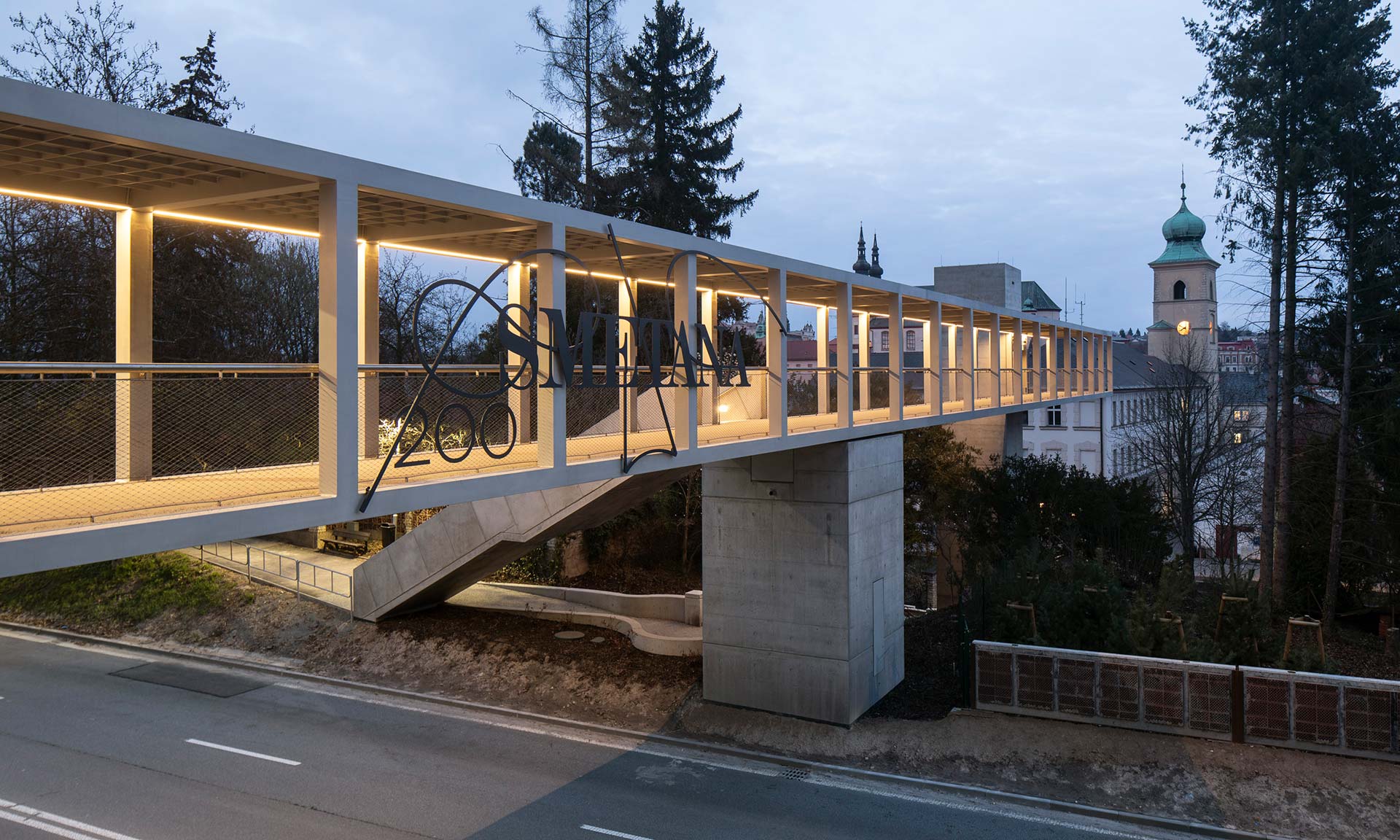 „Subtilní ocelová konstrukce je nesená masivními pilíři z pohledového železobetonu. Převýšený pylon výtahu je umístěn v ose původního schodiště a nese vlastní konstrukci lávky. Zároveň vytváří novou dominantu – věž v průhledu Ropkovou ulicí z náměstí. Střední pilíř přechází v nové betonové schodiště orientované směrem k cestě ke Smetanovu domu. Na západním předpolí je lávka osazena na opěru ve stávající opěrné zdi,“ uvádí architekti Lukáš Ehl, Tomáš Koumar, Ladislav Dvořák a Ladislav Šašek.