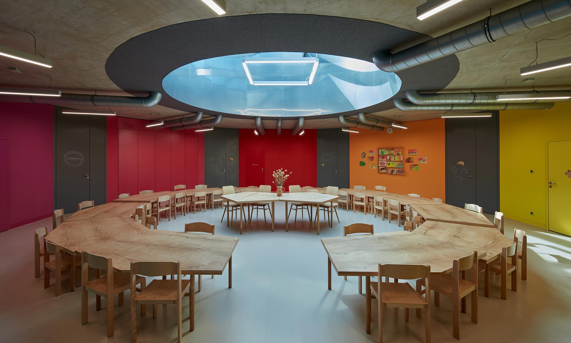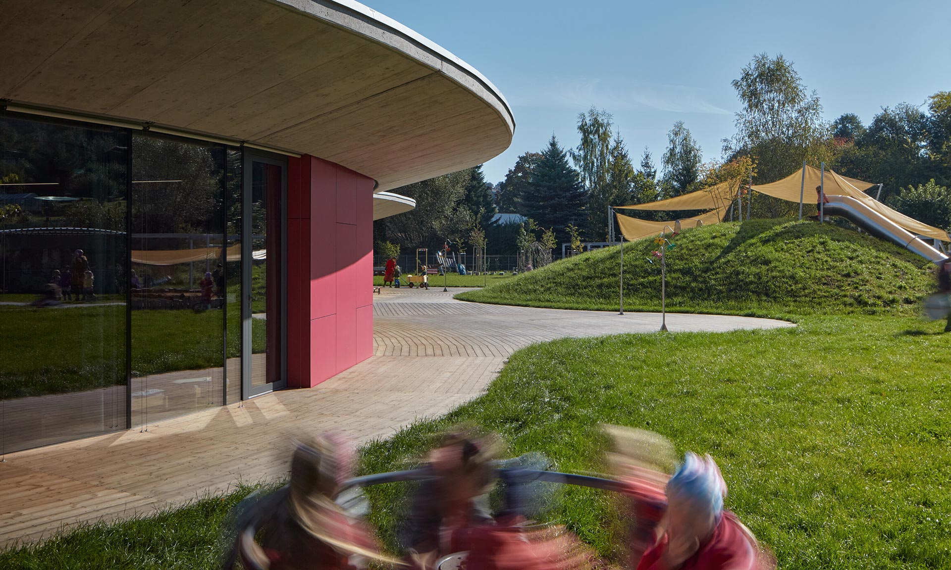 „Stavba zahrnuje hlavní objekt (4 třídy, kuchyň, zázemí), přístřešek pro odkládání kol a komunálního odpadu, pavilon se skladem nářadí a hraček, altán MŠ a altán WŠ. Hmota hlavního objektu odděluje plochu zahrady od plochy parkoviště a svým zaoblením minimalizuje vzájemné zastínění se sousedícími objekty,“ uvádí architekt Marek Topič, s nímž na interiérech spolupracoval Vratislav Ansorge.