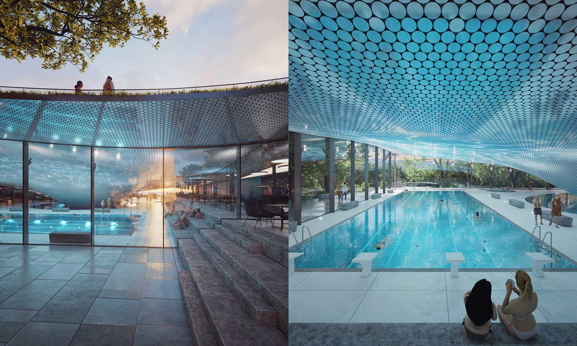 „Lázně si kladou za cíl aplikovat současné postupy znalosti z oblasti relaxačního lázeňství a doplňovat k tradičním provozům aktuálně prověřené metody, které zvyšují užitnost lázní a doplňují spektrum o chybějící funkce, které nejsou dosud pro veřejnost v Praze dostupné. Těžiště je postaveno na relaxační funkci celého areálu, nejde tedy primárně ani o sportovní komplex ani o čistě zábavní aquapark. V postcovidové době se do zájmu veřejnosti výrazně dostává zejména termoterapie jako jedna z vhodných a účinných preventivních metod pro zvyšování imunity, proto jsou procedury z oblasti saunování, otužování a balneologie integrovány do základního řešení bazénů jako rozvrstvení jejich teplot. Pro letní provoz je základním prvkem vnější pobytový bazén, který svým eliptickým tvarováním umožňuje všesměrný pohyb plavců a zvyšuje tak svou kapacitu. Navazující je dětský bazén s odpovídající hloubkou a dále kombinovaný střešní bazén s víceúrovňovým dnem. Na průniku mezi exteriérem a interiérem bazénové haly leží výplavový bazén, umožňuje plynulý přesun koupajících, bez nutnosti z relaxačního bazénu vystoupit a znovu venku do výplavového bazénu vstoupit,“ dodává.