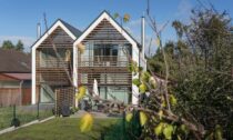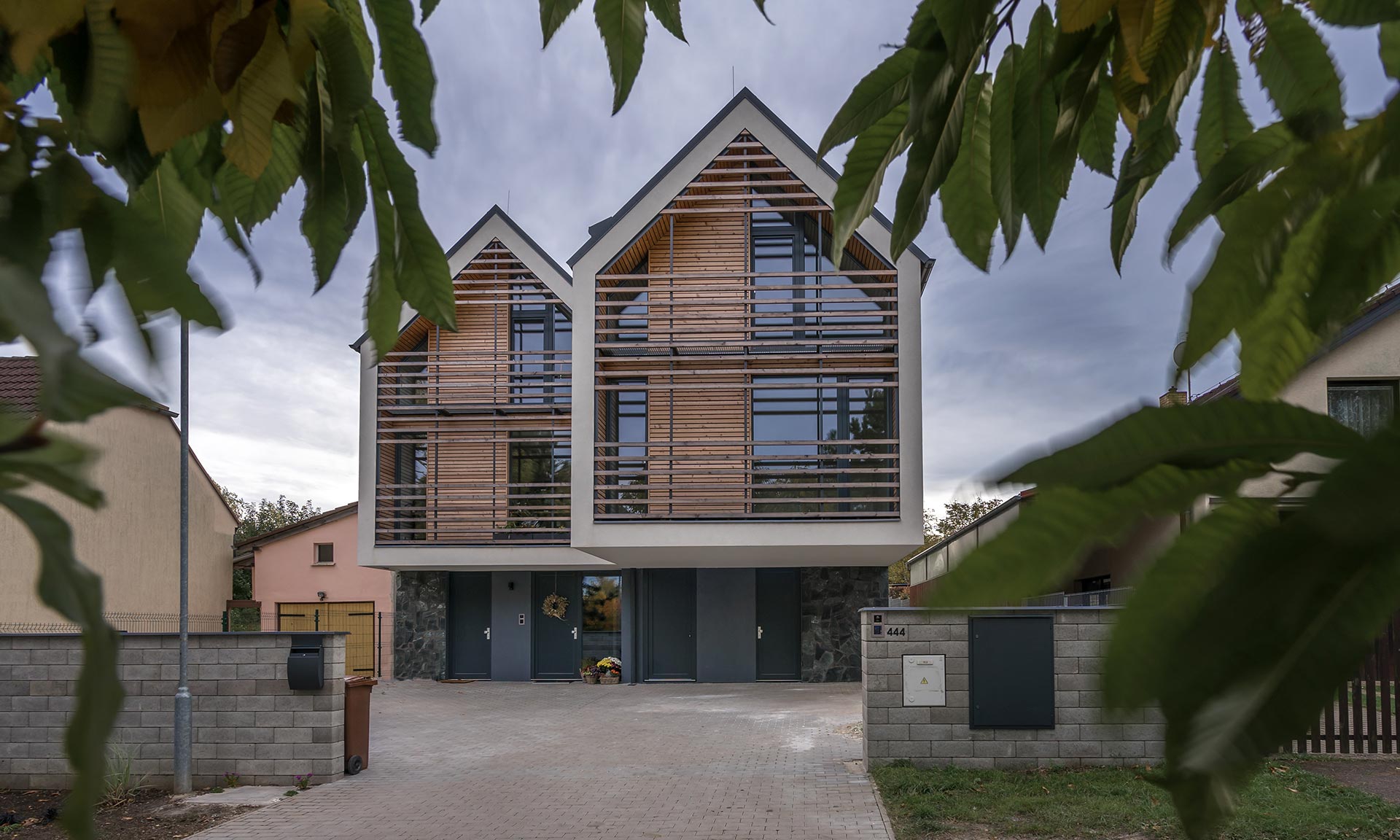 Místo starého malého domku na okraji obce Zbuzany ve Středočeském kraji vyrostl rodinný dvojdům, který stojí na relativně malém úzkém pozemku v podstatě u trati a obchvatu Prahy. Objekt je tvořen dvěma posunutými hmotami se stejným designem a klasickou sedlovou střechou. Obě čelní strany domu jsou zdobeny dřevěnými lamelami, jenž fasádu zjemňují.