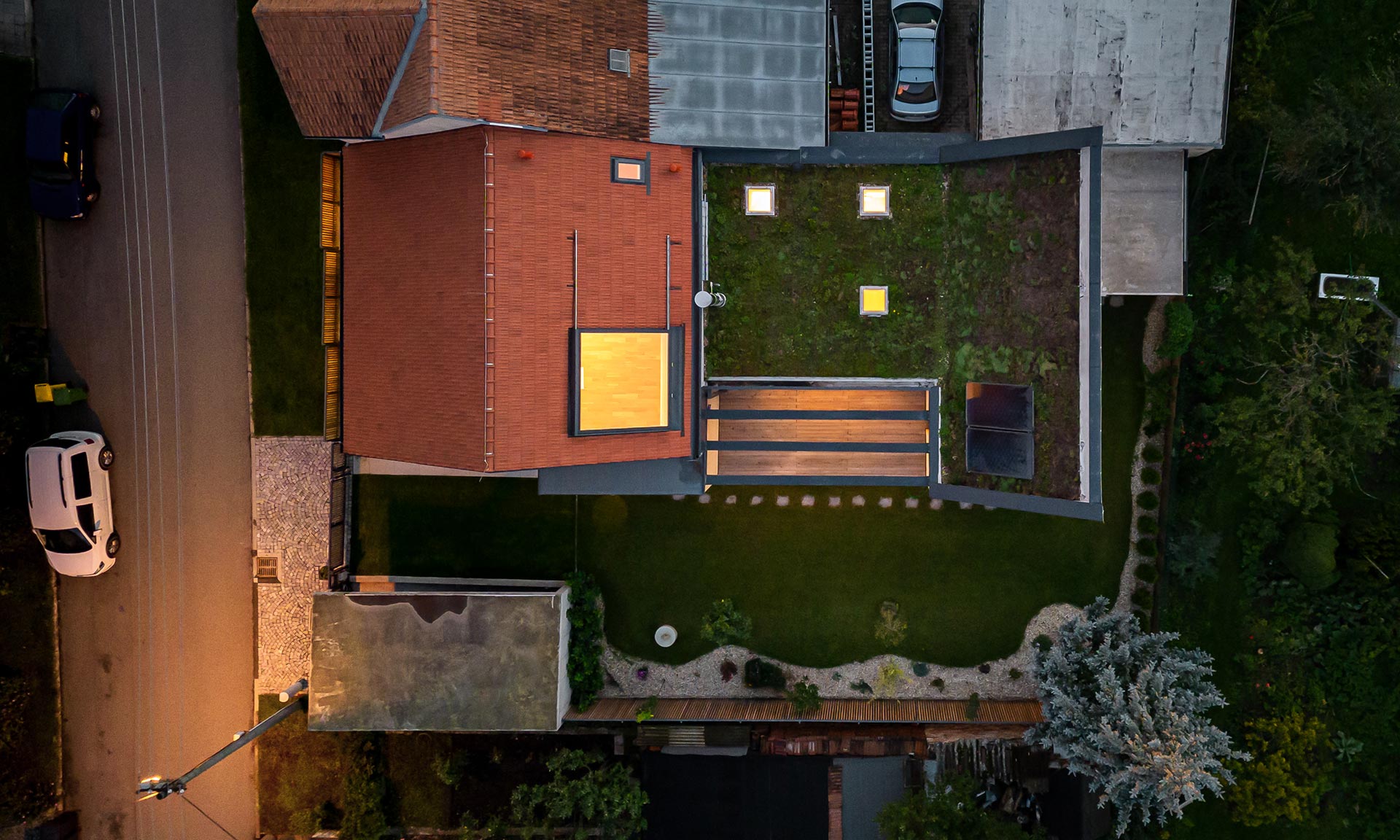 „Navrhli jsme tedy rekonstrukci části domu do ulice, s jedinou podkrovní místností, která slouží jako ateliér a má velkorysé střešní okno obrácené na sever, aby v místnosti byl dostatek rozptýleného světla. Směrem do zahrady jsme přistavěli druhý menší dům, kde je samostatná ložnice s vlastní koupelnou,“ uvádí architekti Tomáš Dvořák a Vojtěch Kolář.