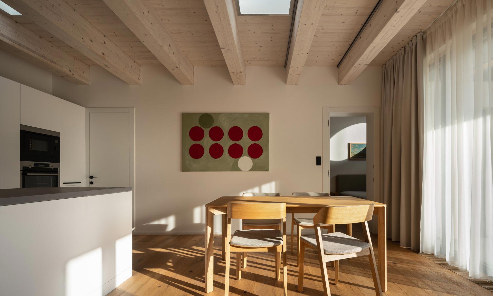 Na projektu je příjemná jeho nenucenost a snaha o venkovský charakter. I když se tu střídají tři druhy střech působí objekt kompaktně. Příjemná jsou kruhová okna, velké odsouvací okno ve střeše starého domu, zelená střecha u přístaveb i světlost interiéru dodaná použitými materiály. Vybavení je příjemné a nenásilné, sahalo se především po dubovém dřevě jako v případě stolu a židlí Merano od TONu.