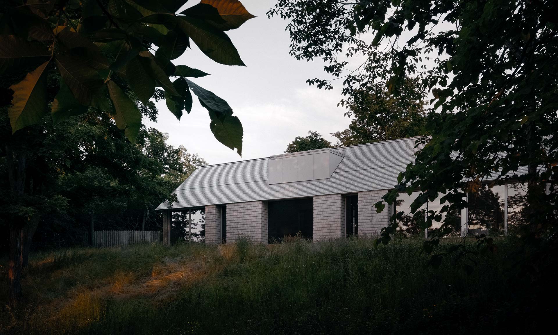 „Dům je zapuštěný do hřebene, opět chráněn zezadu a poskytuje výhled pod stromy. Velká okna na nábřeží rámují výhled na břeh, zatímco panoramatická okna na úrovni země směřující do louky nabízejí výhled na pole. Tento panoramatický pohled diváka spíše ponoří do krajiny, než aby jej umístil na její vrchol, což umožňuje pozorování vrstev přírody z půdy, kapradí, stromů a nebe. Větší vikýře přivádějí další světlo shora, někdy konvenčně přes svislou plochu a jindy prostřednictvím vodorovných analogů připomínajících světelný paprsek přes korunu stromu,“ uvádí architekti Andrew Hill and Jennifer Kudlats.