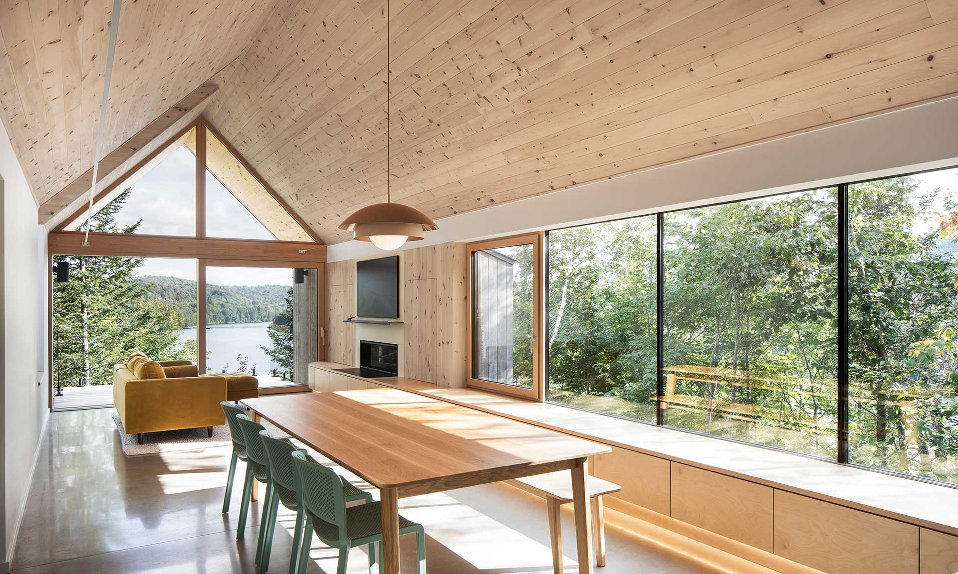 „Lehké materiály a minimalistické detaily vytvářejí v celém interiéru domu pocit prostornosti na efektivním půdorysu. Bílé stěny, betonové podlahy a světlé dřevo přispívají ke světlé a vzdušné atmosféře uvnitř. Hlavní obytné prostory se nacházejí v horní úrovni, která je z velké části otevřená a zaplavená denním světlem. Šikmý, dřevem obložený strop kopíruje tvar střechy venku a přitahuje pohled k dramatickému výhledu na její zakončení. Podobný efekt má i dlouhý pás prosklení podél jihozápadní fasády, který v zimních měsících nabízí panoramatický výhled na vodu. Pod oknem probíhá na zakázku zabudované posezení z překližky, které vytváří místa pro pohled do krajiny a propojuje kuchyňský poloostrov s domácím krbem v obývacím pokoji,“ dodávají k interiéru.