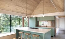 Vícegenerační rodinný dům Muskoka má stejným dřevem obložené stěny i stropy v interiéru