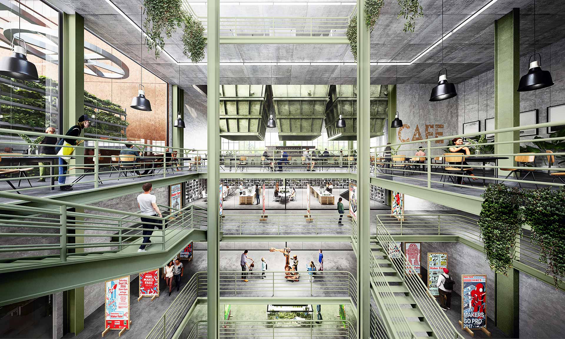 „Do severovýchodního rohu areálu jsou umístěny vysokoškolské koleje pro nedalekou VŠTE ČB. Konstrukčně se jedná o utilitární modulovou výstavbu, s možností etapizace. Studenti ocení výhledy do okolní krajiny s rybníky, zelené střešní terasy i studovny vzájemně propojené mezi sebou lávkami z recyklovaných konstrukcí dopravníků uhlí. Uvažováno je až o 250 lůžkách. Propojení s vědeckým a komunitním zázemím FabLabu přinese do areálu celoroční a celodenní život,“ dodávají k druhé nejzajímavější části areálu.