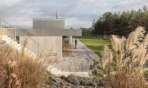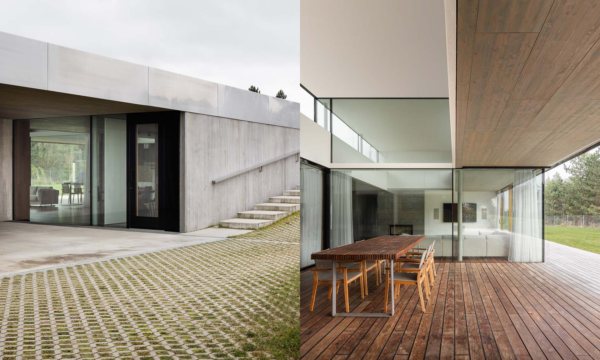 „Vchod do objektu se nachází v jeho západním rohu, který je zároveň jeho nejvyšší úrovní. Veřejná příjezdová cesta zde končí a pokračuje na pozemek jako soukromý vjezd. Parkování pro hosty se nachází za branou, na střeše vinného sklepa, s přímým vstupem na zahradní terasu domu. Příjezd a vjezd pokračuje na pozemek pohyblivou zatravněnou rampou a klesá na obytnou úroveň domu. Rampa plynule navazuje na hlavní vchod s krytým nástupem a parkovacími místy. Provoz domu je velmi výhodný, jednopodlažní. Kompozičně objektu dominuje horizontalita, s orientací velkých prosklených stěn místností jihovýchodním směrem k obytné terase a lesu. Rozhraní mezi terasou a interiérem není lineární. U obytné haly jsme vytvořili pravoúhlý meandr vstupující do interiéru domu. Obytná část terasy je tak intimně zapuštěna hlouběji do středu stavby, kde slouží jako plnohodnotná letní kuchyně s jídelním i obývacím posezením. Centrální obytný prostor se střešním oknem a jeho vnitřní a vnější části jsou klíčové pro využití domu během stále teplejších letních období,“ uvádí architekti Braňo Hovorka a Martin Paulíny.
