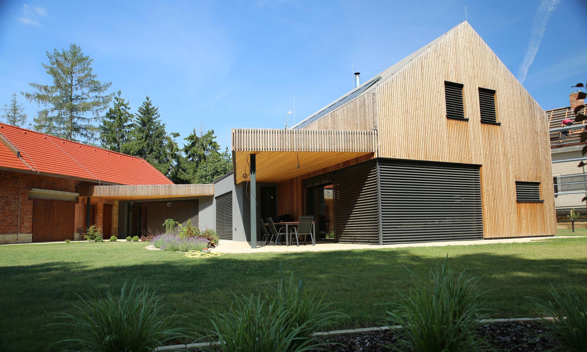 „Aby bylo dosaženo tvarové čistoty, která nebude konkurovat stávajícímu stavení, byl dřevěný obklad použit i na sedlové střeše nového objektu. Jižní a východní fasáda je doplněna o předstupující zastřešení, jež slouží jako krytý vstup do domu a stínění jižní fasády. Stávajícímu domu byl ponechán venkovský vzhled, kde byla přiznána konstrukce ve svém surovém vzhledu. Střešní krytina byla ponechána z pálených tašek. Celý dům lemují zpevněné pochůzné chodníčky, kde se střídá materiál betonu a kamene,“ dodávají.