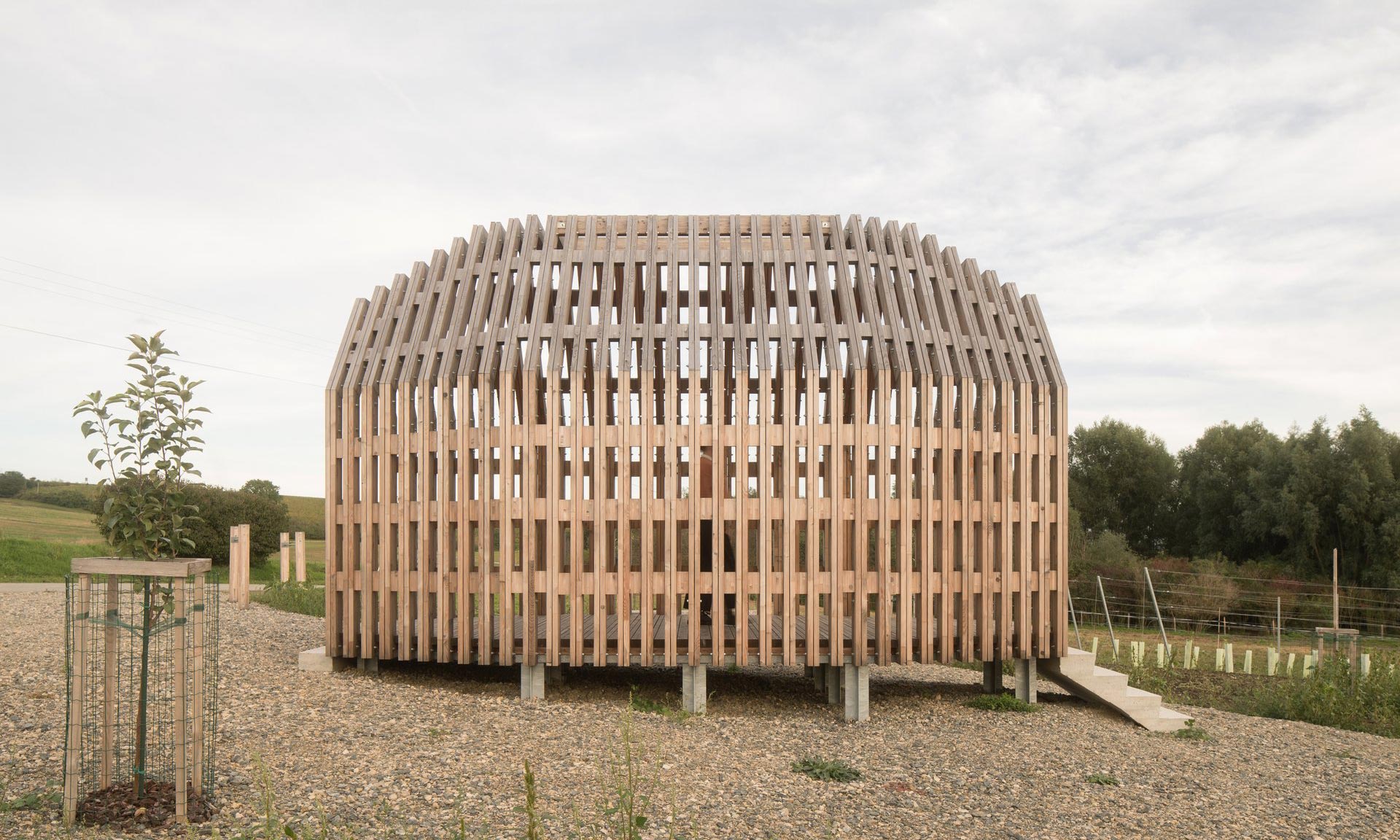 „Konstrukčním materiálem stavby je nenatírané dřevo. Konkrétně modřínové BSH hranoly, spojené ocelovými kotevními plechy a svorníky do dvou rámů. Aby se docílilo lehkosti a částečné transparentnosti altánu, jsou rámy řazeny s mezerami. Princip otevřenosti je umocněn vynecháním středových částí rámů v hřebeni střechy. Střešní otvor rámuje pohled na nebe a nepřímo odkazuje na smysl celého areálu: využití obnovitelných zdrojů energie. Objekt pocitově levituje nad mírným svahem, díky ocelové konstrukci osazené na zemních vrutech. Konstrukce byla zvolena z důvodu zajištění stability celé stavby. Díky tomu, že je altán průchozí a nevytváří uzavřený prostor, připomíná bránu do jiného světa,“ dodávají.