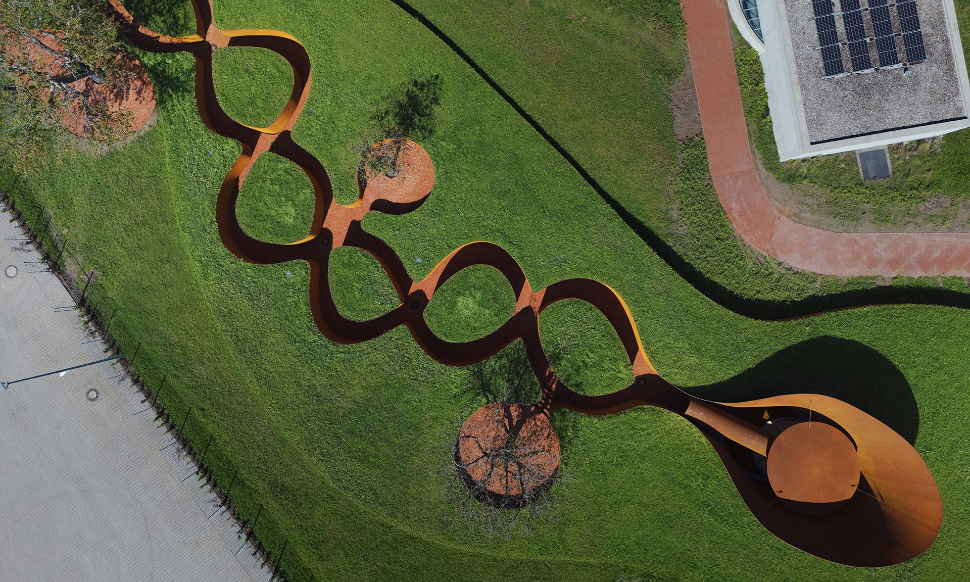 Klikatící se stezka je částečně zapuštěna do zahrady a prochází okolo stromů v různých úrovních. Měkký povrch a kovové stěny mají efektní čistý design, kdy okolní tráva přechází až do okrajů a stezka tak působí jako vyřezaná v půdě. A tím to však nekončí. Okolo stezky je rozeseté potrubí, kam se speciálním audio systémem rozeznívají zvuky gongů. Gong je pak i na konci stezky v organicky tvarované stavbě jako jediné vystupující nad zemský povrch. Uvnitř je možné posedět u velkého gonzu. Celá stavby je vyrobena ze speciální rezavé oceli XCarb věnované jednou z ocelářských společností.