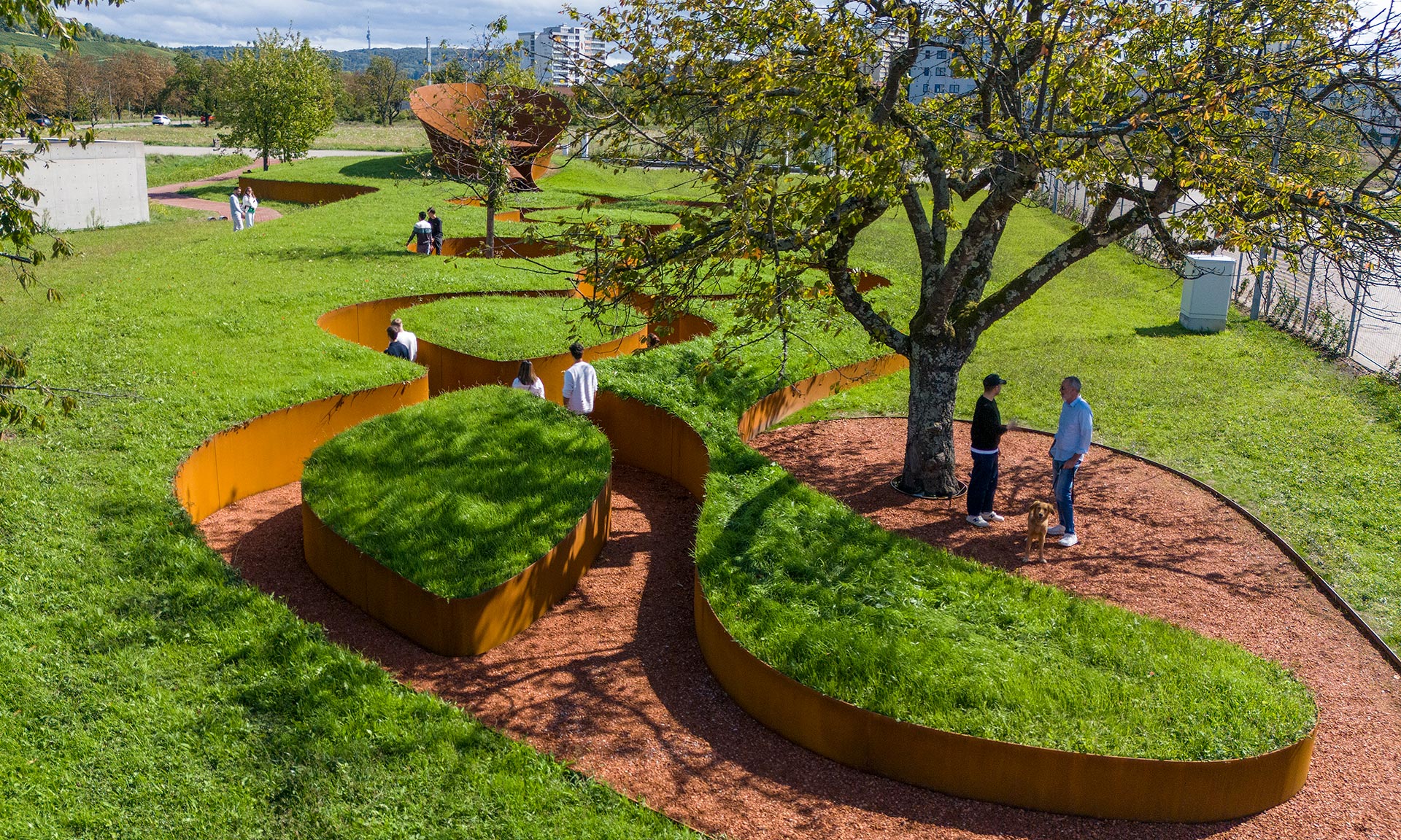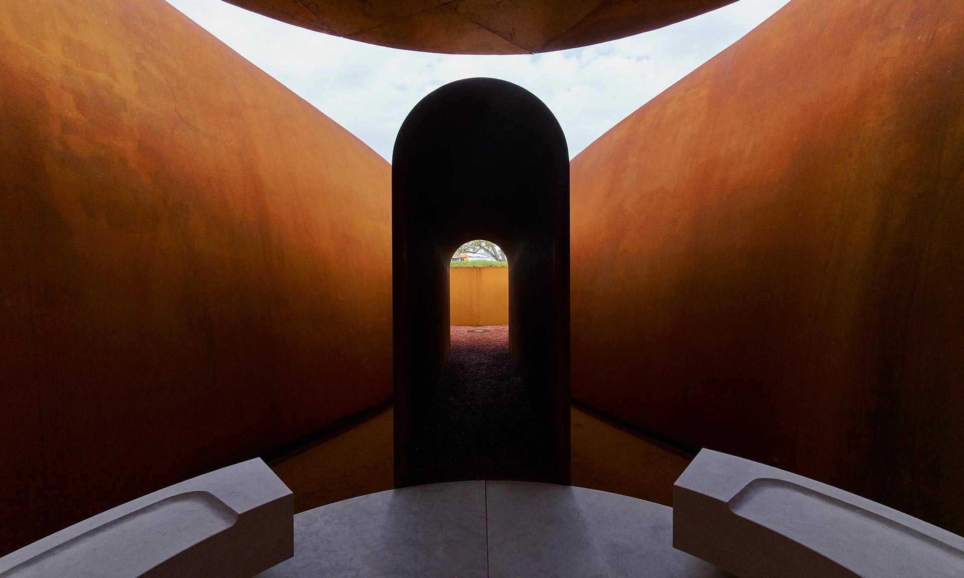 V německém Weil am Rhein stojící Vitra Campus je sice průmyslový areál, ale už dávno se stal veřejným parkem plným zajímavé architektury od světových architektů a designérů. Letošním přírůstkem je Doshi Retreat, což je bludiště částečně zapuštěné do zahrady, na jehož konci je drobný objekt s posezením a možností rozjímání. Stavbu z kortenu před svou smrtí navrhl slavný indický architekt Balkrishna Doshi.