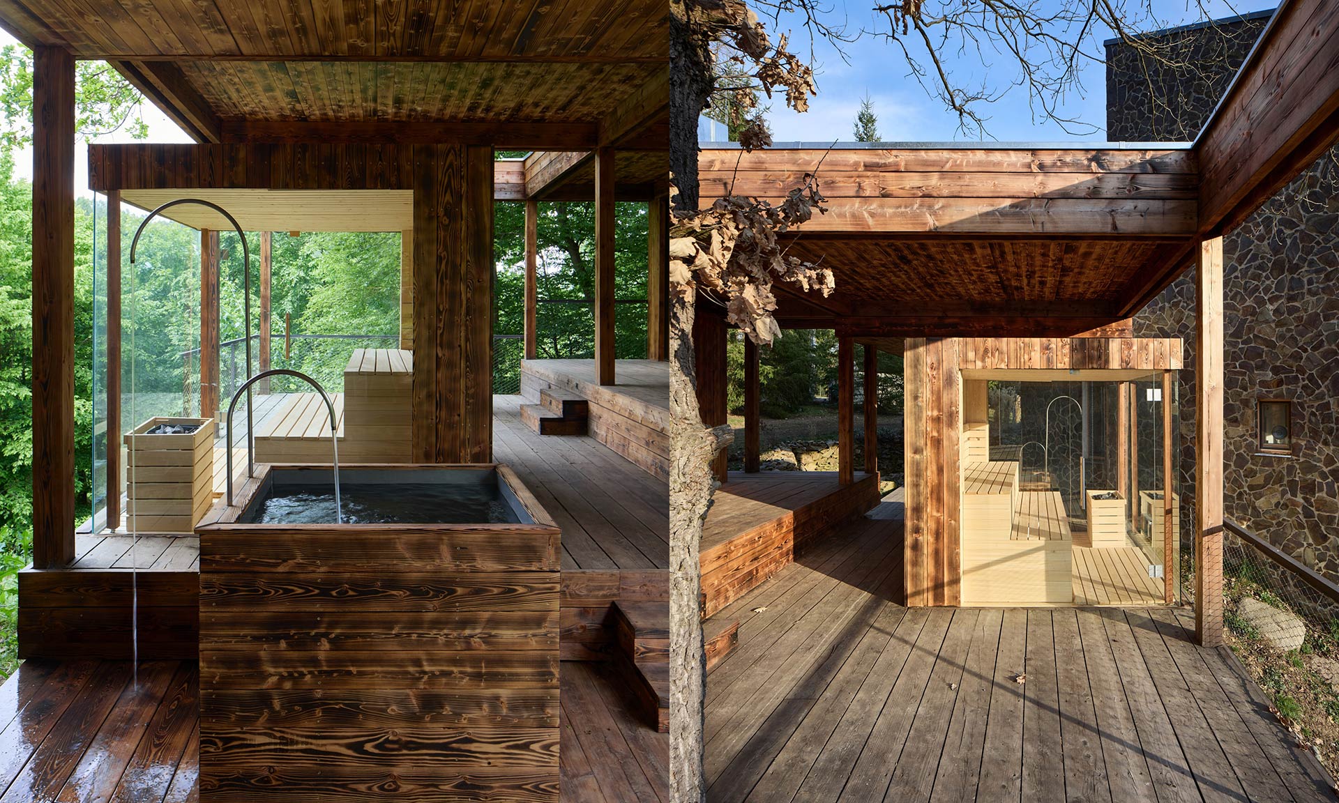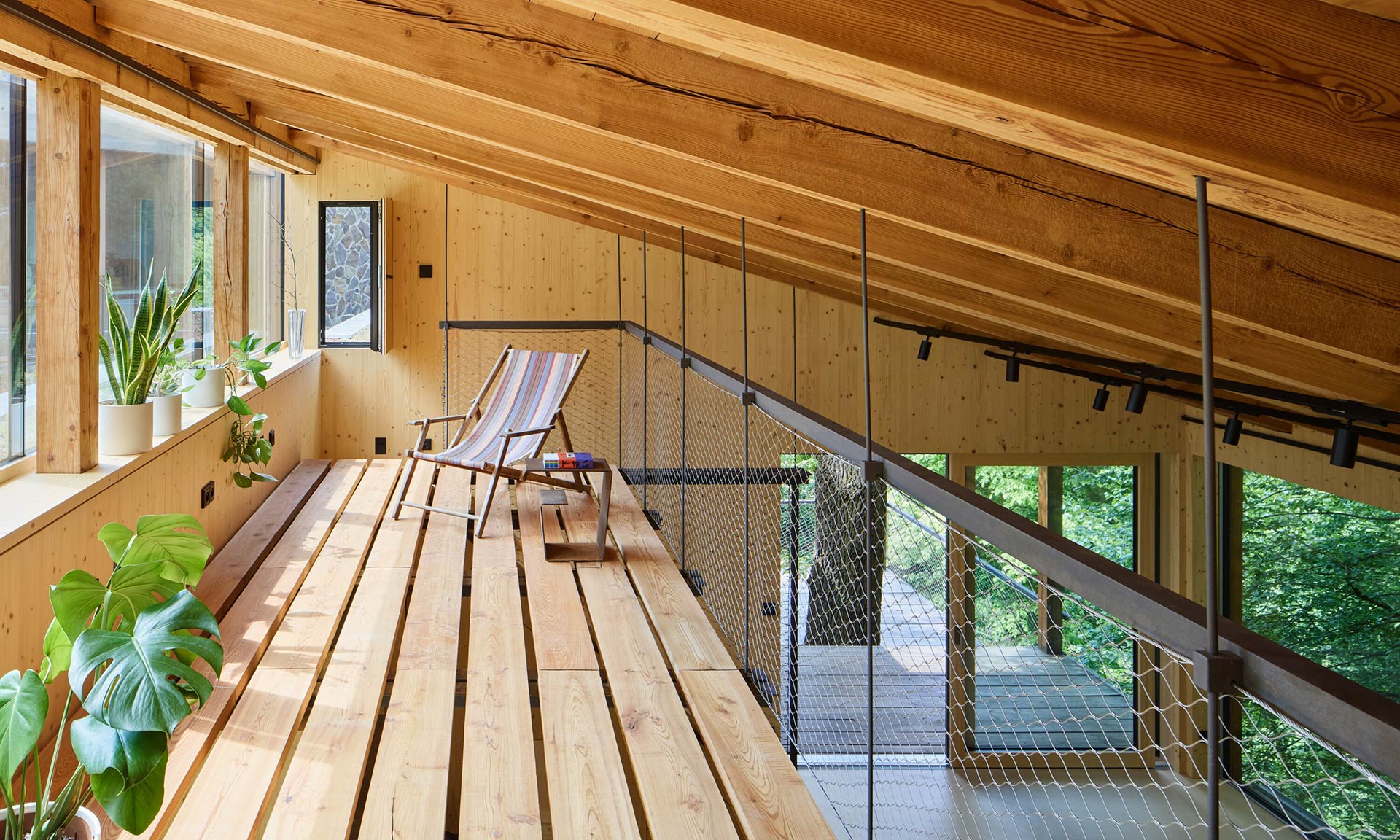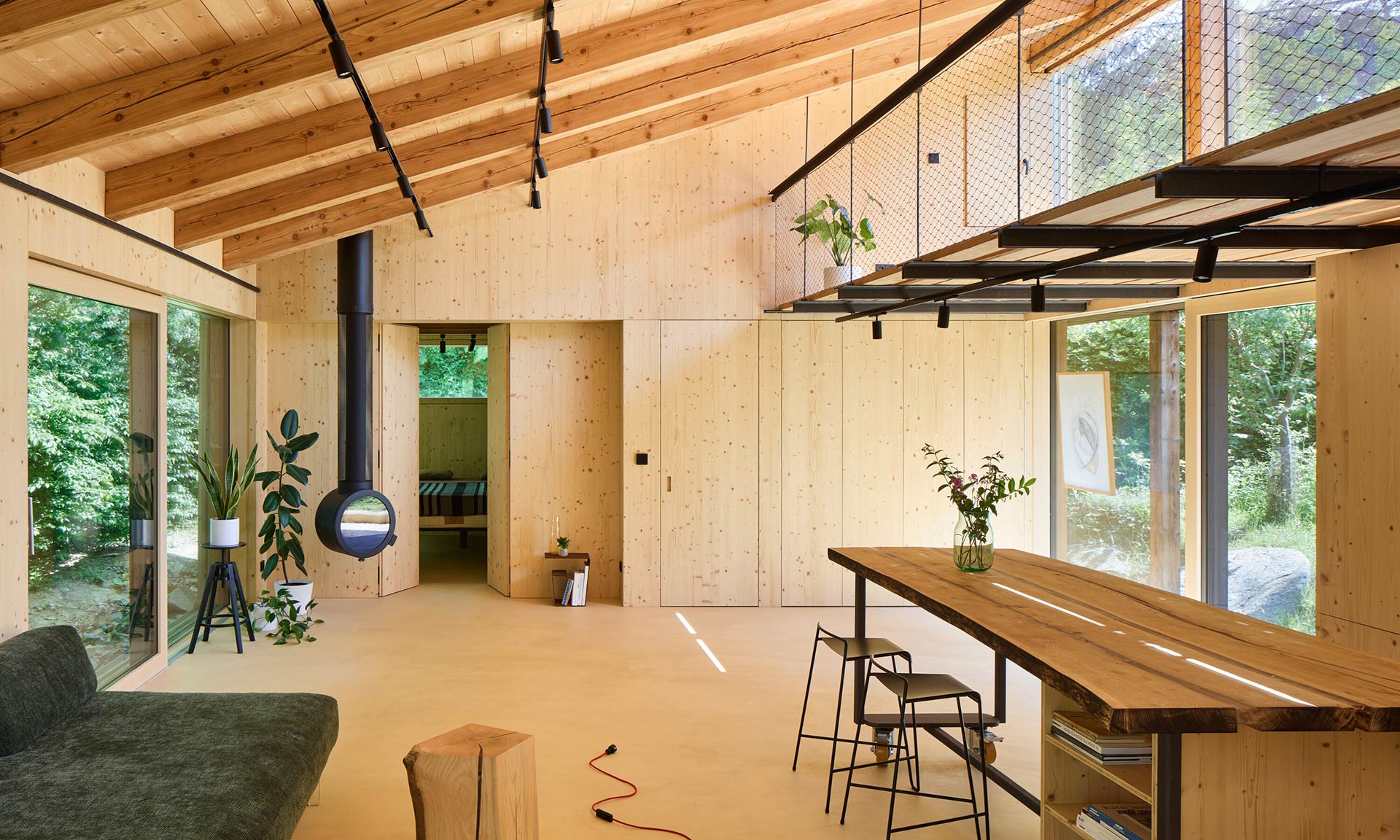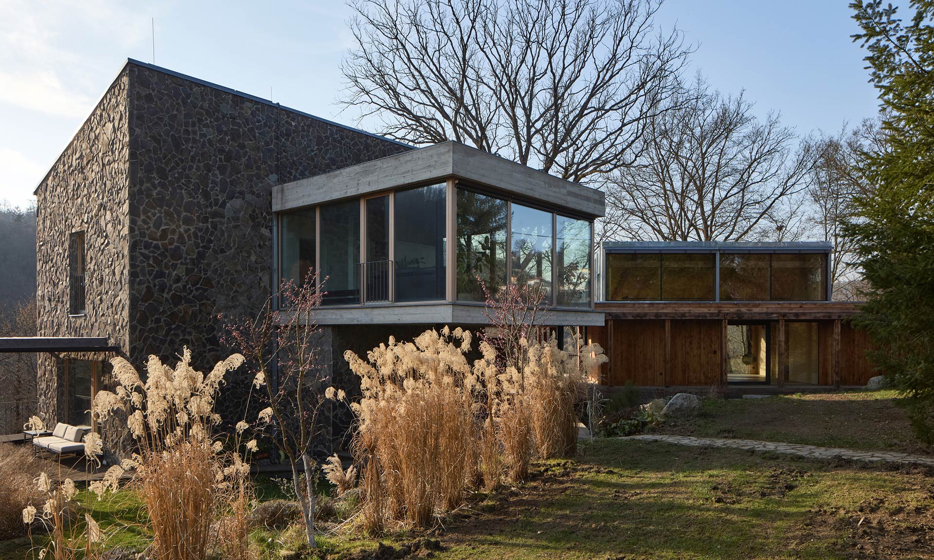 Celková užitná plocha domu je relativně malých, ale dostatečných 72 metrů čtverečních. Interiéru dominuje dřevo, které se do míst i k cílenému využití skvěle hodí. Navazuje na velmi pohledově hřejivý exteriér, kde se kombinuje kámen, sklo a dřevo. Dobře řešená je i bezprostřední zahrada okolo domu, kde jsou vzrostlé trávy, velké i malé kameny, dřevěné terasy a další zcela přirozené prvky.