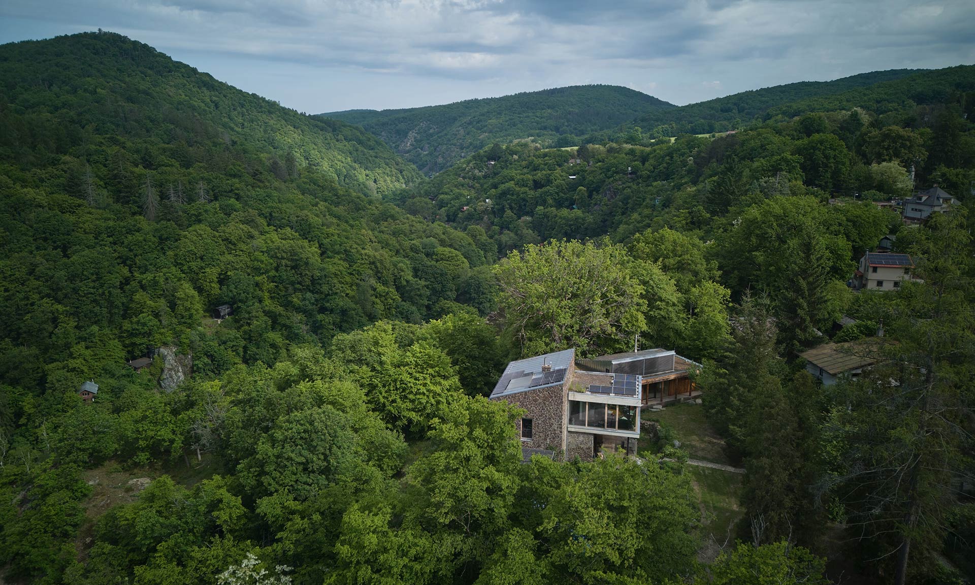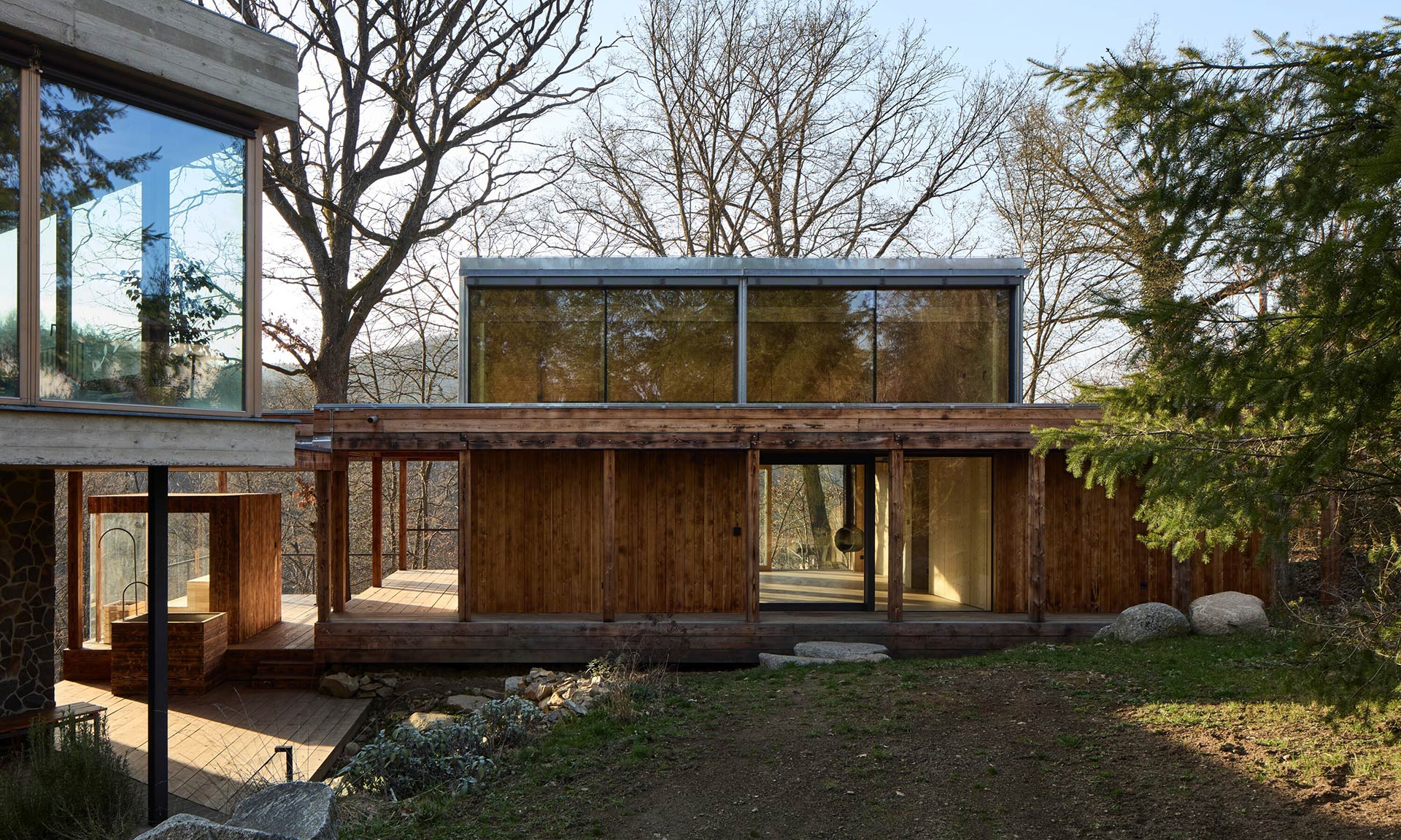 „Při hledání vhodného místa a objemu jsme respektovali klínovitý tvar pozemku, konfiguraci terénu, stávající vzrostlé stromy a ukázalo se, že je důležité, aby byl zachován výhled ze zahrady domu do údolí Sázavy a na vrchol Medníku. Přístavbu jsme navrhli jako samostatně stojící objekt na pomezí lesa a zahrady, který je se stávajícím domem spojený krytou terasou, do které jsme začlenili vzrostlý dub stojící v bezprostřední blízkosti stavby. Směrem do zahrady byl navržen krytý ochoz. Stavba je otevřena na terasu a do údolí posuvnými okny, proti stávajícímu objektu je nastaveno uzavřené nároží. Do ateliéru je vložena jednoduchá visutá galerie. Tvarosloví přístavby navazuje na stávající dům,“ uvádí architekt Miloš Munzar.