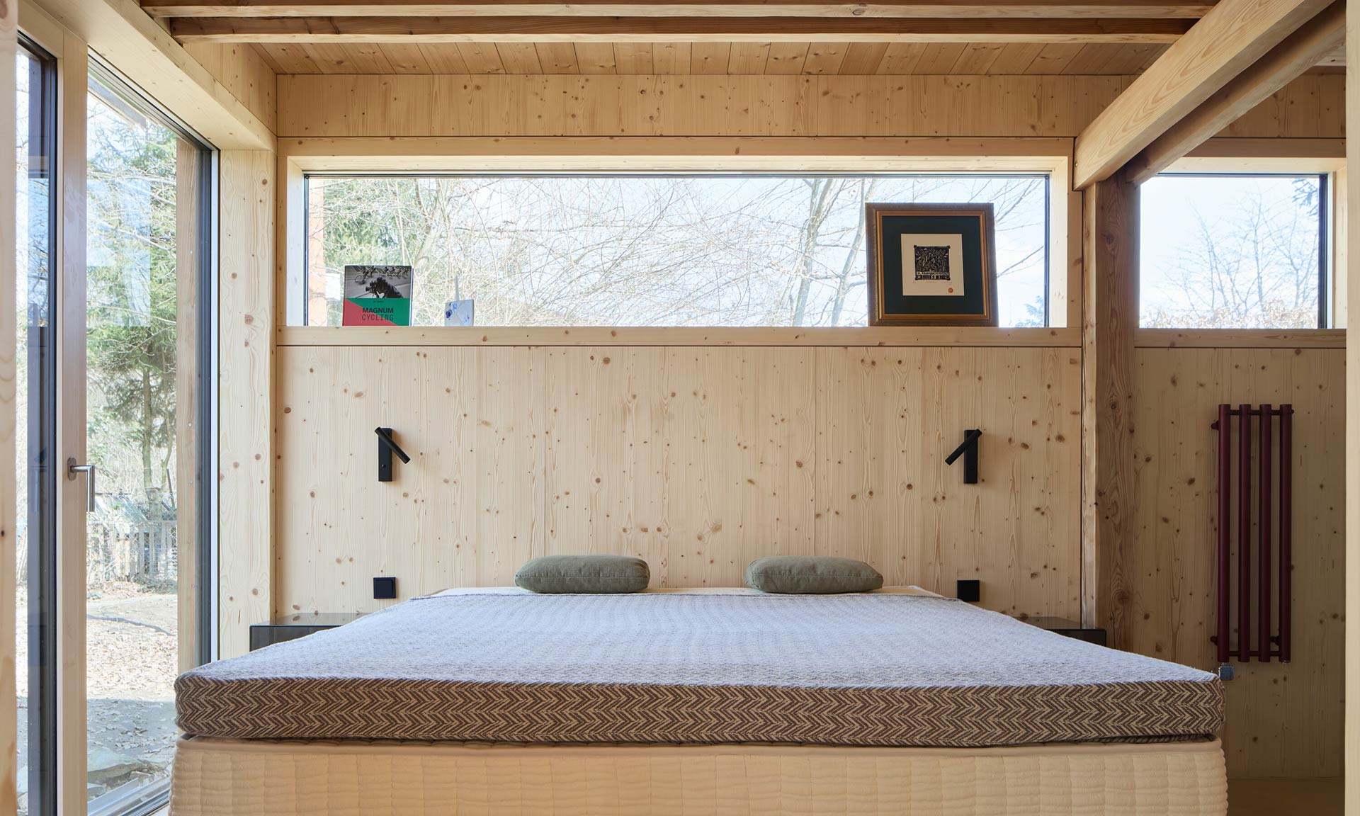 „Konstrukční řešení vychází z možností klienta provádět stavbu částečně svépomocí. Založení stavby na mikropiloty zajistila specializovaná firma. Další konstrukce, nosný ocelový rám a navazující vrchní dřevostavba byla provedena ve svépomocném režimu. Dům je obložen modřínovým opalovaným obkladem. Interiér stavby je zpracován ve smrkové biodesce s integrovaným nábytkem a úložnými prostory,“ dodává.
