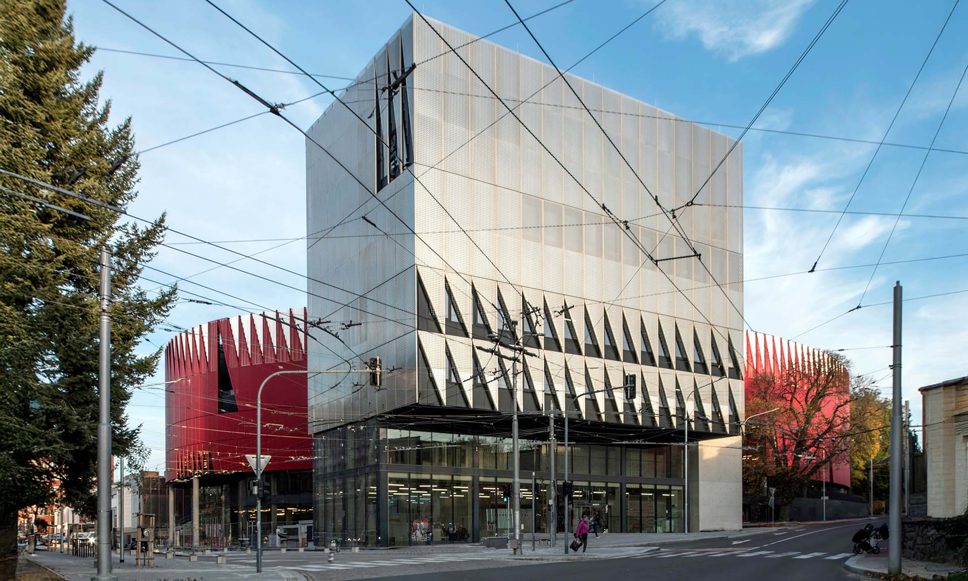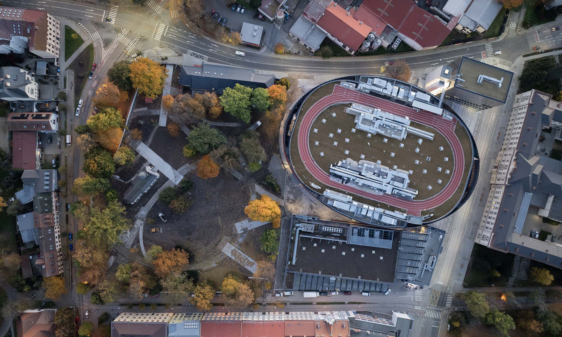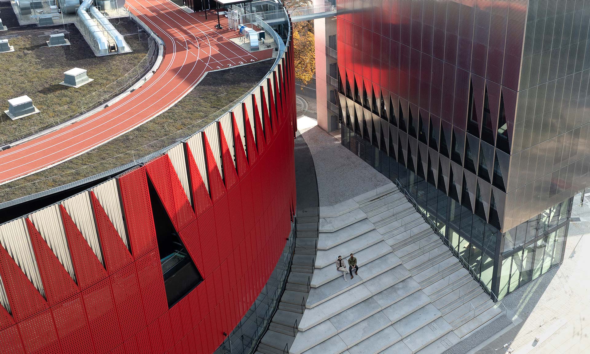 „Multifunkční komplex ohraničují čtyři objekty – aréna ve tvaru elipsy, nárožní budova, původní tréninková hala Zimáček a provozně-technické zázemí. V suterénu jsou všechny propojeny tak, aby mohly flexibilně reagovat na různé provozní scénáře od sportovního tréninku po koncert klasické hudby. Nárožní budova rozšiřuje každodenní využití – do přízemí byl umístěn fanshop a síň slávy, do dalších pater restaurace, ubytovna pro sportovce a hosty, posilovna a tělocvična v nejvyšším podlaží. To je lávkou propojené s běžeckým oválem na střeše arény, který bude sloužit veřejnosti a školám v okolí, které sportovní zázemí postrádaly. Propojení obou nových budov v uliční úrovni je zapuštěno do terénu a vizuálně tak nepřidává na zastavěném objemu. Naopak střecha propojovacího tunelu, ve kterém je umístěna síň slávy, podpírá velkorysé pobytové schodiště. To důmyslně vyrovnává šestimetrový výškový rozdíl mezi novou pěší zónou na ulici Tolstého a parkem Smetanovy sady. Vzniklý veřejný prostor může kromě setkávání hostit veřejné projekce událostí uvnitř arény a další společenské aktivity pod širým nebem,“ dodávají k druhé stejně nepřehlédnutelné budově.