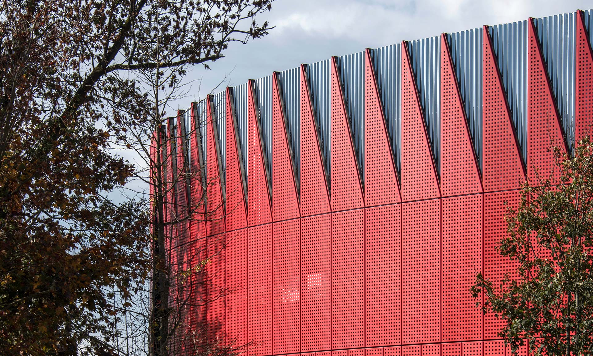 „Výrazná barva i trojúhelníková koruna fasády odkazují ke gotické tradici Jihlavy, symbolům Vysočiny a hokejovému klubu Dukla. Emblematická červená, barva klubu i města, se propsala nejen do vnějších podoby arény. Symbolická je i její silueta – špičky trojúhelníků kopírují ostré vertikály gotických památek i ostny ježka na znaku města. Opláštění arény tvoří hliníkové panely s drobnou geometrickou perforací, která jí dodává lehkost, zajišťuje přirozené provětrání a vytváří hloubku. Jednotlivé panely je možné adoptovat, přidat na ně své jméno nebo vzkaz a stát se navždy nedílnou součástí stavby. Ikonické průčelí tak namísto neprostupné bariéry tvoří osobité propojení místních s architekturou. Večer se horní špičatý prstenec rozzáří díky osvětlení, které mění intenzitu i barvu a napínavou atmosféru přenáší zevnitř i ven. Fasáda tak není jen obalem, ale živým médiem, který vede dialog mezi děním uvnitř a bezprostředním okolím, městem a jeho lidmi i návštěvníky,“ uvádí k architektuře budovy její autoři.