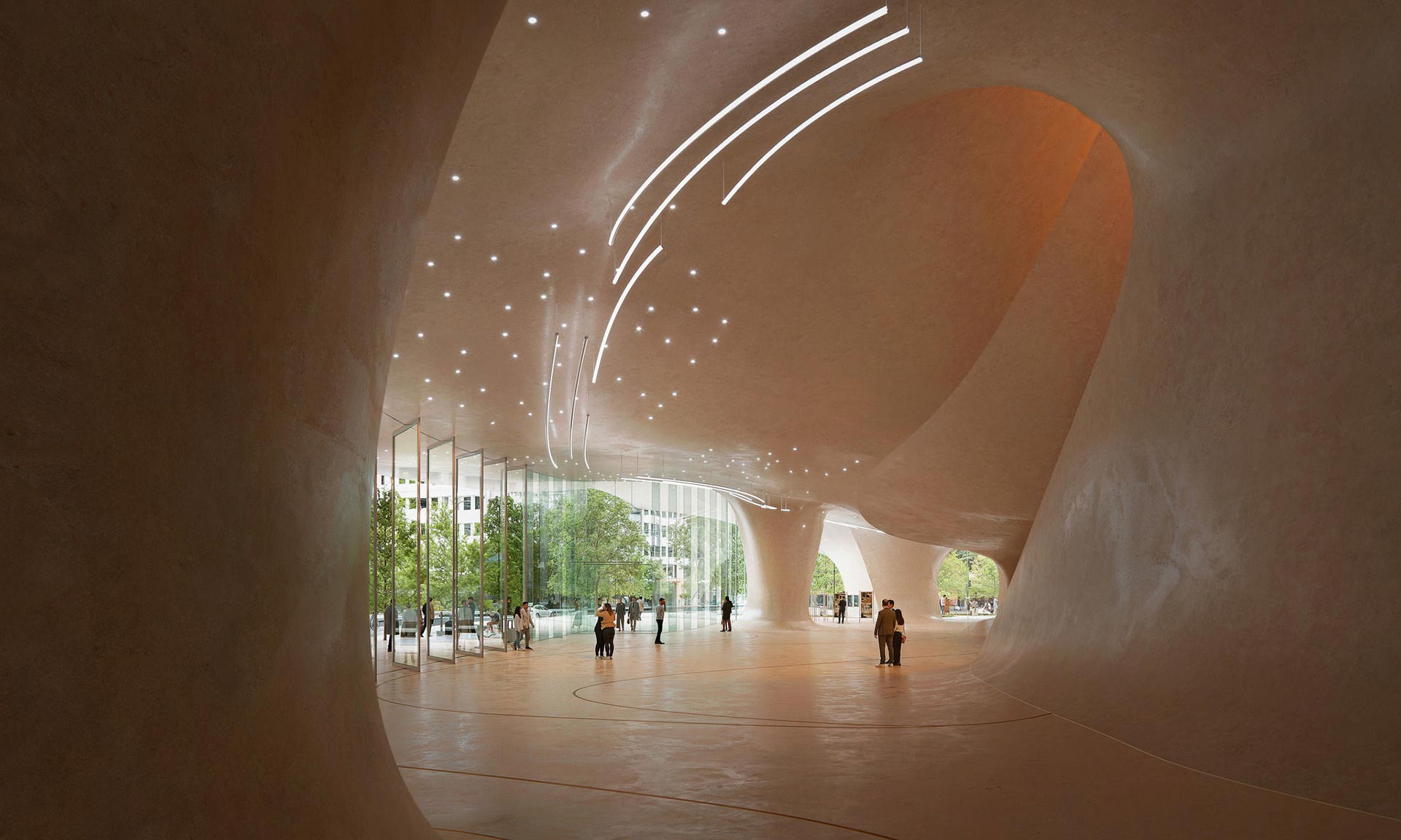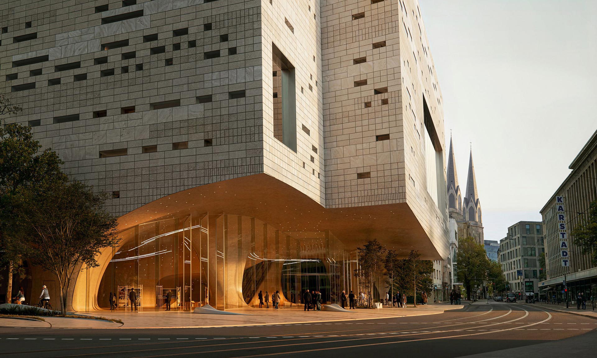 „Stejně jako si Rýn během milionů let vyryl svou klikatou cestu přes Porýní a vytvaroval sedimentární základ, na kterém je postaven Düsseldorf, je přízemí nové opery koncipováno jako erodovaná jeskyně: organický, otevřený prostor, který se stává novou kulturní arénou města. Tento vyřezávaný design otevírá přízemí ze všech stran, vytváří velkorysé propojení mezi operou a jejím městským okolím a zve všechny, aby se zapojili do jejího obsahu,“ dodávají k návrhu.
