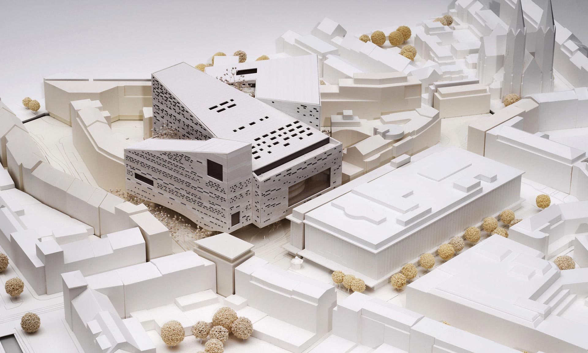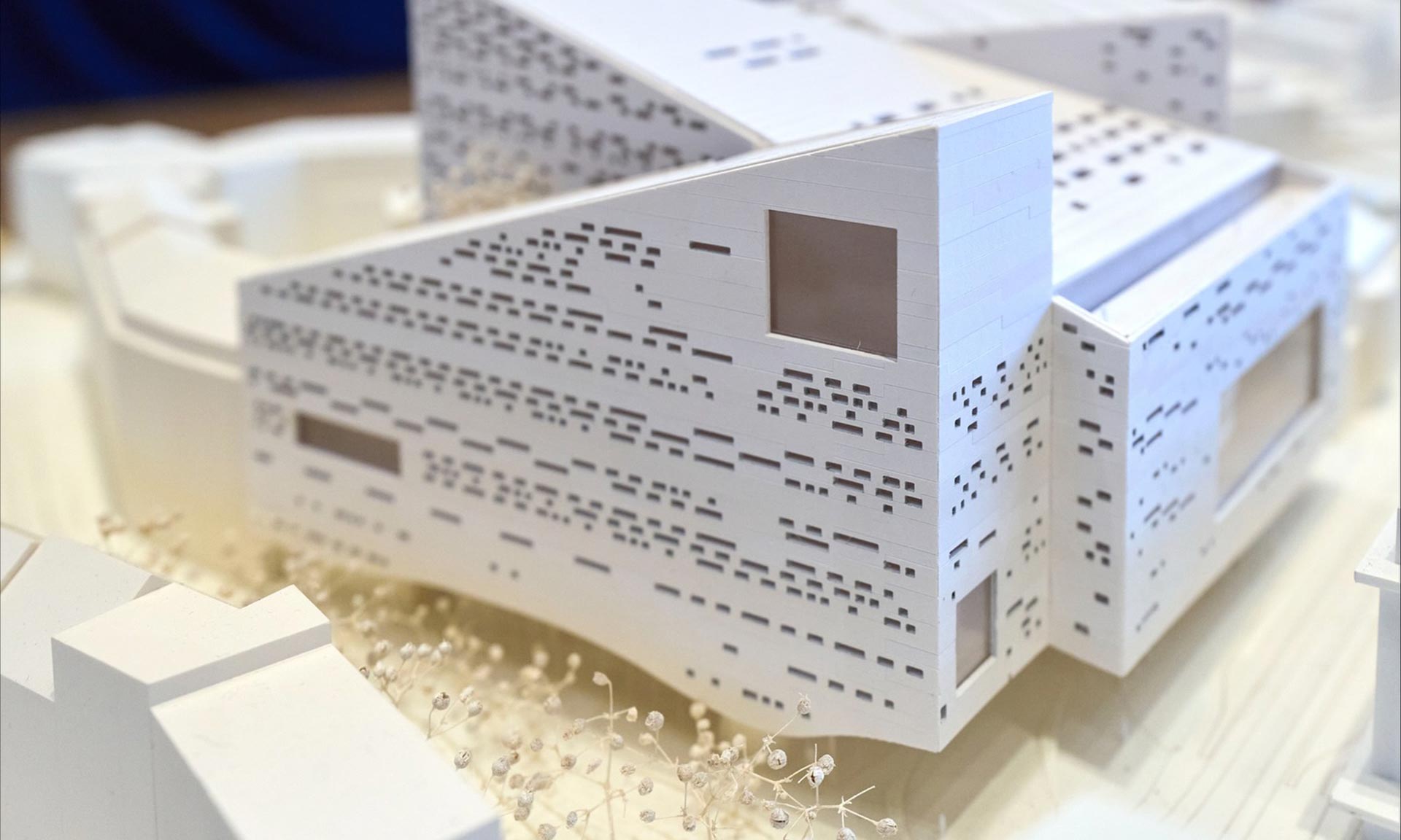 „Rozdělením hmoty budovy na tři asymetrické trapézové segmenty a zavedením chodníků v přízemí umožňuje návrh pronikání denního světla a podporuje účast veřejnosti na kompaktním centrálním pozemku. Návrh, který byl jednomyslně vybrán 25člennou porotou v prestižní soutěži Opera House of the Future, se nakonec stane sídlem Hudební knihovny města Düsseldorfu a Hudební školy Clary Schumannové, kromě Deutsche Oper am Rhein,“ uvádí architekti.