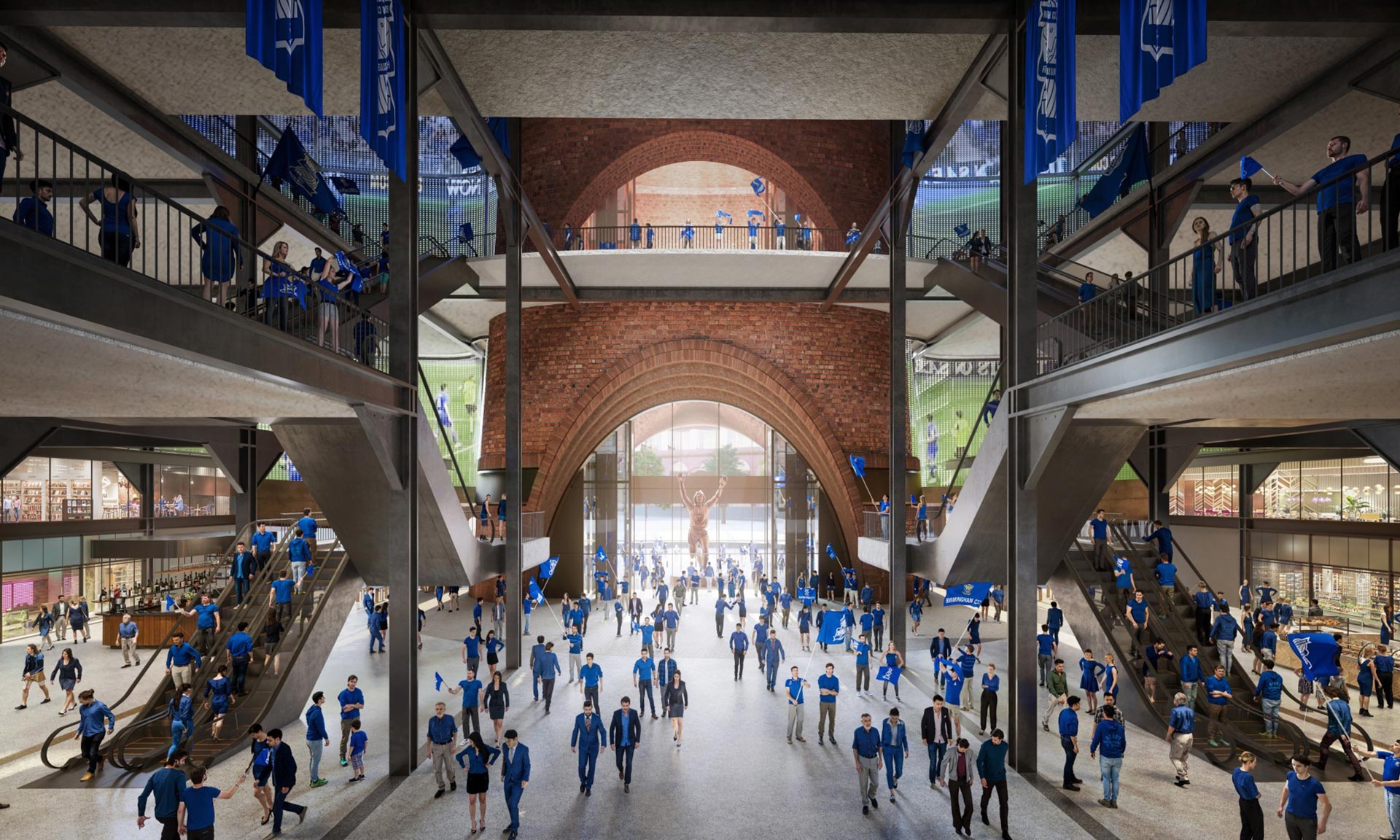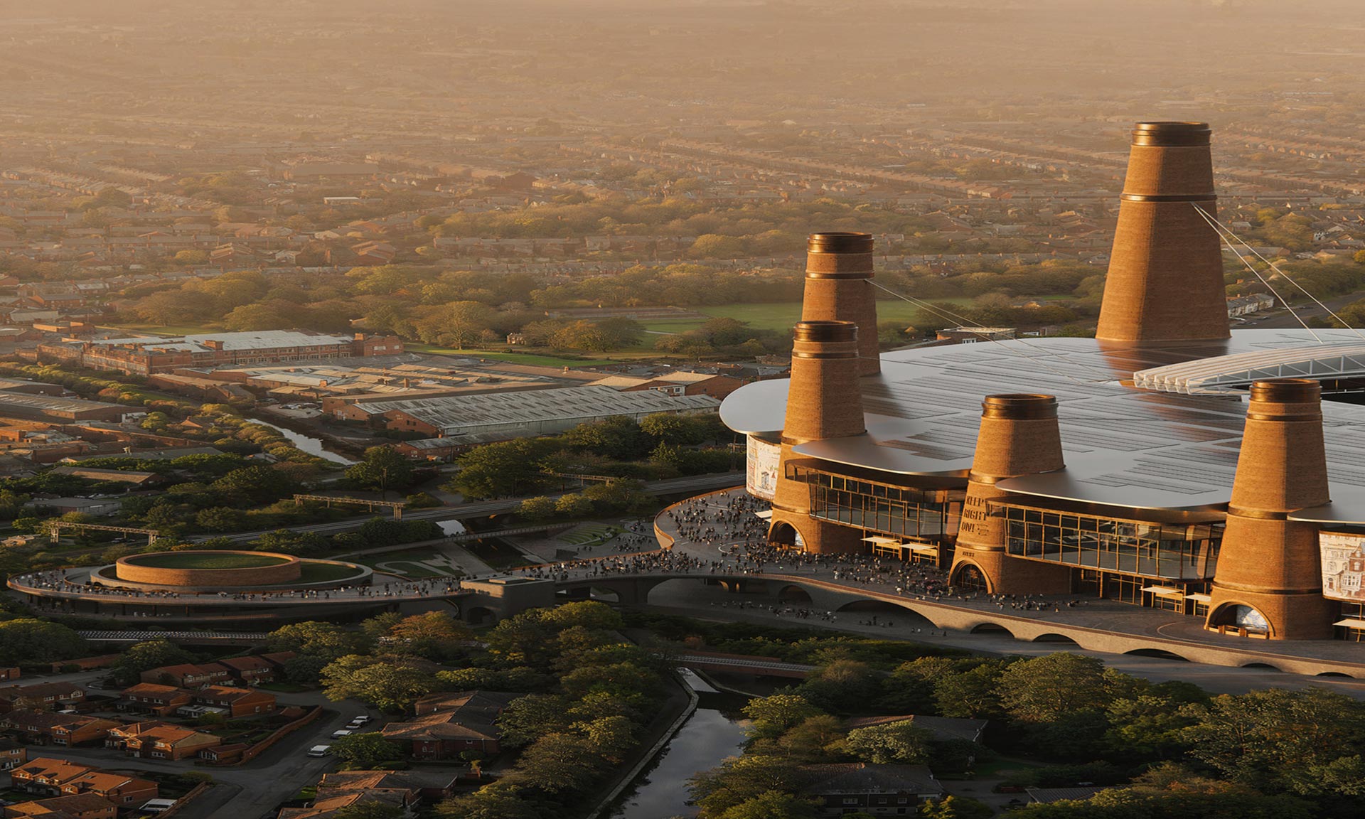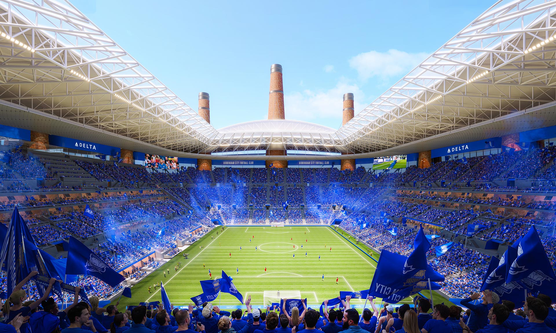 „Jádrem konceptu je 12 vysokých komínových konstrukcí, inspirovaných dlouhou historií výroby cihel v této lokalitě. Konstrukce, které jsou v maximální možné míře vyrobeny z recyklovaných cihel, přímo podpírají střechu a slouží k několika účelům. Vytvářejí siluetu, která spojuje stadion s průmyslovou minulostí Birminghamu, obsahují výtahy a schodiště a jsou součástí pasivní ventilační strategie stadionu. Komíny jsou navrženy pro optimální akustiku a budou směrovat zvuk z hlediště nahoru, přičemž zabrání hlukovému znečištění v okolí. Jeden z komínů bude také obsahovat výtah, který dopraví návštěvníky do nejvyššího baru v Birminghamu s výhledem na město a působivým zážitkem vyprávějícím příběhy o minulosti města,“ dodávají k projektu, jehož výstavba má začít v roce 2026.