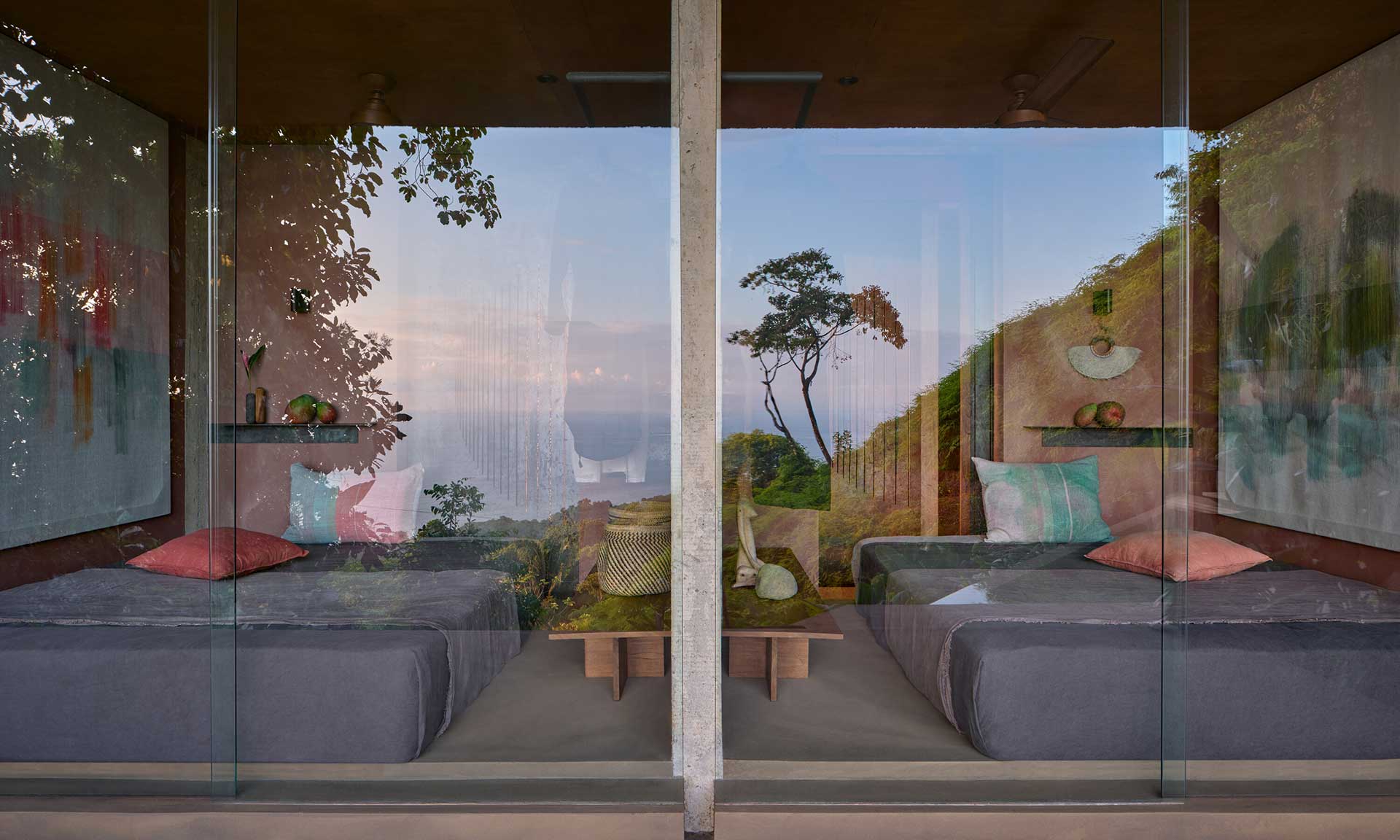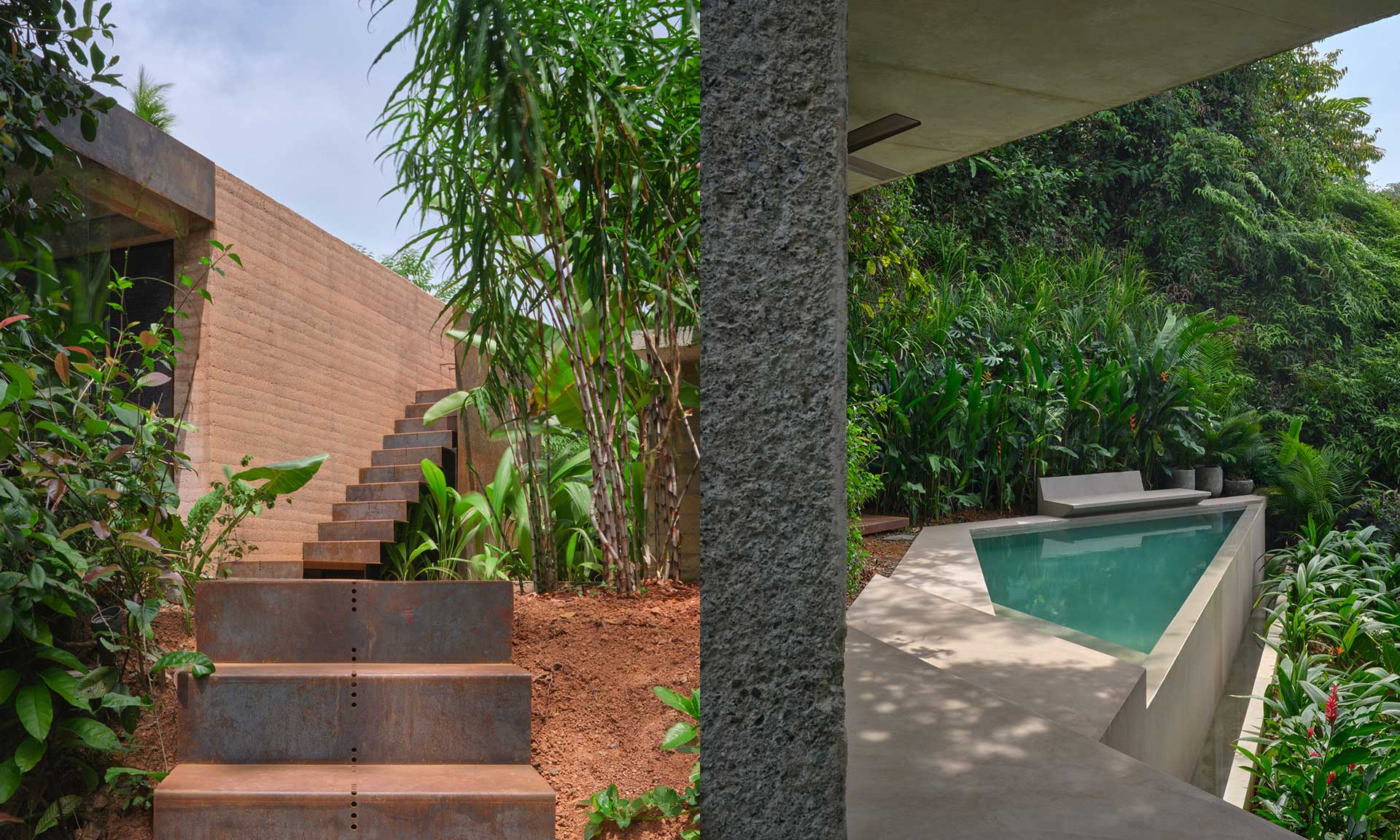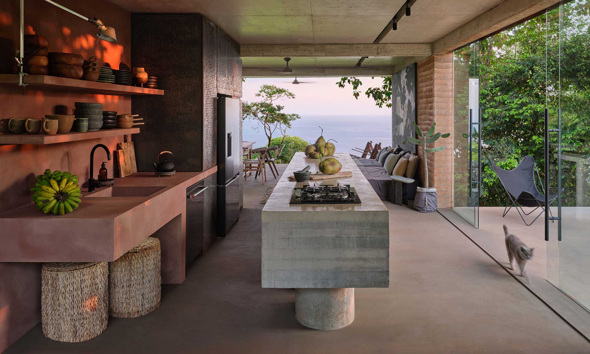 „Více jak polovinu celkové plochy dvoupodlažní vilky tvoří terasy a bazén. Hlavní obytný prostor v patře je směrem k oceánu plně otevřený a částečně sám plní funkci zastřešené terasy. Po stranách obytnou zónu patra plynule rozvíjí vnější pobytové plochy. Levitující platforma, přístupná po betonových deskách, uvádí hlavní vstup do domu a současně zastřešuje koupelnu. V její ose procházíme obytným prostorem s kuchyní na terasu s grilovacím pultem, usazenou přímo na úrovni terénu. Odtud vede dlouhé schodiště z cortenové oceli k bazénu, další nás vynese na plochou střechu domu. Bazén s přepadovou hranou 10 metrů se po celé délce opírá o vrstevnici a svým tvarem vnáší do projektu dynamiku, která se propisuje až po střešní terasu. Tam se mezi korunami stromů otevírá nebe a plocha střechy se stává ideální pozorovatelnou slunce zapadajícího za horizont oceánu i noční hvězdné oblohy,“ dodávají autoři.