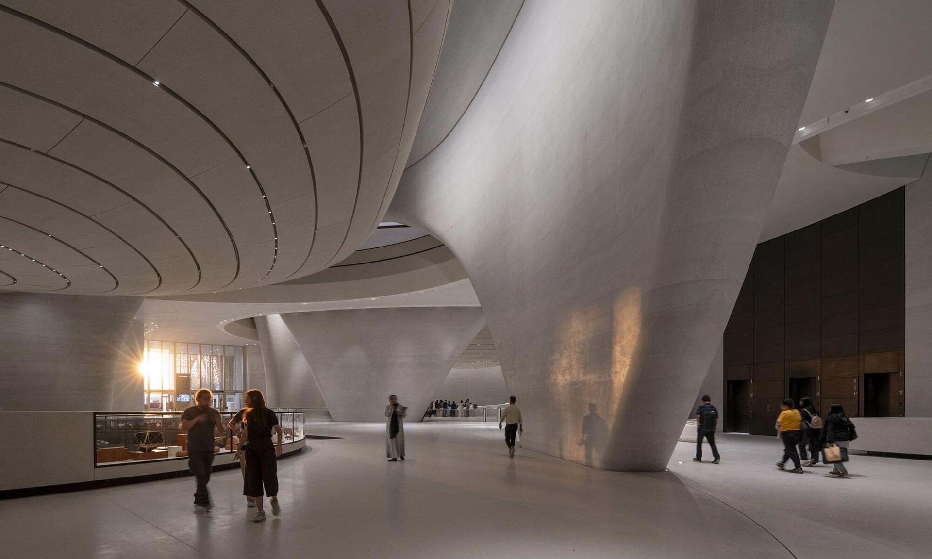 Interiér je ohromující a dominuje mu šest velkých galerií, z nichž čtyři mají tvar kapsle. Fascinující je dojem sochařského pojetí interiéru přecházející až do jeskynních tvarů. Zajímavé je prosklení pod věžemi se střešními okny ze elektrochromního skla zabavujícího se dle potřeby. Všechny galerie mají zavést návštěvníka do minulosti a provést jej historií až do současnosti. Každá galerie má proto jednotné téma a velmi cenné artefakty skryté před denním světlem. V přízemí u vstupu se nacházejí navíc ještě dve galerie pro dočasné výstavy, kavárna a restaurace. Před muzeem nechybí také zahrada spojující stavbu s pobřežím.