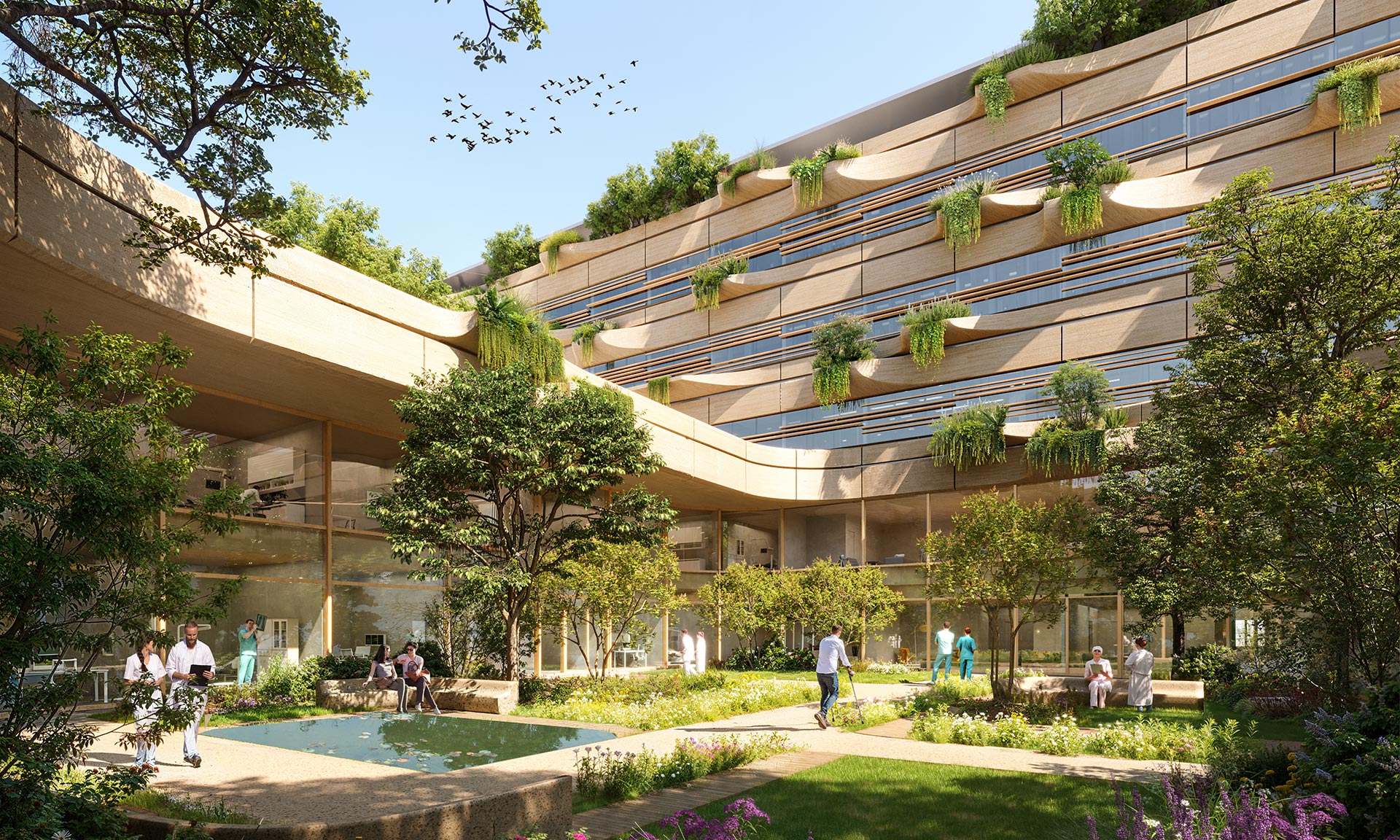 „Kompaktní struktura sestávající z pěti nadzemních podlaží a jednoho podzemního podlaží bude zahrnovat přibližně 90 000 metrů čtverečních organizovaných podle intenzity péče, která zahrnuje pohotovostní služby, chirurgii a intenzivní péči v multifunkčním operačním bloku s radiologickými, intervenčními a diagnostickými místnostmi. Nemocnice bude zahrnovat rozsáhlá ambulantní a lůžková zařízení, oddělení péče o matky a děti a diagnostické a terapeutické zóny s ošetřovnami. Návrh také počítá s klinikami prvního a druhého stupně, dalšími klinikami pro péči o matky a děti, spolu se specializovanými oblastmi pro rehabilitaci, laboratořemi a logistikou. Všechna zařízení v nemocnici jsou navržena tak, aby je bylo možné snadno rekonfigurovat podle měnících se potřeb,“ dodávají s tím, že na střeše budou zelené terasy s promenádami pro relaxaci a rehabilitaci. Přístřešek bude tvořen fotovoltaickými panely.