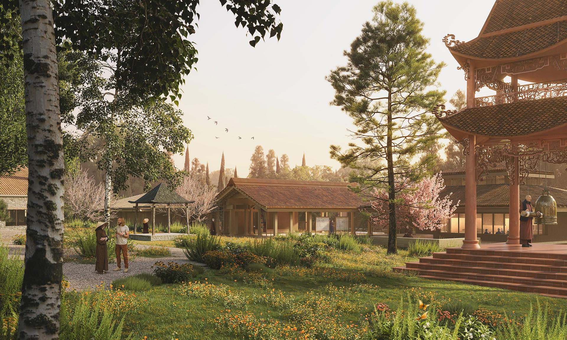 „Dnes je Plum Village největším buddhistickým klášterem v Evropě se sídlem ve Francii, který se skládá ze tří odlišných lokalit, včetně Lower Hamlet, kde žije přibližně polovina mnišek z Plum Village, a Upper Hamlet, kde žijí mniši z Plum Village a kde se nachází Dharma Cloud Temple, hlavní chrám tradice Plum Village. Stoupenci tradice Plum Village praktikují angažovaný buddhismus a uplatňují svou etiku a poznatky v souvislosti se současnými problémy. Proto byly pro návrhy MVRDV zásadní udržitelnost a úcta k přírodě, které představují architektonickou reakci na klimatické změny,“ uvádí architekti.