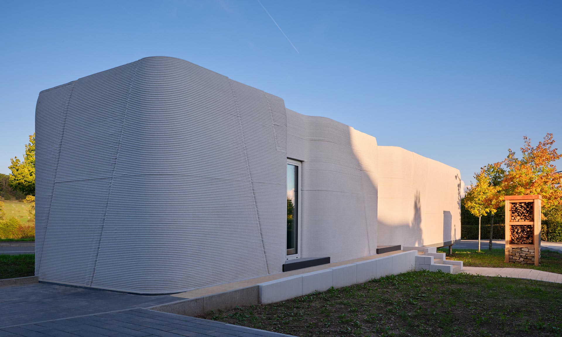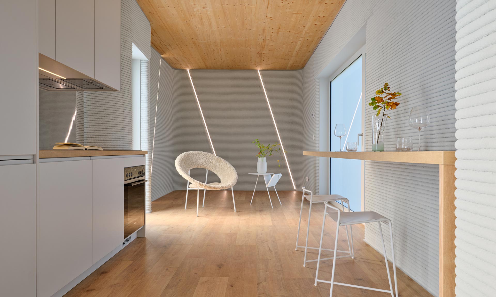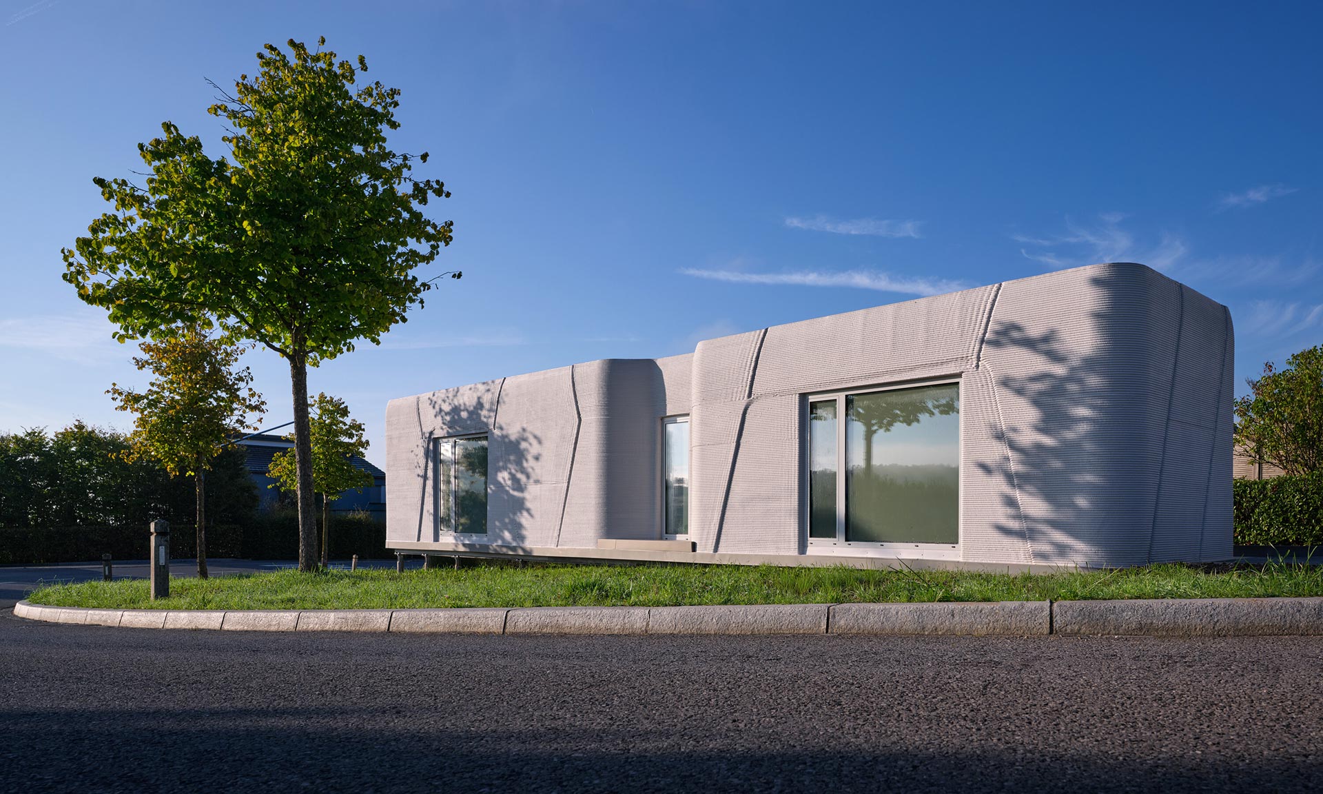 „První zkušební dům vznikl na úzkém a do té doby nevyužívaném pozemku na okraji obytné čtvrti v Niederanvenu. Kvůli místním předpisům měla přidělená parcela výrazně protáhlý tvar, šířku 3,5 metru a hloubku 17,7 metru, což vedlo k kompaktnímu a efektivnímu uspořádání s čistou užitnou plochou 47 metrů čtverečních. Vzhledem k minimální vnější šířce pouhé tři metry se architektonický koncept zaměřil na vytvoření silné lineární osy, která prostor vizuálně rozšiřuje. Umístěním funkčních prvků po obou stranách úložných prostor, nábytku a technických zón a zachováním otevřené centrální perspektivy dosahuje interiér pocitu hloubky a prostorové přehlednosti, který daleko přesahuje jeho kompaktní rozměry. Výsledkem je vyvážená, protáhlá kompozice, která navzdory své velikosti působí soudržně a klidně,“ uvádí architekti s tím, že jde o první 3D tištěnou obytnou budovu využívající místní stavební materiály a stojí na dřevěné základové desce na zemních vrutech, bez použití klasických betonových základů.