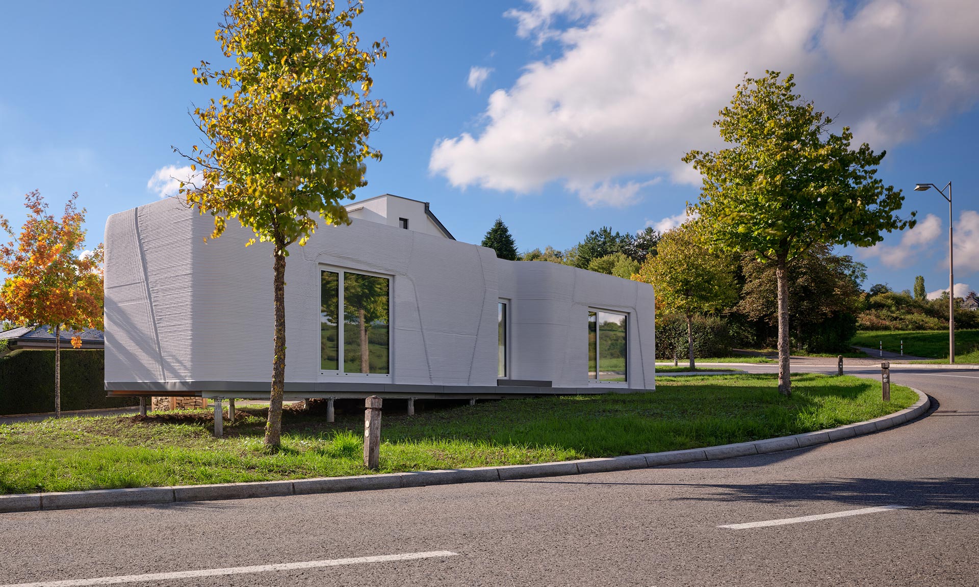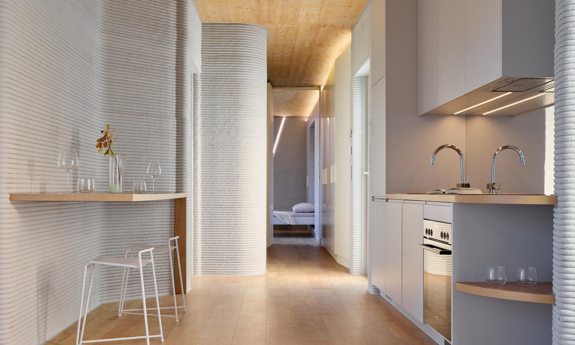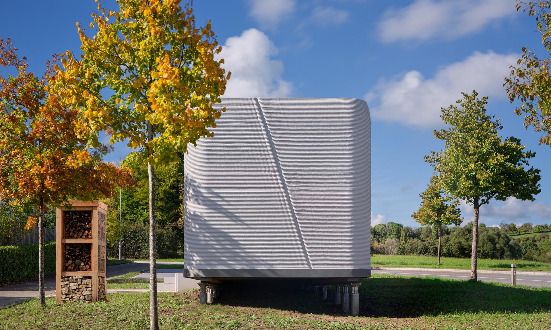 „První zkušební dům vznikl na úzkém a do té doby nevyužívaném pozemku na okraji obytné čtvrti v Niederanvenu. Kvůli místním předpisům měla přidělená parcela výrazně protáhlý tvar, šířku 3,5 metru a hloubku 17,7 metru, což vedlo k kompaktnímu a efektivnímu uspořádání s čistou užitnou plochou 47 metrů čtverečních. Vzhledem k minimální vnější šířce pouhé tři metry se architektonický koncept zaměřil na vytvoření silné lineární osy, která prostor vizuálně rozšiřuje. Umístěním funkčních prvků po obou stranách úložných prostor, nábytku a technických zón a zachováním otevřené centrální perspektivy dosahuje interiér pocitu hloubky a prostorové přehlednosti, který daleko přesahuje jeho kompaktní rozměry. Výsledkem je vyvážená, protáhlá kompozice, která navzdory své velikosti působí soudržně a klidně,“ uvádí architekti s tím, že jde o první 3D tištěnou obytnou budovu využívající místní stavební materiály a stojí na dřevěné základové desce na zemních vrutech, bez použití klasických betonových základů.