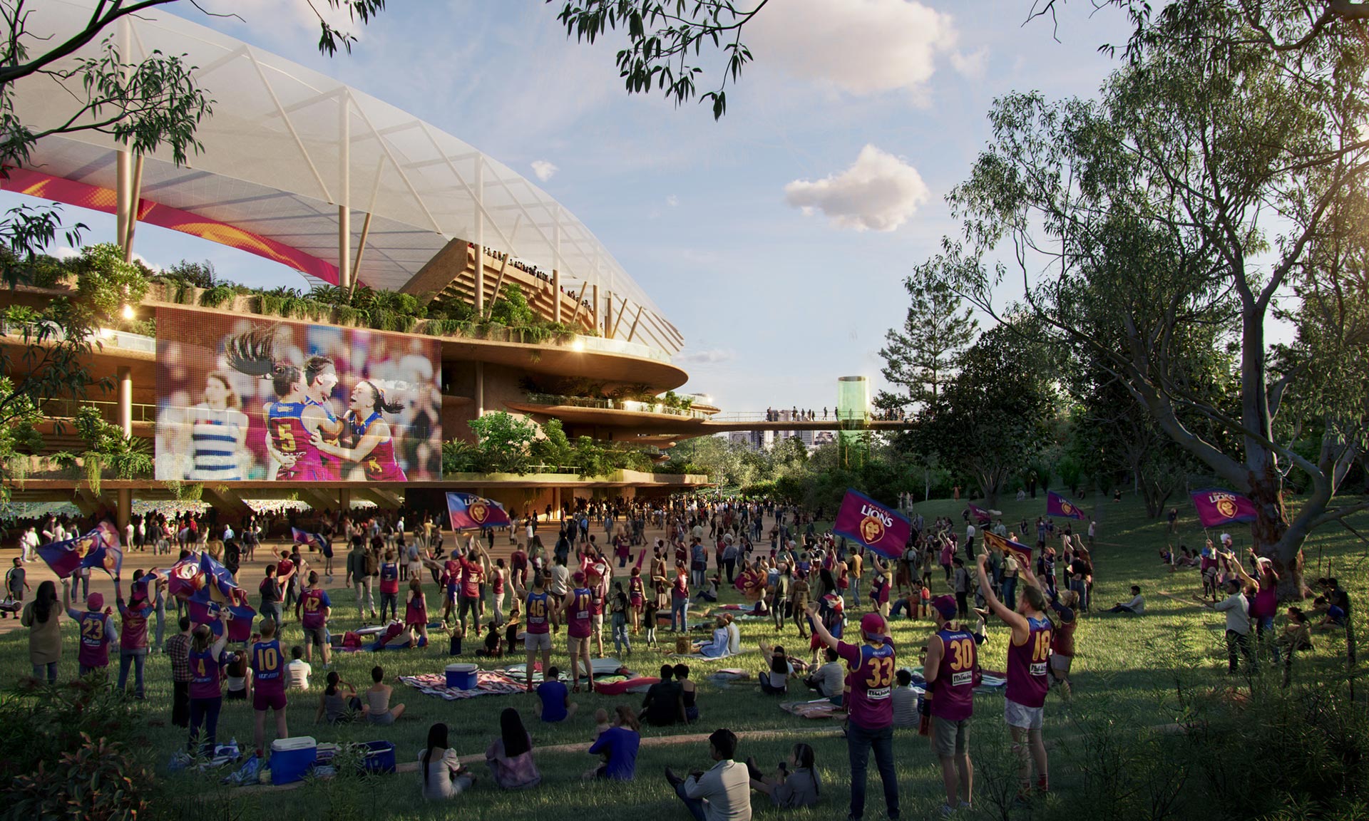 „Tento stadion, který se nachází v areálu Victoria Park, upoutá pozornost celého světa, protože bude hostit nezapomenutelné zahajovací a závěrečné ceremonie a napínavé atletické soutěže, které se očekávají v roce 2032. Ambice však sahají daleko za dva týdny globální sportovní oslavy: v režimu dědictví bude stadion Brisbane Stadium novým centrem města pro AFL, kriket, koncerty hlavních hvězd a mezinárodní akce – což představuje generační skok vpřed v budoucnosti Queenslandu,“ uvádí k projektu architekti.