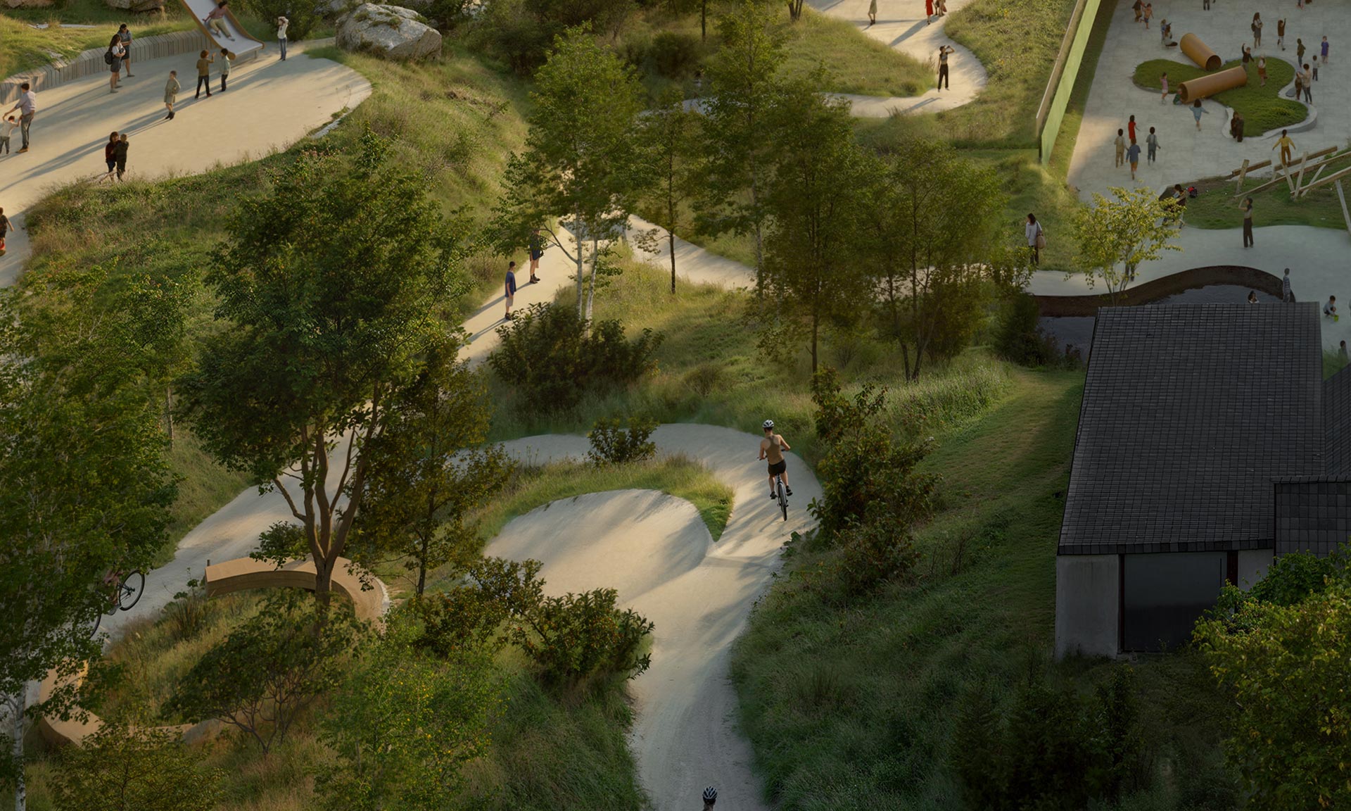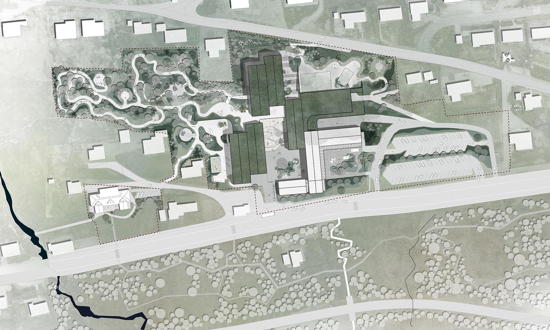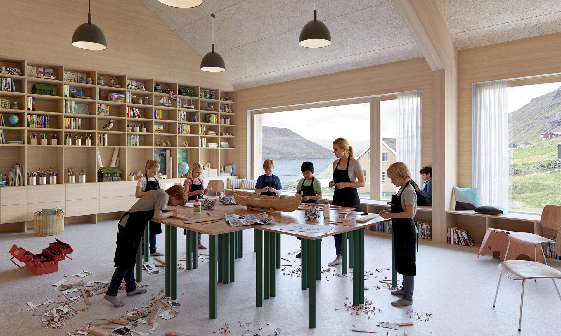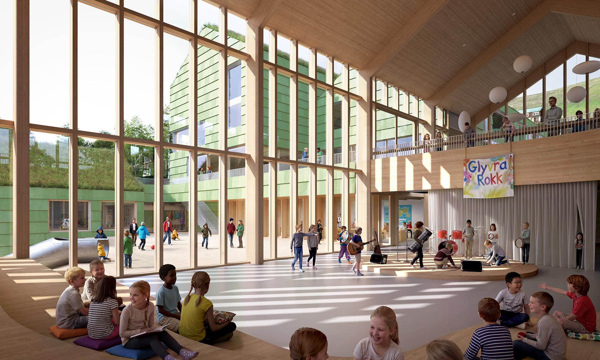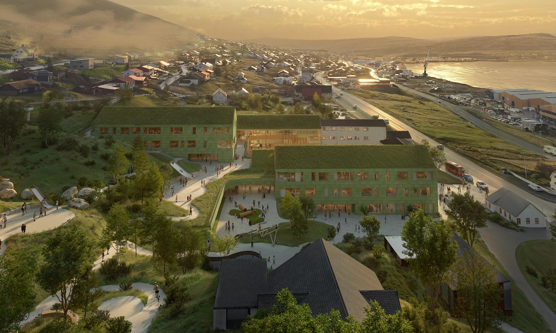„Chráněné herní zóny, rozmanitá výsadba a přirozená ochrana před větrem umožňují celoroční využití venkovního prostředí, které podporuje vše od praktického objevování až po sociální interakci. Umělecké instalace a oblasti pro aktivity podporují pohodu, smyslové vjemy a posilují pouta v komunitě, čímž se škola stává živým vzdělávacím ekosystémem pro žáky ve věku od 5 do 12 let. Venkovní vybavení přesahuje hranice školního areálu; kampus je společenským a kulturním centrem pro Glyvrar. Upravená nádvoří, cesty vedoucí na pláž a zařízení pro saunu a koupání v moři jsou propojeny sítí rekreačních tras a aktivitních zón určených pro každodenní využití jak školou, tak širší komunitou,“ dodávají.