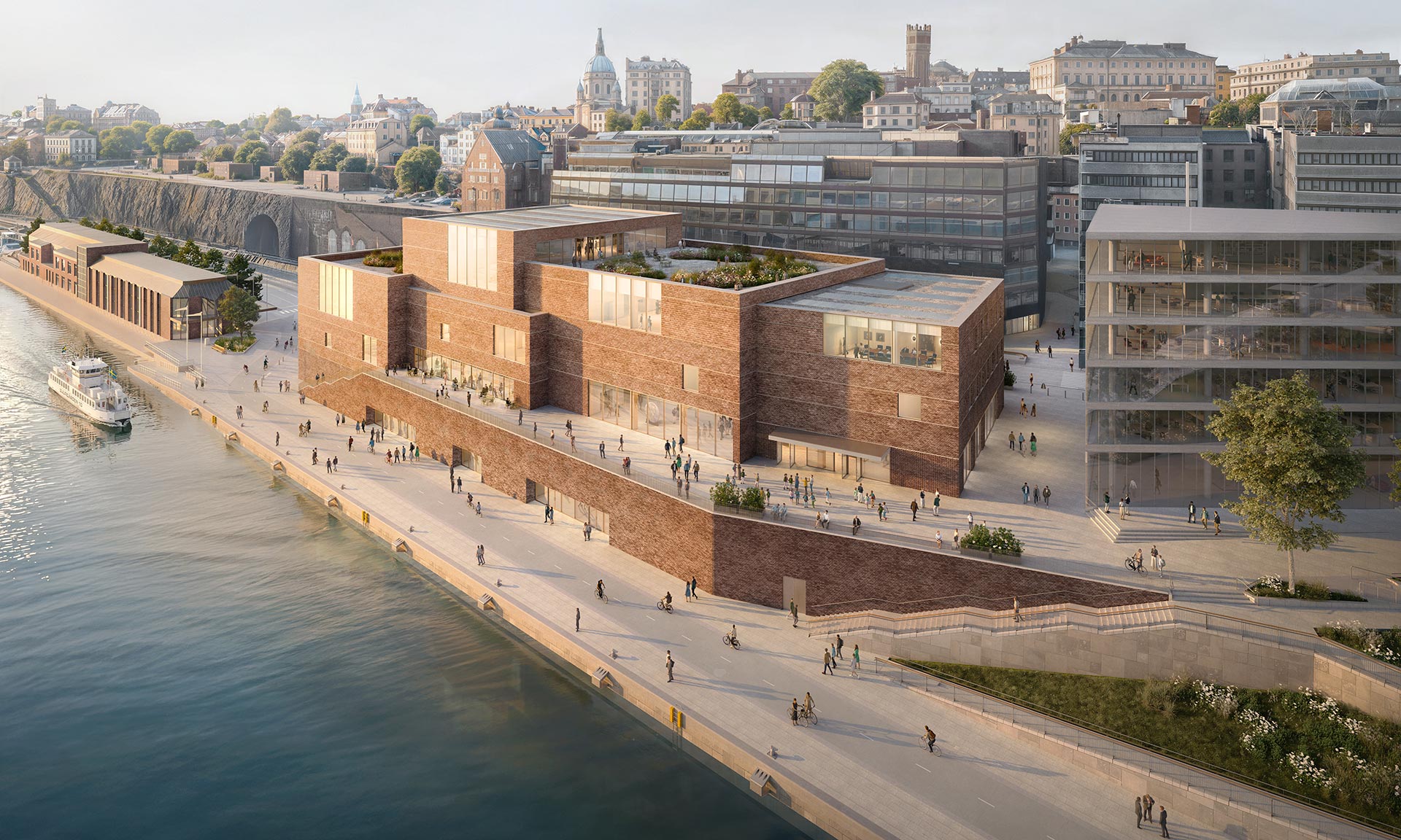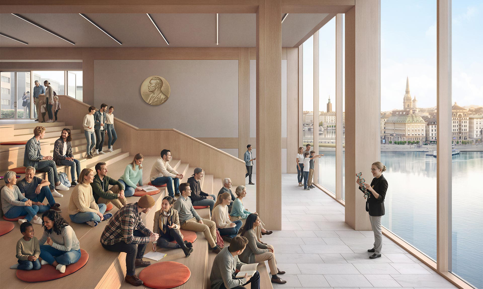 „Budova se skládá z propojených objemů, které reagují na topografii čtvrti Södermalm. Jejich rytmus a proporce vycházejí z měřítka obchodních domů ze 17. století ve Starém Městě na druhém břehu řeky, což budově umožňuje zapadnout do historického nábřeží Stockholmu a zároveň působit jako jednotná, soudržná struktura. Spolu s novou terasou před budovou je přízemí koncipováno jako rozšíření veřejného prostoru, vysoce prostupné a transparentní, se vchody na severu a jihu a veřejným foyer s obchodem a restaurací. Umožňuje plynulý přechod bez prahů mezi městem a budovou a zakotvuje Nobelovo centrum v každodenním městském životě,“ dodává s tím, že interiér je koncipován pro co nejlepší výhled velkými okny do okolí.