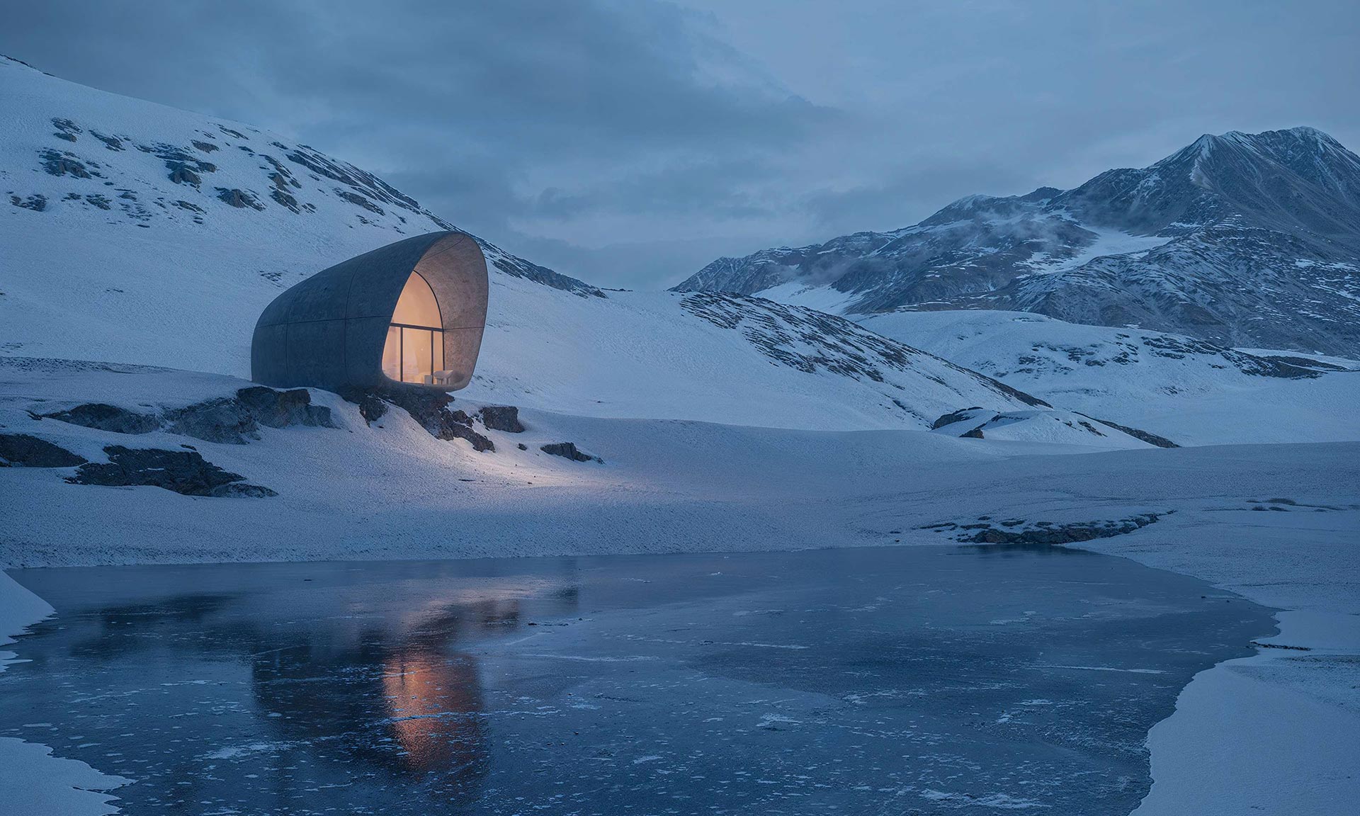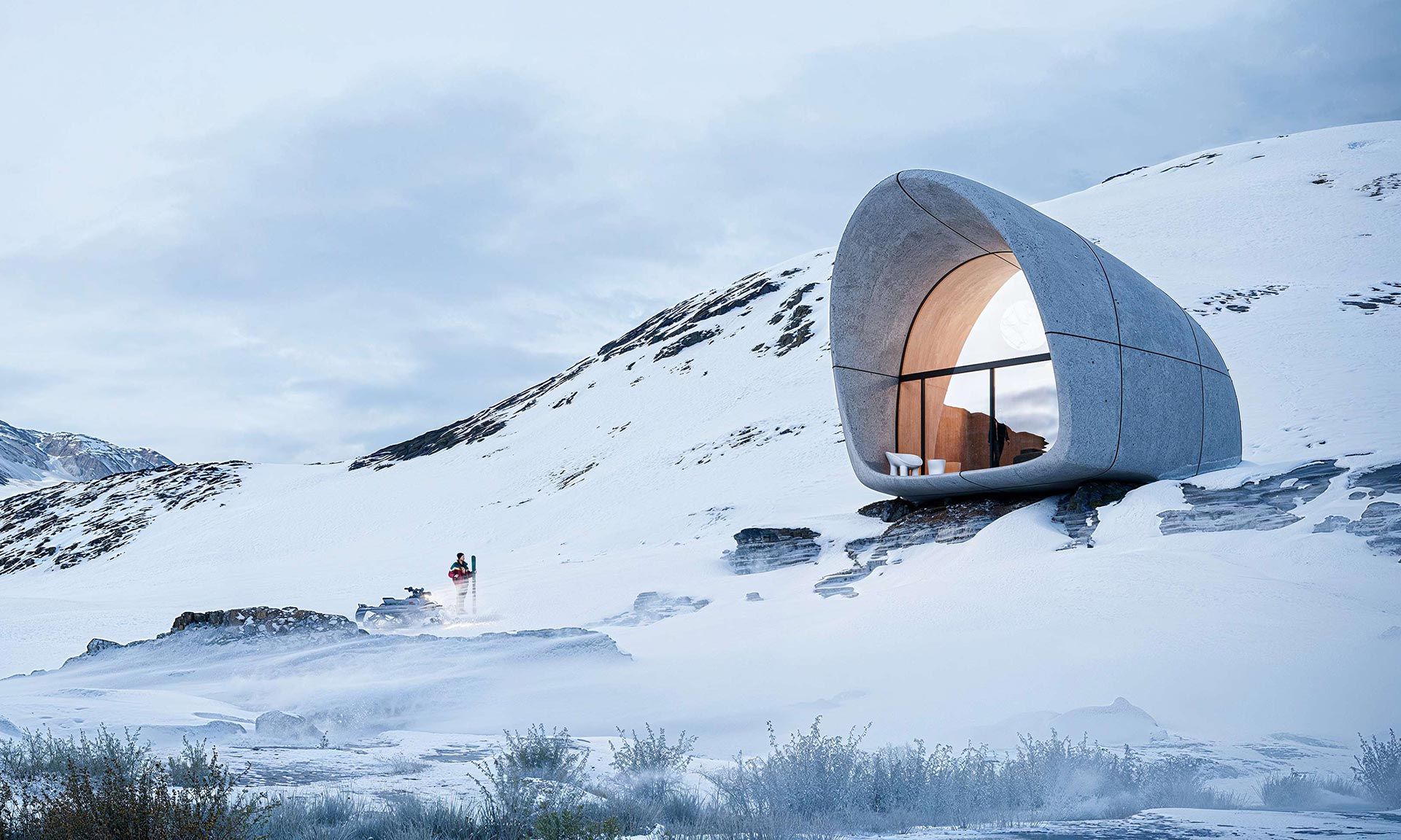„Každá chata je koncipována spíše jako pokračování přírody než jako objekt umístěný v ní. Vnější povrch z vláknobetonu bude stárnout a splynout s terénem, zatímco interiér zůstane klidný a trvalý. Výsledkem je prostor, který splývá s okolím a nabízí vzácný druh ticha a jasnosti, kde architektura slouží pouze k rámování přítomnosti samotné hory,“ dodávají s tím, že v plánu je postavit několik identických chat na různých místech v horách. Elektřina by se získávala solárními panely.