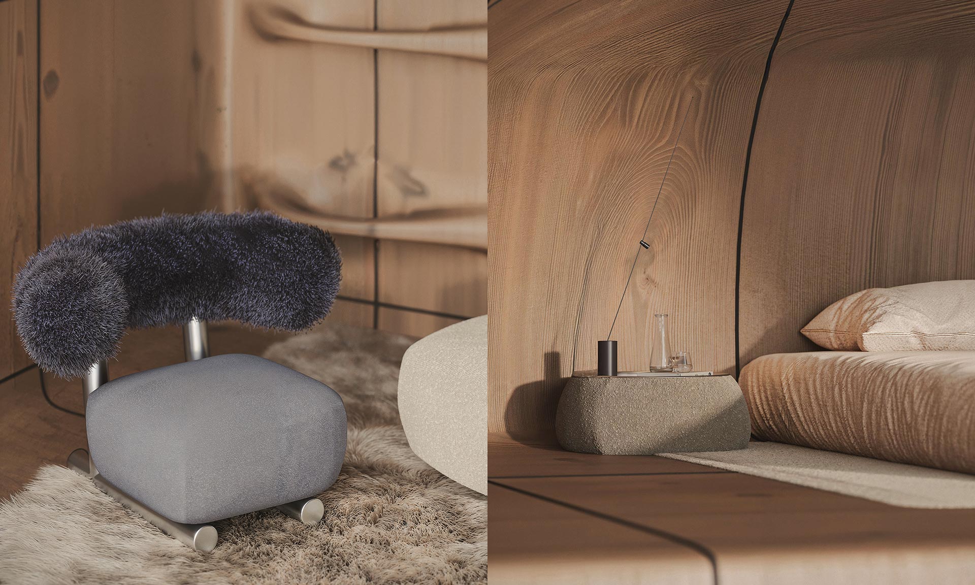 „V souladu s touto filozofií představují nové chaty AltiHut Cottages osobnější způsob, jak prožít pobyt v horách. Každá jednotka, navržená pro rodiny a malé skupiny, poskytuje klidné útočiště, které rozšiřuje ekosystém hlavní chaty a zároveň zůstává plně integrováno do krajiny. Dispozice je jednoduchá a kompaktní, s malým pokojem pro děti, centrální obývací částí a otevřenou ložnicí v mezipatře s výhledem na horizont. Architektonický nápad vychází z jazyka čistoty a zdrženlivosti Stipfold. Exteriér tvoří souvislá skořápka z vláknobetonu, jejíž tvar vyvolává dojem, jako by tam byla odjakživa. Uvnitř určuje atmosféru přírodní dřevo, které vyvažuje teplo a jednoduchost. Velké prosklené otvory proměňují okolní krajinu v hlavní prvek interiéru, takže výhled se stává součástí designu,“ uvádí k projektu architekti.