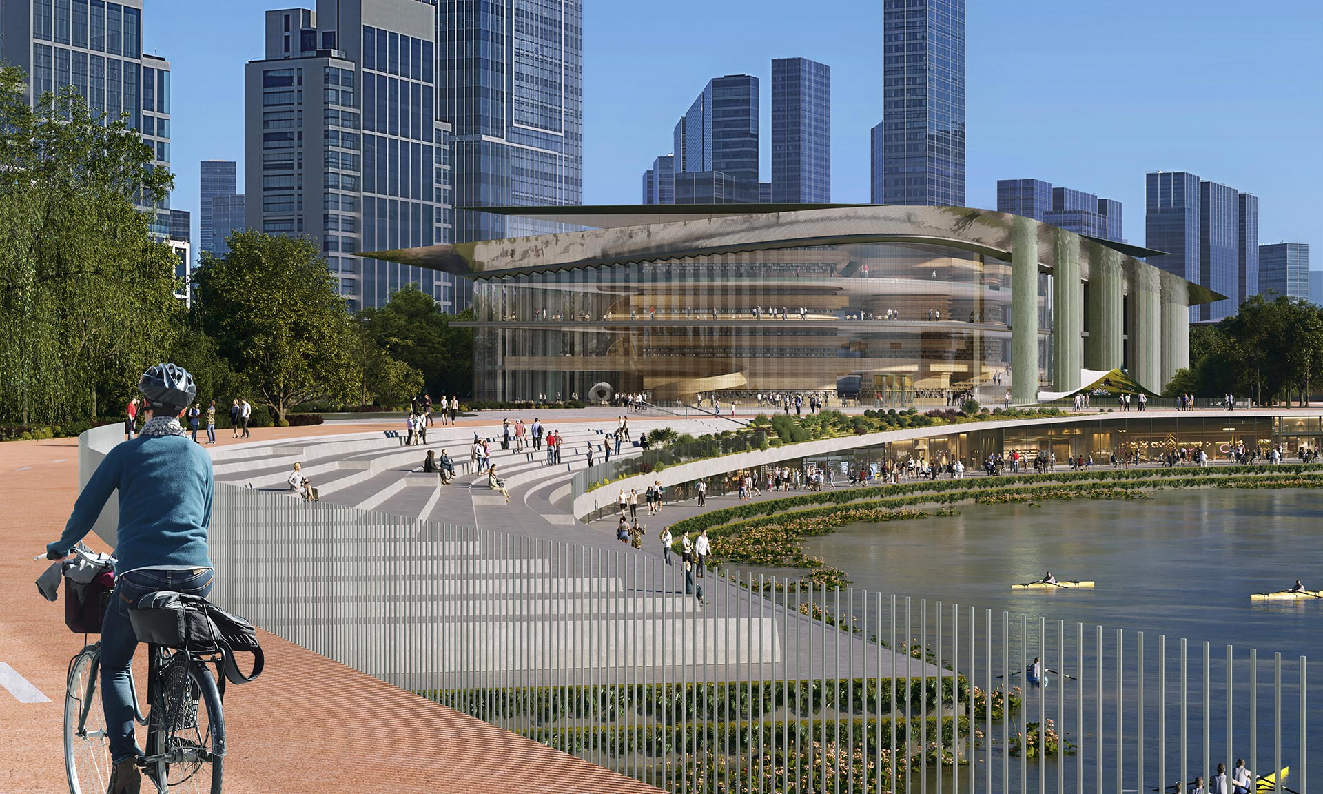 „V rámci této nové kulturní čtvrti u kanálu zahrnuje návrh knihovny od ZHA řadu obytných architektonických sloupů. Tyto sloupy slouží jako konstrukční podpora a definují identitu institutu jako sestavené kameny znalostí a budou sloužit k uložení rozsáhlých literárních sbírek a archivů knihovny, stejně jako čítáren a komunitních prostor. Fasáda knihovny čerpá z 5000 let dlouhé historie umění zpracování nefritu v tomto regionu a je tvořena precizně zpracovanými zděnými dlaždicemi inspirovanými barevnými odstíny tohoto místního drahého kamene. Sklopené skleněné prvky ve fasádě rozptylují přirozené světlo do interiéru a vytvářejí tak měkké, světlé prostředí vhodné pro čtení, studium a rozjímání, přičemž denní světlo proniká hluboko do budovy,“ uvádí k projektu architekti v čele s Patrikem Schumacherem. Zajímavostí je, že jedním z členů týmu je i česká architektka Růžena Mašková.