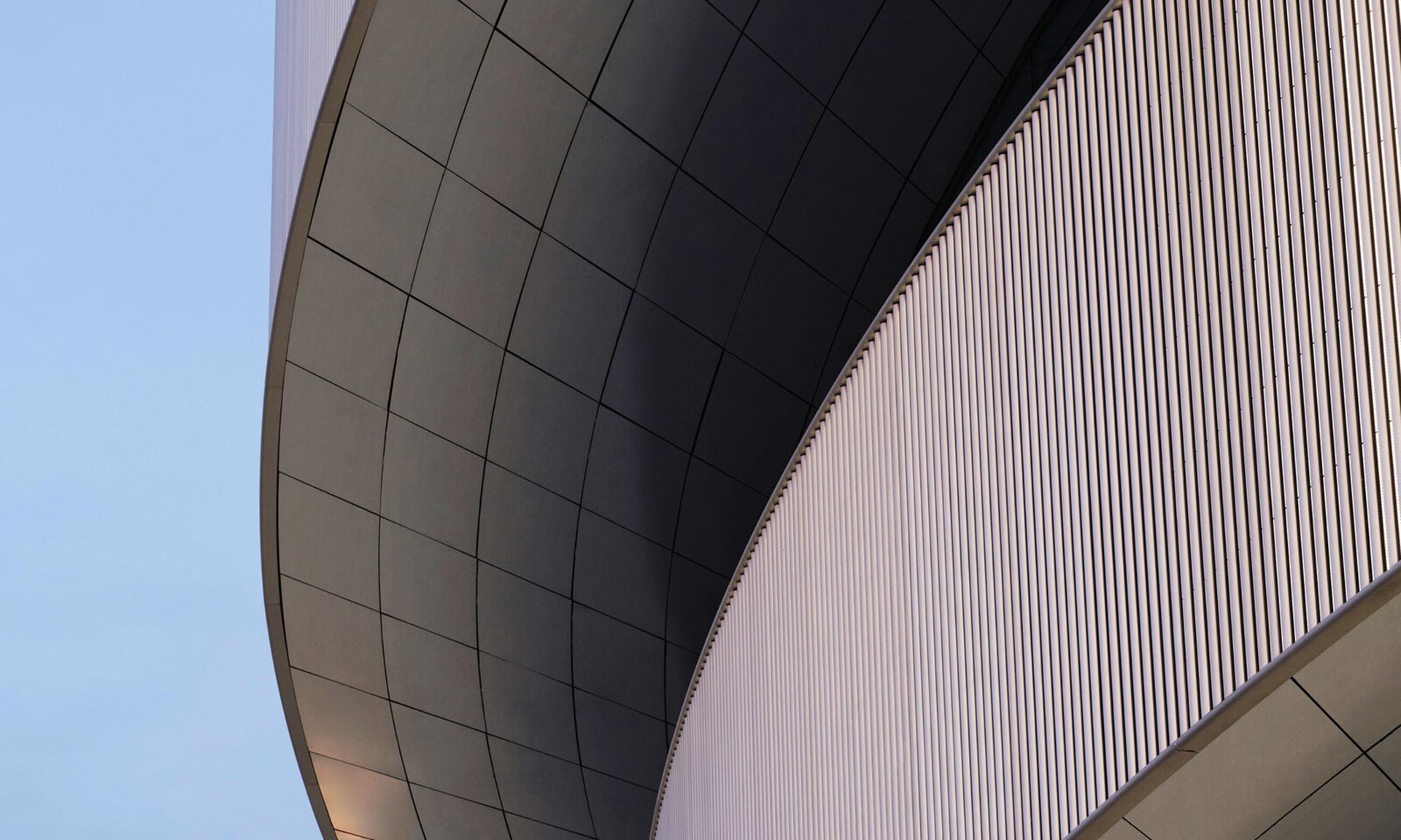 „Aréna se nachází v jižní části areálu. Je mírně otočená, vítá přicházející hosty ze západu a vede návštěvníky po širokém schodišti na vyvýšené pódium, které zabírá téměř celý areál. Zde se nachází prostorné náměstí o rozloze přes 10 000 metrů čtverečních, které lze využít jako místo pro venkovní akce. Na vrcholu tohoto monolitického pódia se nad sebou vznáší tři kruhy rostoucí výšky, které obklopují celou budovu a dodávají jí dynamický tvar. Jejich kovová materialita se vyznačuje třpytivými hliníkovými trubkami během dne a LED pásky velkoplošné mediální integrace, které se rozsvítí v noci. Tvrdá materialita pódia a arény je vyvážena organickými zelenými plochami se stromy, které se táhnou po schodišti jako zelená kopcovitá krajina,“ uvádí David Chipperfield se svým ateliérem.