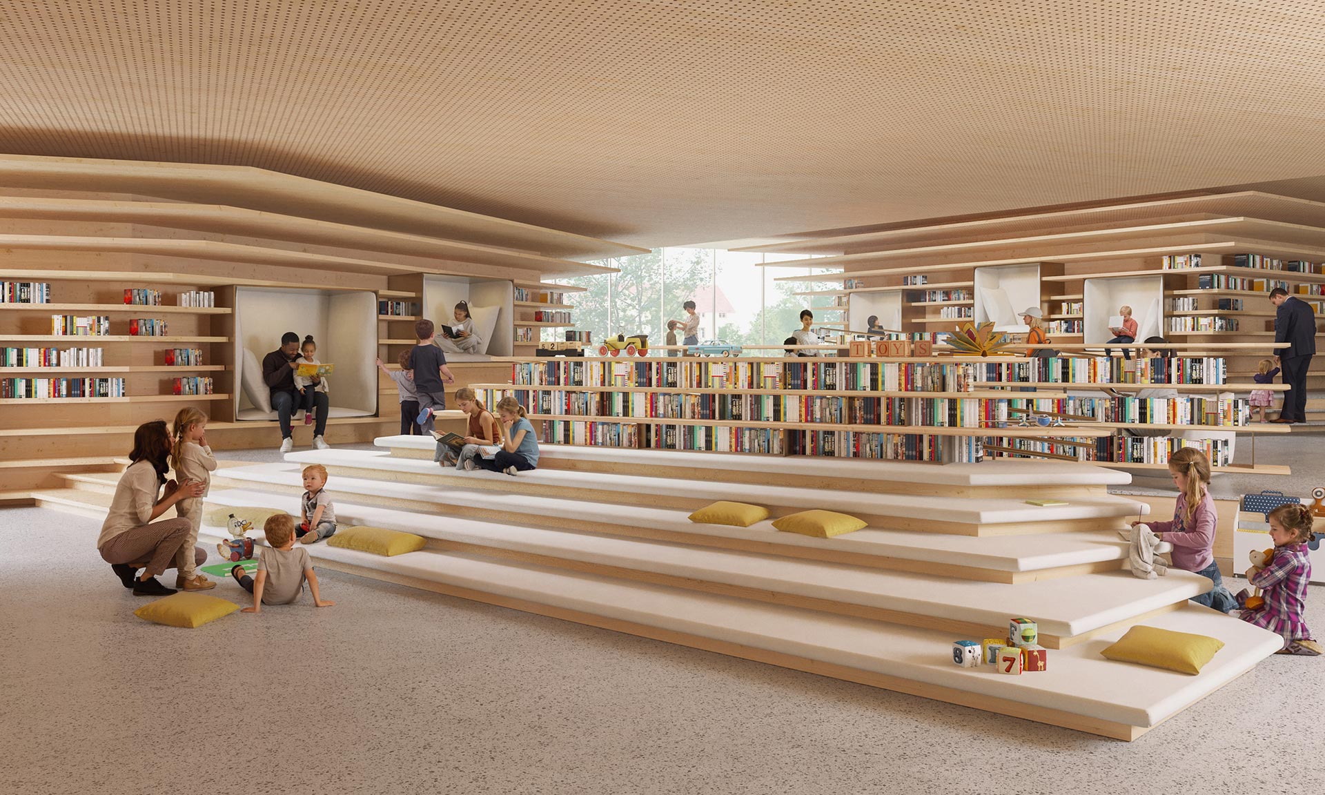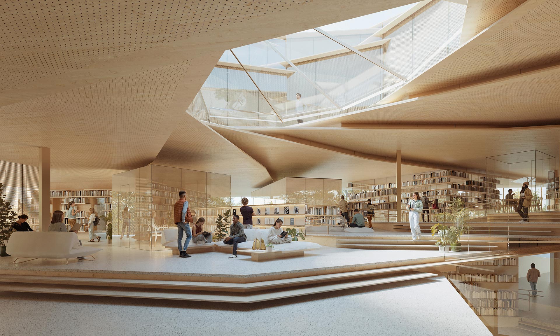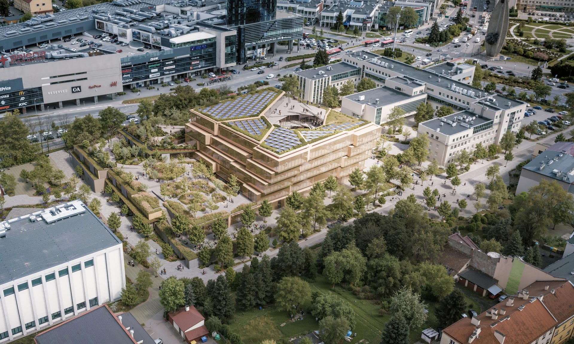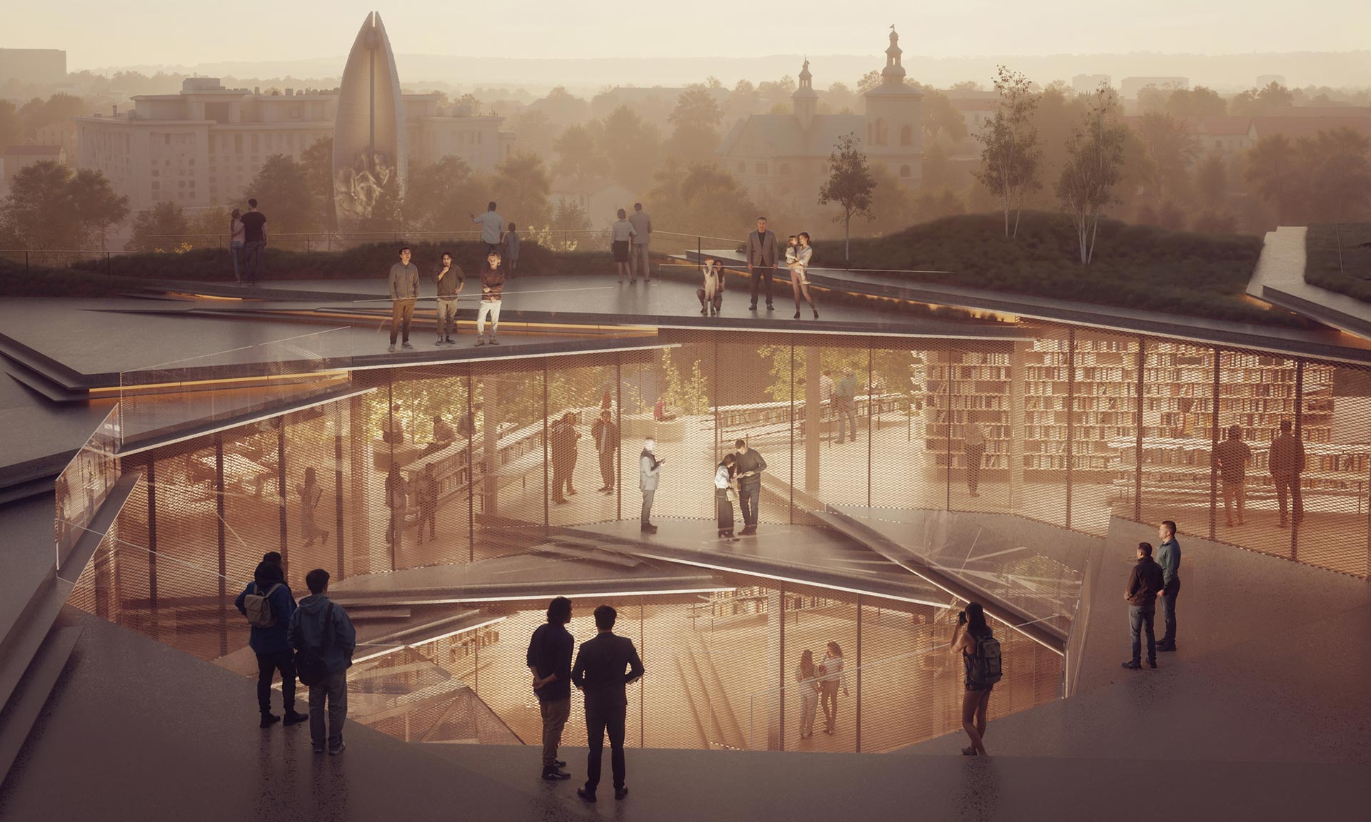 „Stejně podstatný je městský kontext budovy. Rozhodnutí odsunout hlavní hmotu od Piłsudského třídy nebylo aktem ústupu, nýbrž štědrosti. Mezi silničním provozem a reflexí, mezi rychlostí a soustředěním jsme navrhli prostor pro nadechnutí – zahradu, inkluzivní veřejnou zónu, moment zklidnění. Kultura vyžaduje postupné uvedení. Do knihovny se nevbíhá z pouličního hluku – dochází se k ní pomalu a spěch města se nechává za zády. Urbanistická kompozice zároveň s plným vědomím zdůrazňuje význam propojení historického Starého Města s novou veřejnou institucí. Umístění a orientace hlavního vchodu byly navrženy tak, aby navázaly jasný a zvoucí městský dialog – přirozeně vedly pěší z centra města směrem ke knihovně. Vstupní sekvence není náhodná; představuje vědomé občanské gesto, které posiluje kontinuitu mezi kulturní pamětí Starého Města a budoucím veřejným životem nové budovy,“ dodává.