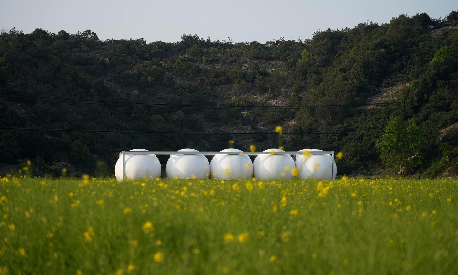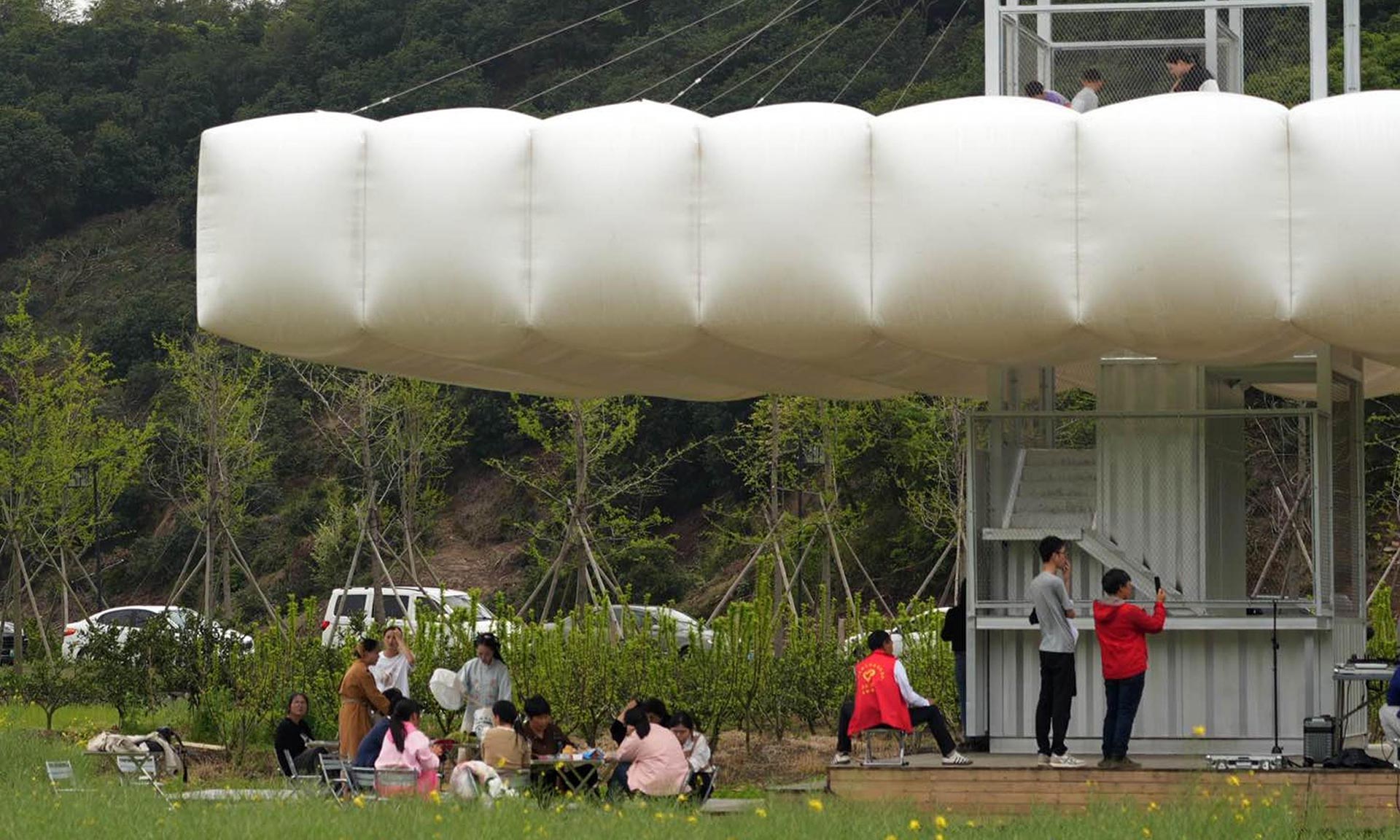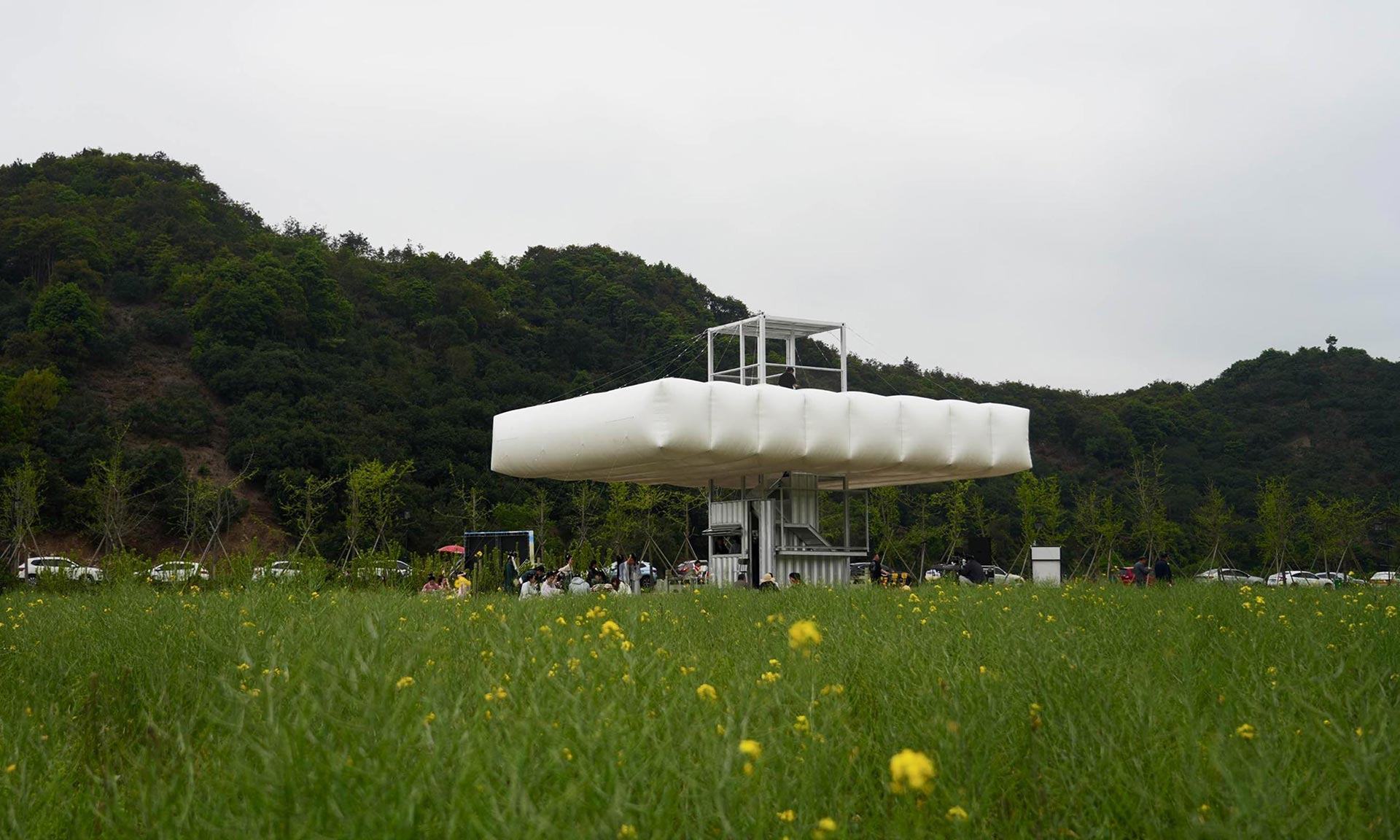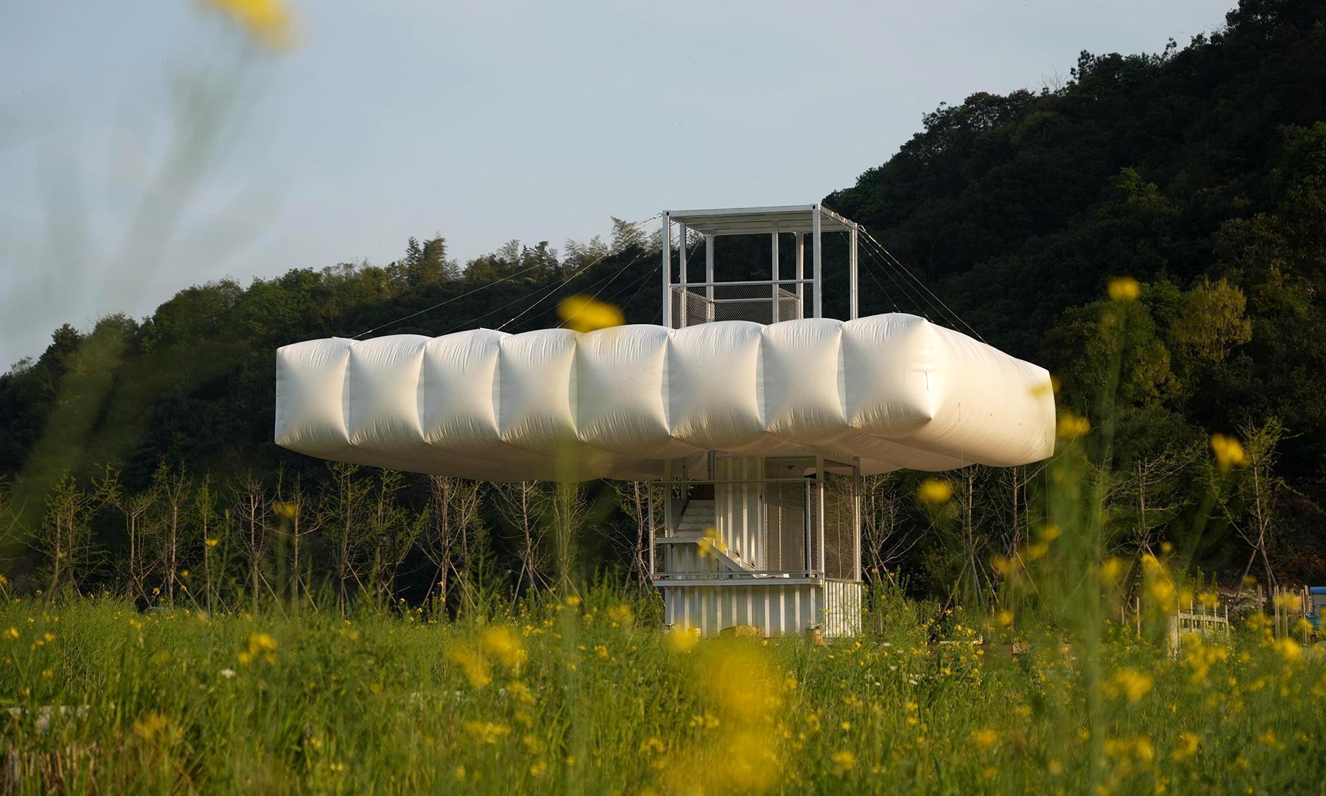 Čínský architektonický ateliér Practice on Earth postavil na místě již opuštěných staveb sérii tří malých objektů společně nazvaných Down in the Clouds. Spojuje je bílá barva a vzduchové polštáře různých tvarů. V polích září jako nepřehlédnutelné objekty s výraznými geometrickými prvky. Stavby fungují jako kino, kavárna, rozhledna nebo čítárna. Staly se atraktivním místem pro setkávání rodin z okolí.