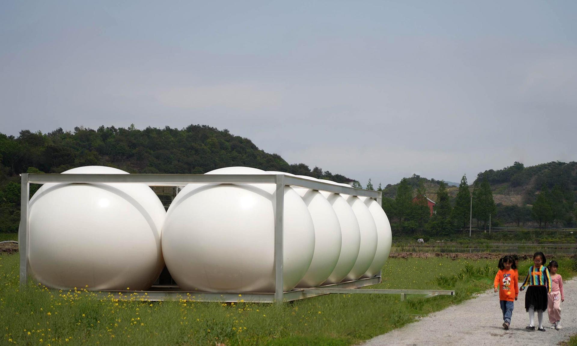 „Nové stavby se nacházejí na místě různých opuštěných staveb, které stály na poli, včetně starých billboardů, hospodářských budov a skladů. Studio prozkoumalo materiálové systémy, které byly dostupné a proveditelné z hlediska časového harmonogramu a rozpočtu projektu, a nakonec vybralo kombinaci ocelových kontejnerů a nafukovacích prvků. Tyto systémy byly vybrány pro jejich flexibilitu a rychlou instalaci. To je vedlo k prozkoumání, jak lze tyto zdánlivě nesourodé prvky integrovat, aby vytvořily hravé a jedinečné prostorové zážitky,“ uvádí architekti k pozadí projektu ve vesnici Dun’ao.