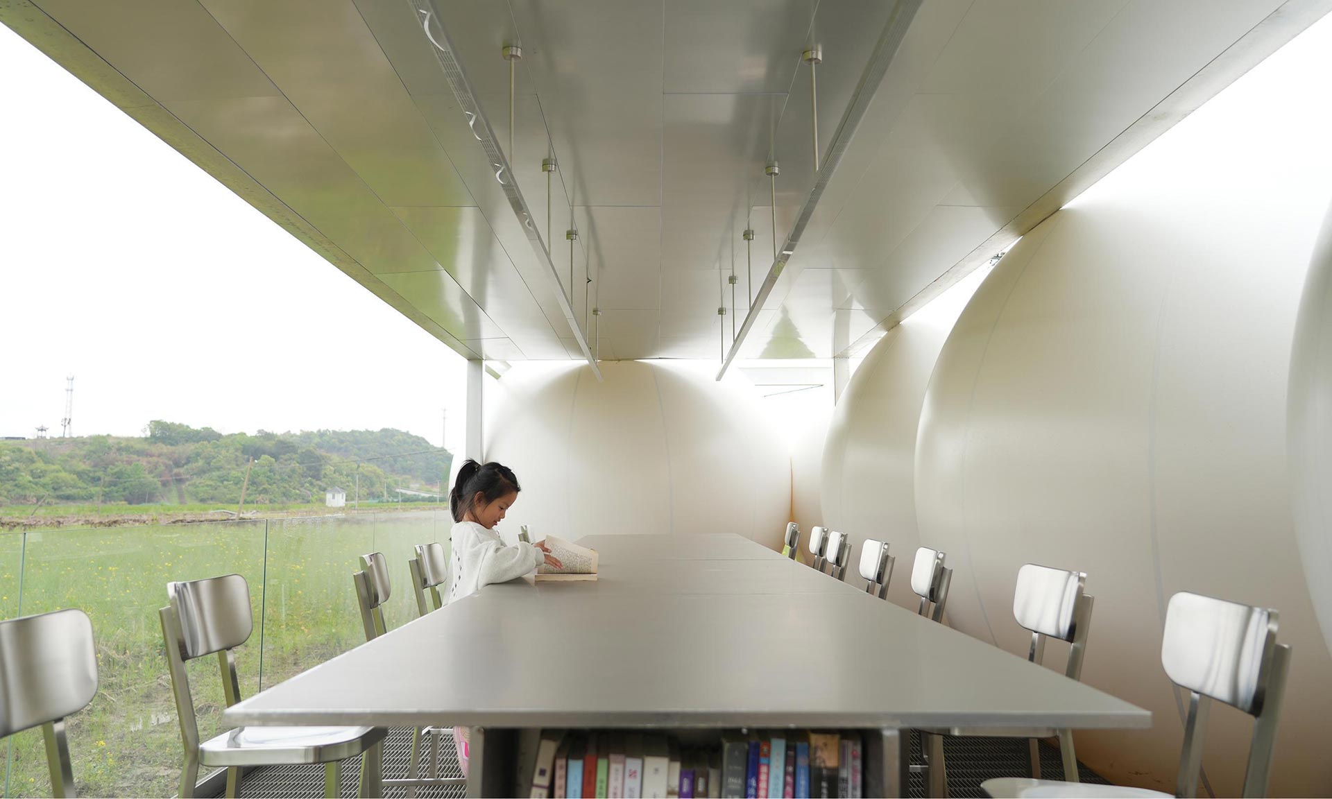 Třetí místo se stalo čítárnou, která vznikla místo nevyužívané hospodářské budovy. Tvoří ji velké bílé balóny, které obklopují prosklený prostor s velkými okny koukajícími do polí. Nekonečně dlouhý stůl a množství židlí nabízí dostatečný prostor pro setkávání různého druhu v klidném prostředí. Do prostoru se vstupuje mezi balóny, které musí návštěvníci rozhrnout a vstoupí tak do místnosti. Zajímavé jsou kovové prvky dávající všem třem prostorům takový kosmický nádech.