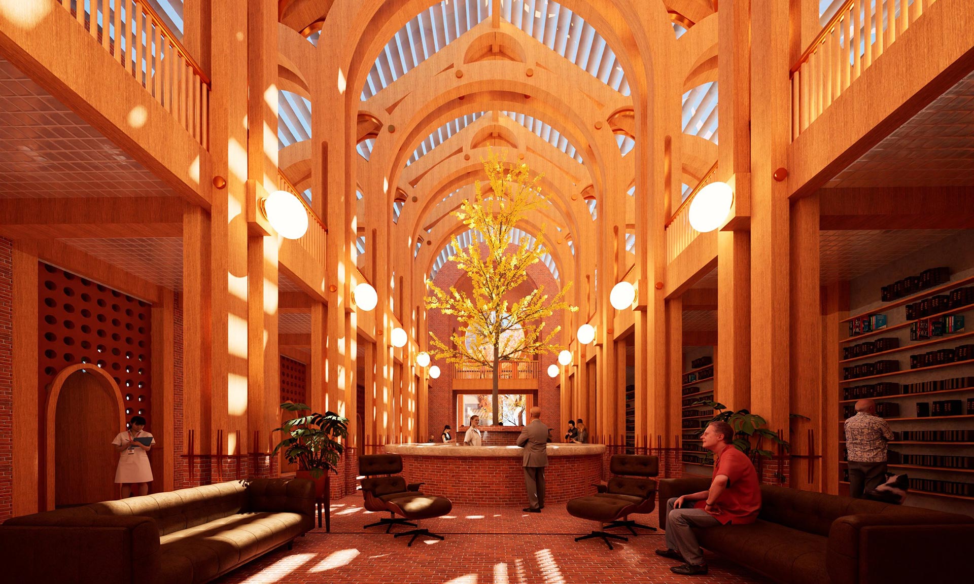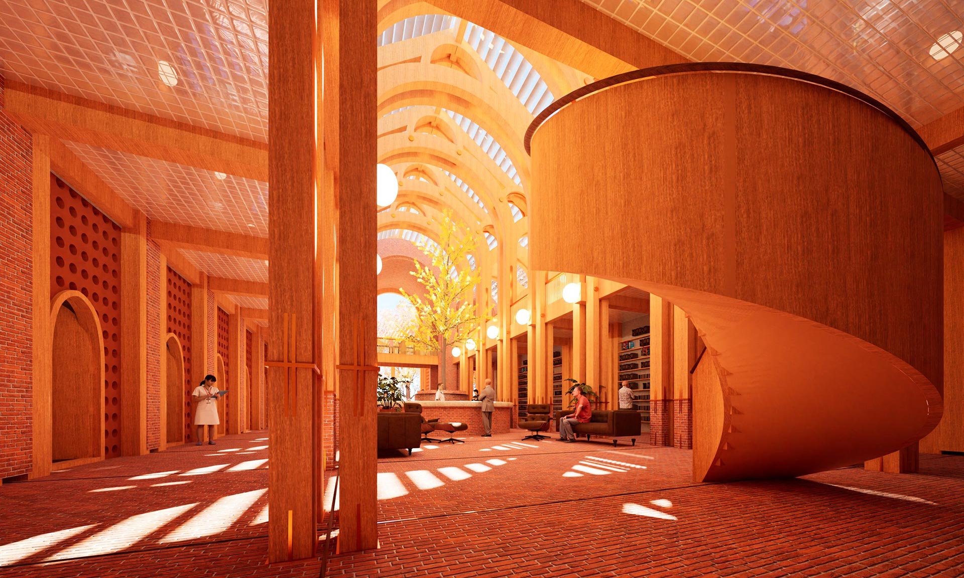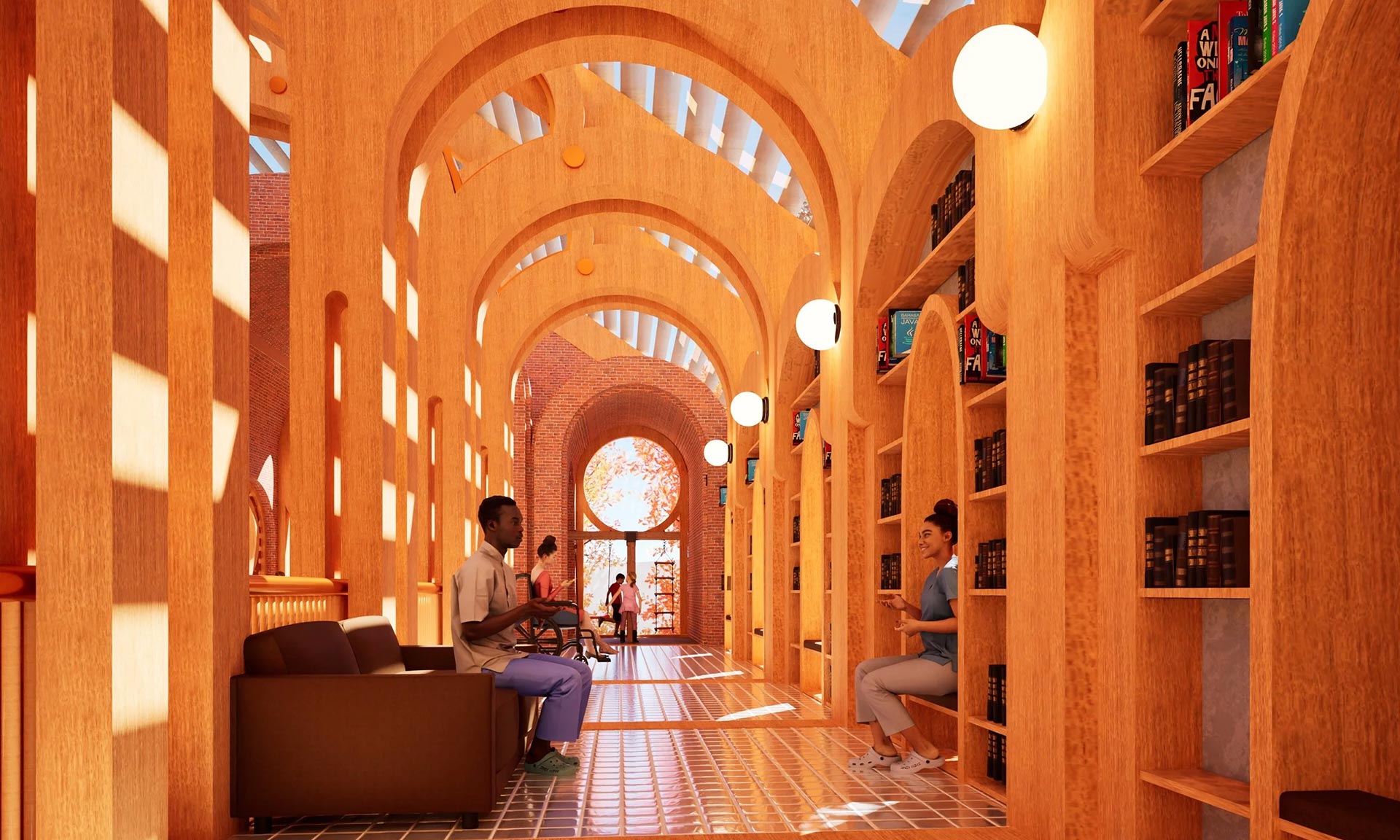 „Soukromé pokoje, místnosti pro fyzioterapii a arteterapii a prostory pro akce jsou umístěny v sérii cihlových kleneb, které byly přidány k západní fasádě. Vnitřní zahrada osázená lineárním bambusovým hájem odděluje příčky ze sádrokartonu západní fasády od oken od podlahy ke stropu, která vnášejí zeleň do každé místnosti. Sluncem vypalované cihlové zdi oddělují soukromé pokoje ve druhém patře, do kterých se vstupuje původními gotickými okny, která patřila luteránskému kostelu Faith Lutheran Church. Gotická okna na východní fasádě byla přeměněna na čtecí koutky,“ dodávají.