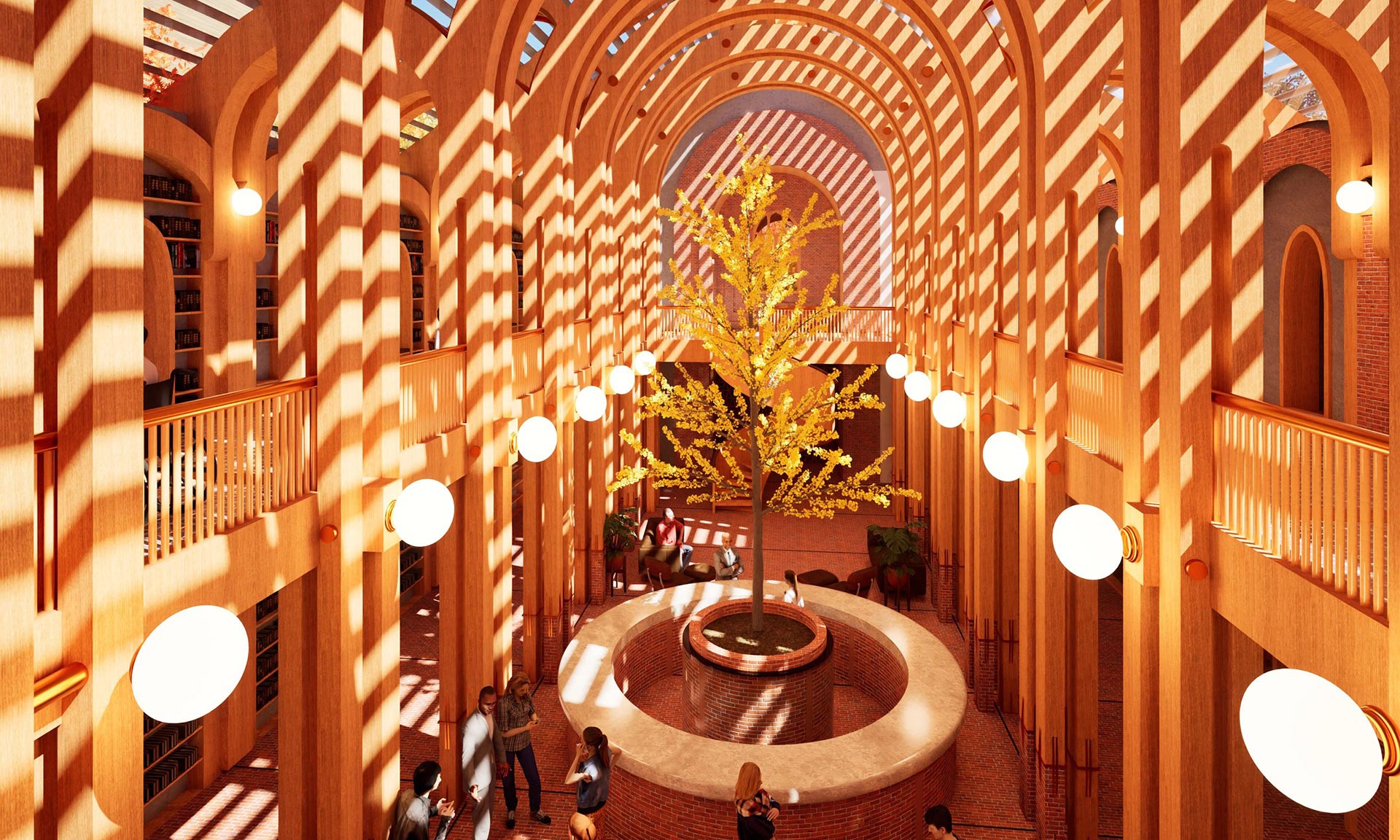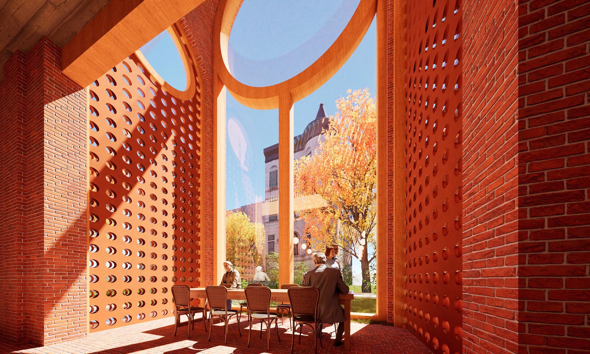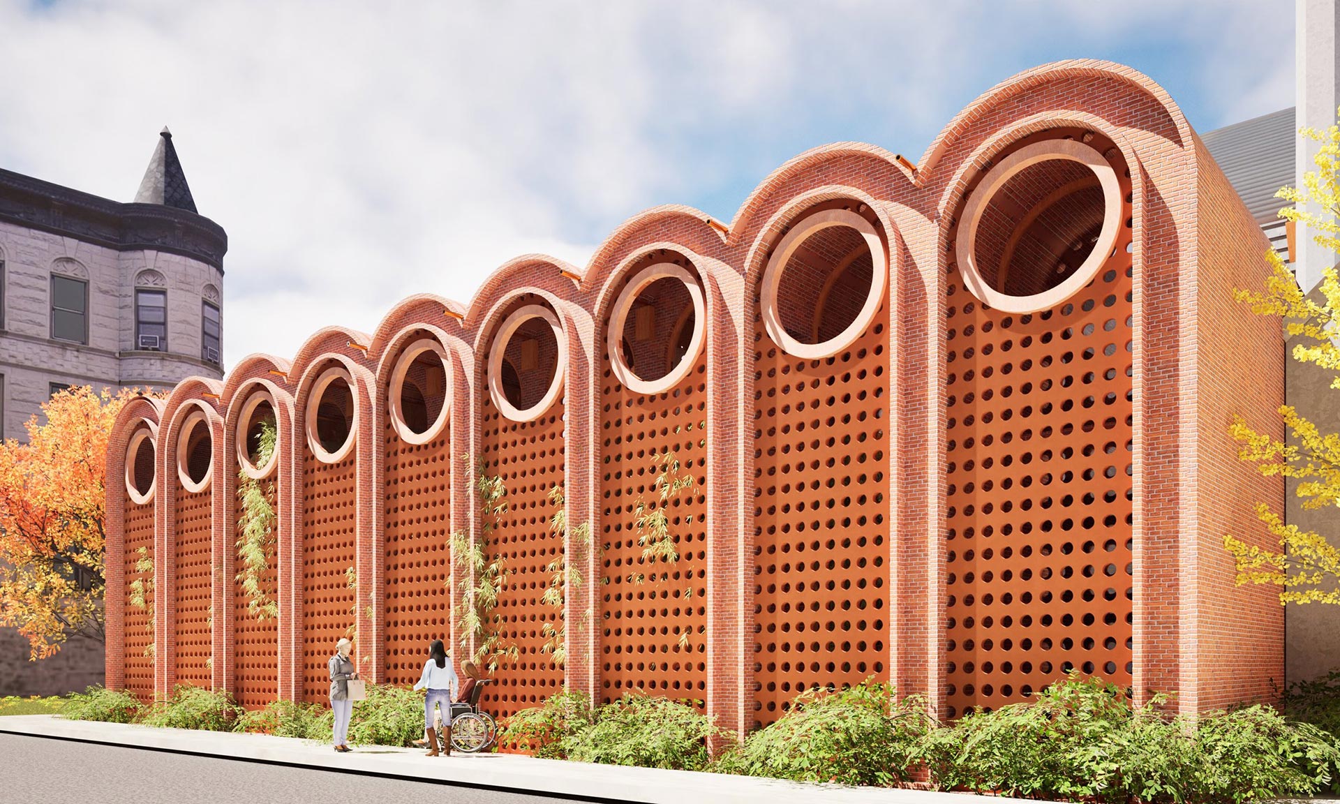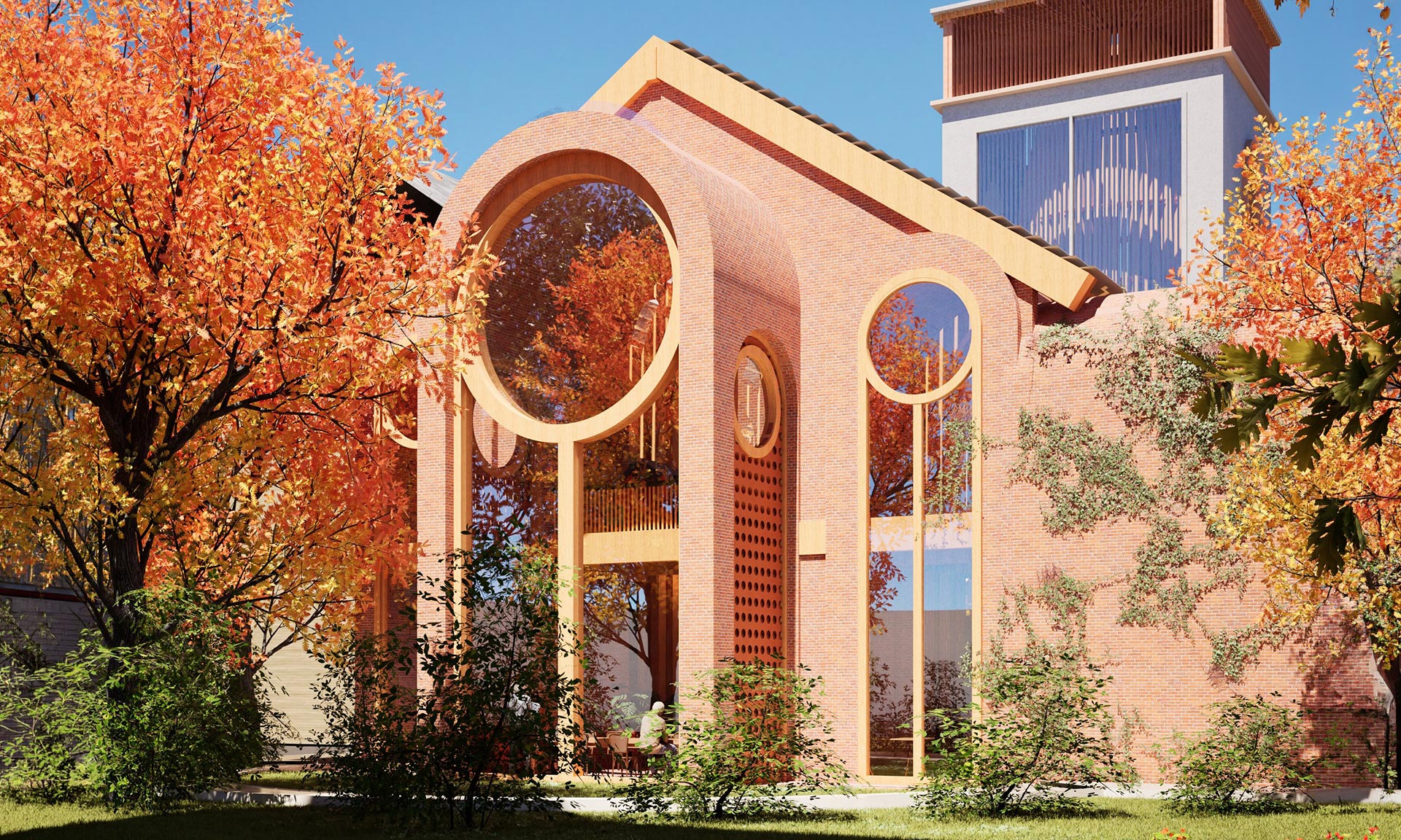 „Soukromé pokoje, místnosti pro fyzioterapii a arteterapii a prostory pro akce jsou umístěny v sérii cihlových kleneb, které byly přidány k západní fasádě. Vnitřní zahrada osázená lineárním bambusovým hájem odděluje příčky ze sádrokartonu západní fasády od oken od podlahy ke stropu, která vnášejí zeleň do každé místnosti. Sluncem vypalované cihlové zdi oddělují soukromé pokoje ve druhém patře, do kterých se vstupuje původními gotickými okny, která patřila luteránskému kostelu Faith Lutheran Church. Gotická okna na východní fasádě byla přeměněna na čtecí koutky,“ dodávají.