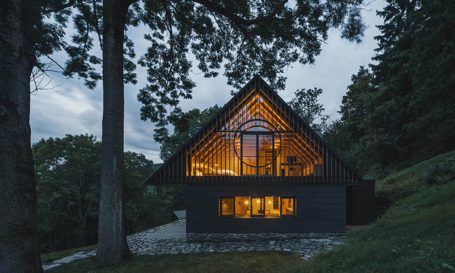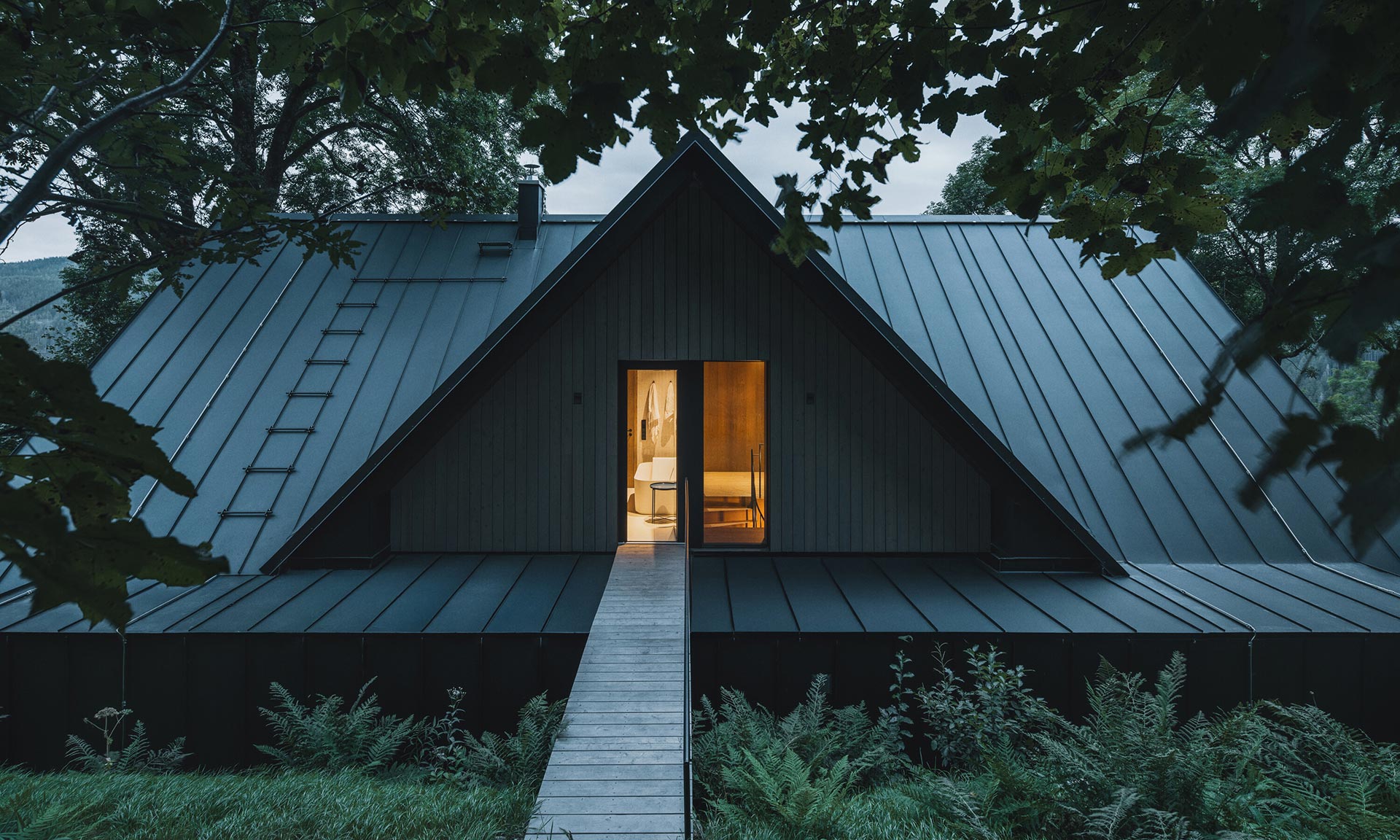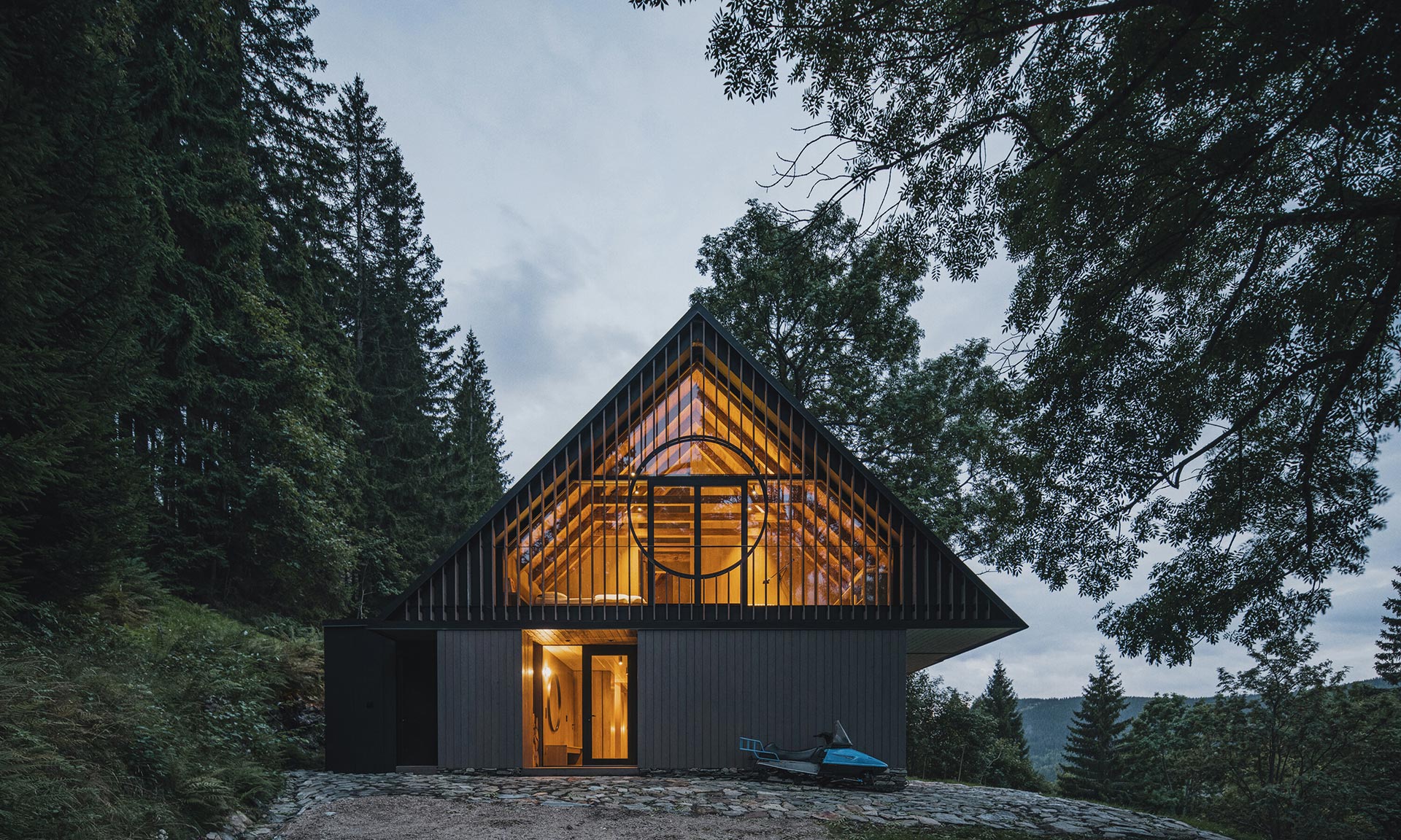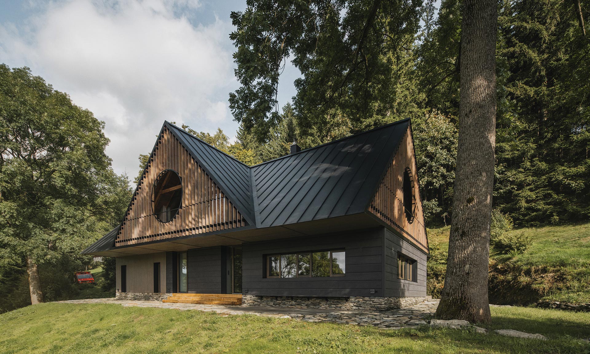 Ve Strážném v Krkonoších vyrostla po původní údajně nezachránitelné roubené chalupě novostavba chalupy ve stráni. Na úchvatném místě pod vzrostlými stromy a výhledem do širokého okolí se klene dvoupodlažní objekt se sedlovou střechou, jejíž design odkazuje k typickým horským chalupám. Příjemný moderní design se špetkou odkazu do historie se projevuje i v interiéru, který má ještě větší kouzlo než exteriér.