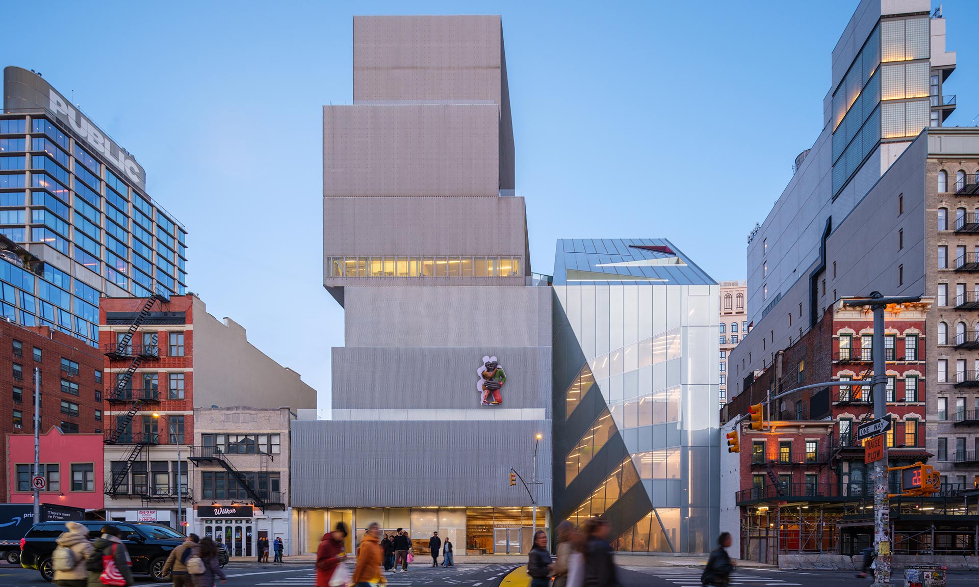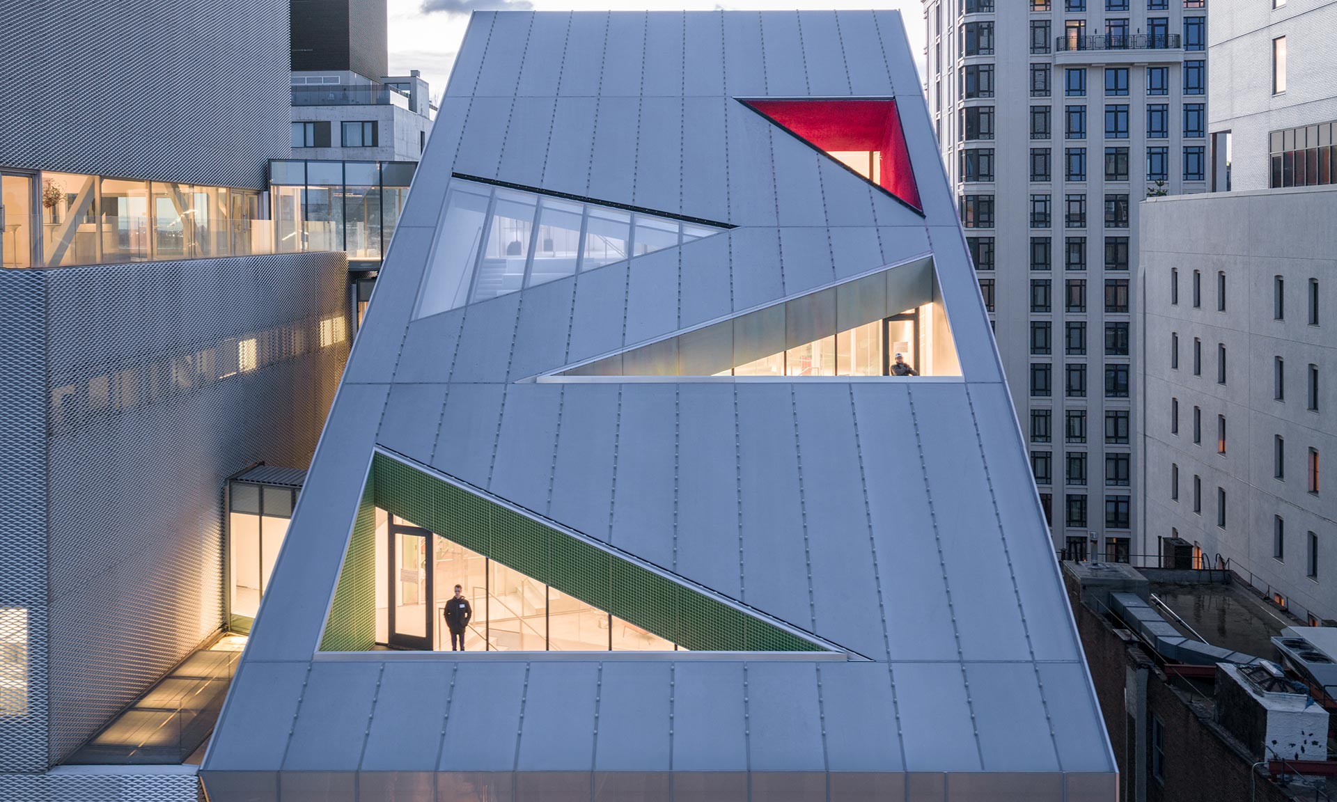 S drobným zpožděním bylo v New Yorku otevřeno nové muzeum New Museum, které není zcela novým muzeem jako institucí, ale rozšíření ikonické budovy muzea z roku 2007 od ateliéru SANAA. Původní hmota budovy postavená z šesti bílých bloků byla rozšířena o hmotu s výrazným zalomeným pláštěm a skosenou střechou, z níž vystupují balkóny a okna. Celým rozšířením se nese motiv trojúhelníku.