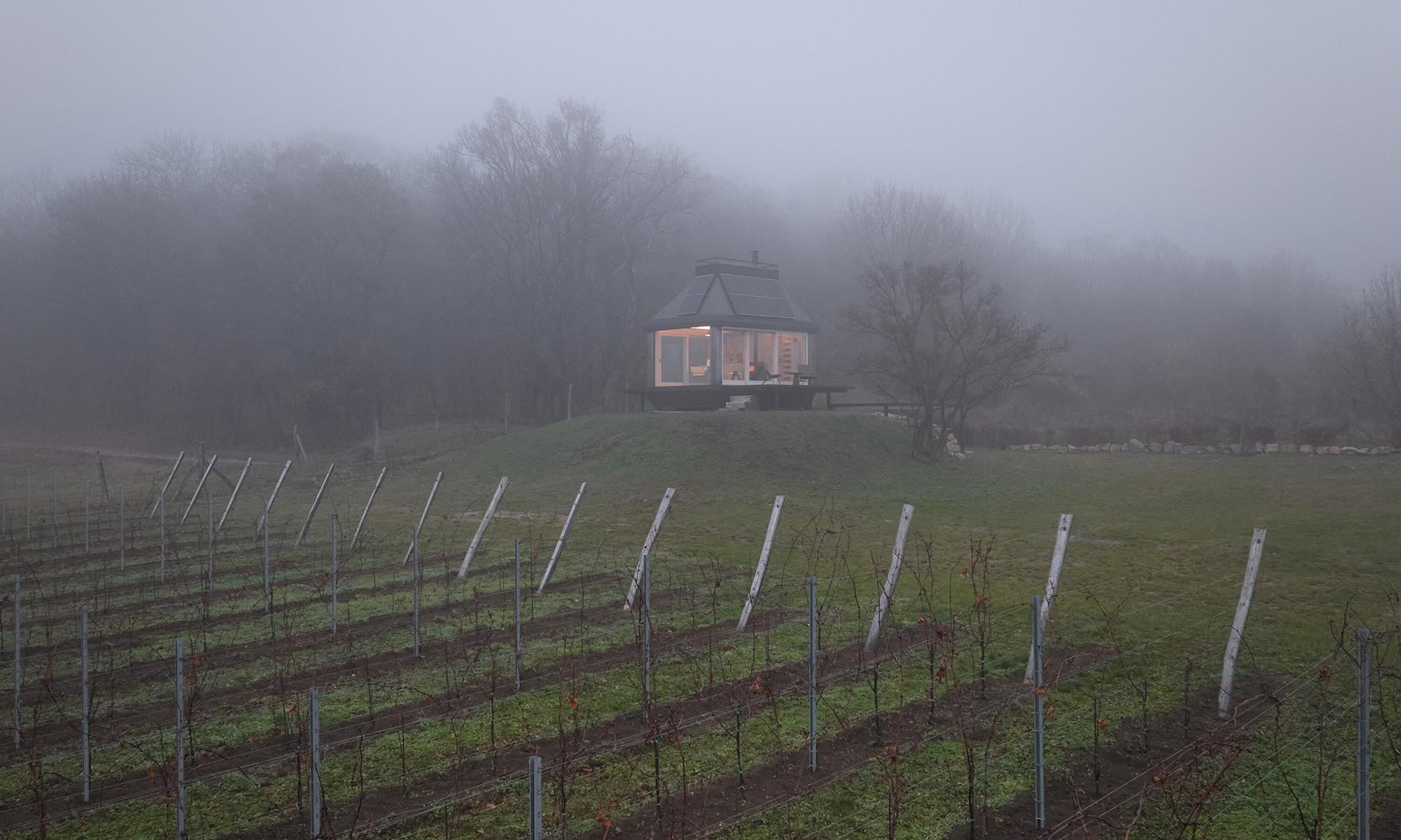„Objekt reaguje na výhled maximálním otevřením. Dvě strany domku se otevírají pomocí sklopných teras, které po vyklopení odhalí posuvné skleněné stěny. Přední stínění skrývá celoplošné prosklení čelní stěny. Většinu času se odehrává právě v prostoru mezi těmito otvory. Po jejich otevření se interiér rozšíří o terasy na obou stranách a užitná plocha se opticky i funkčně znásobí. Interiér tak není oddělen od exteriéru, ale plynule s ním spolupracuje,“ uvádí autoři Martin Mikovčák a Viktor Mikovčák.