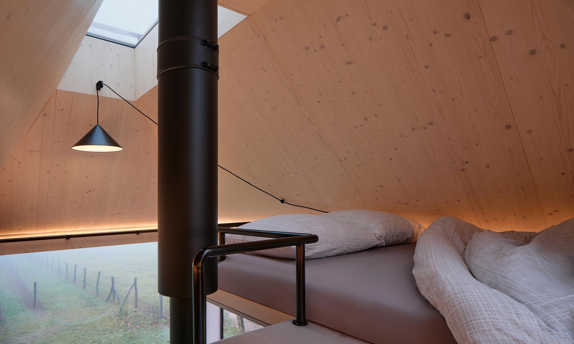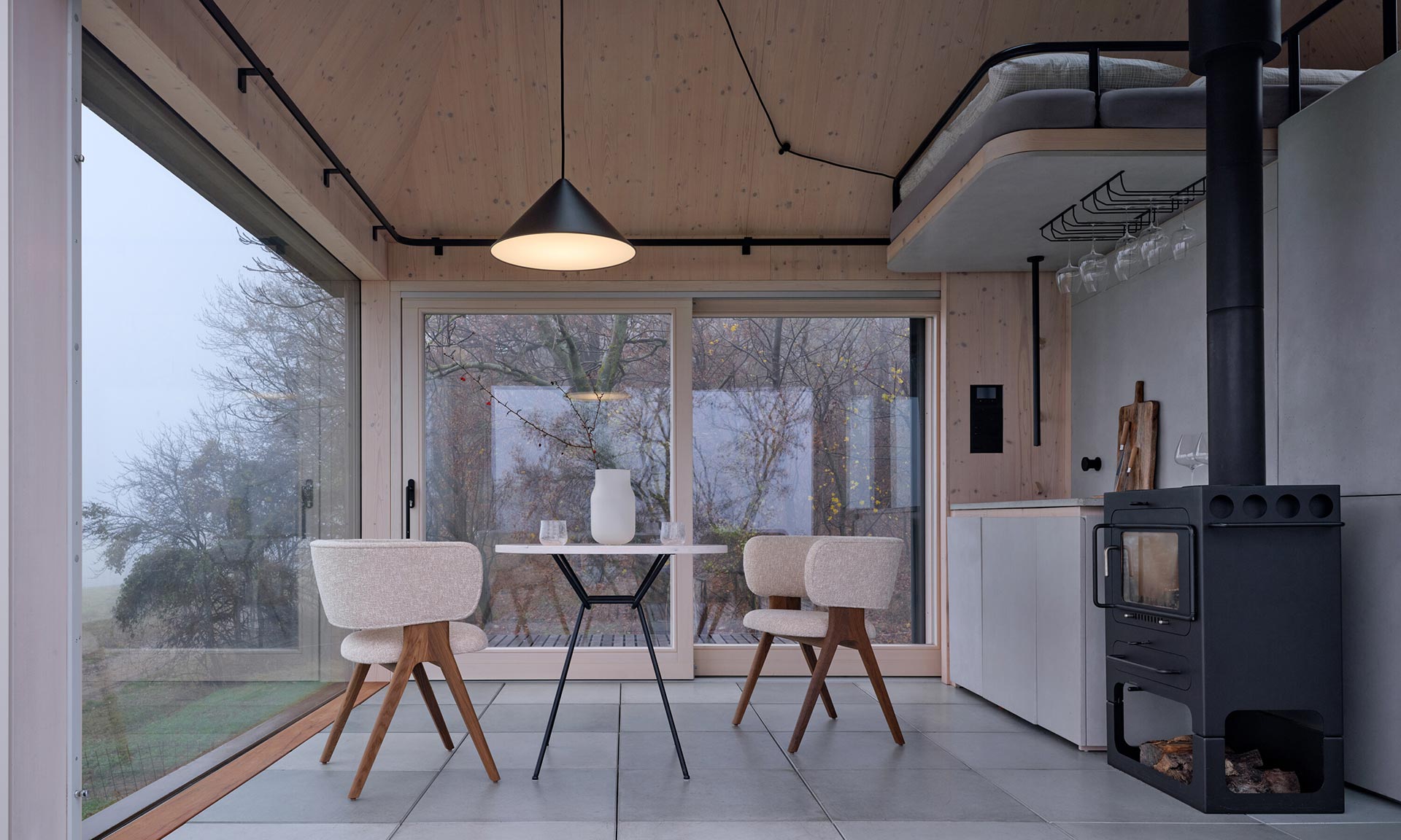 „Za hlavním obytným prostorem se nachází kompaktní kuchyňská linka a za ní koupelna se sprchovým koutem. Betonové umyvadlo umístěné přímo u okna nabízí výhled do lesa. Tento moment zpomaluje ranní rituál a propojuje každodenní život s přírodou. Večer nastává proměna. V interiéru visí lampa, jejíž kabel sahá až z podkroví. Po zatažení se lampa začne zvedat a odhalí prostor na spaní, který během dne zůstává skrytý. Absence pevného schodiště umožňuje, aby podkroví nebylo vizuálně přítomné. Schodiště je zasunuto ve skříni a působí jako regál, objeví se až v okamžiku potřeby. Podkroví má kontrastní atmosféru – místo prosklených stěn ho chrání hutný plášť střechy a uzavírá uživatele do intimního prostoru. Nad hlavou zůstává pouze stropní světlík určený k pozorování hvězd,“ dodávají.