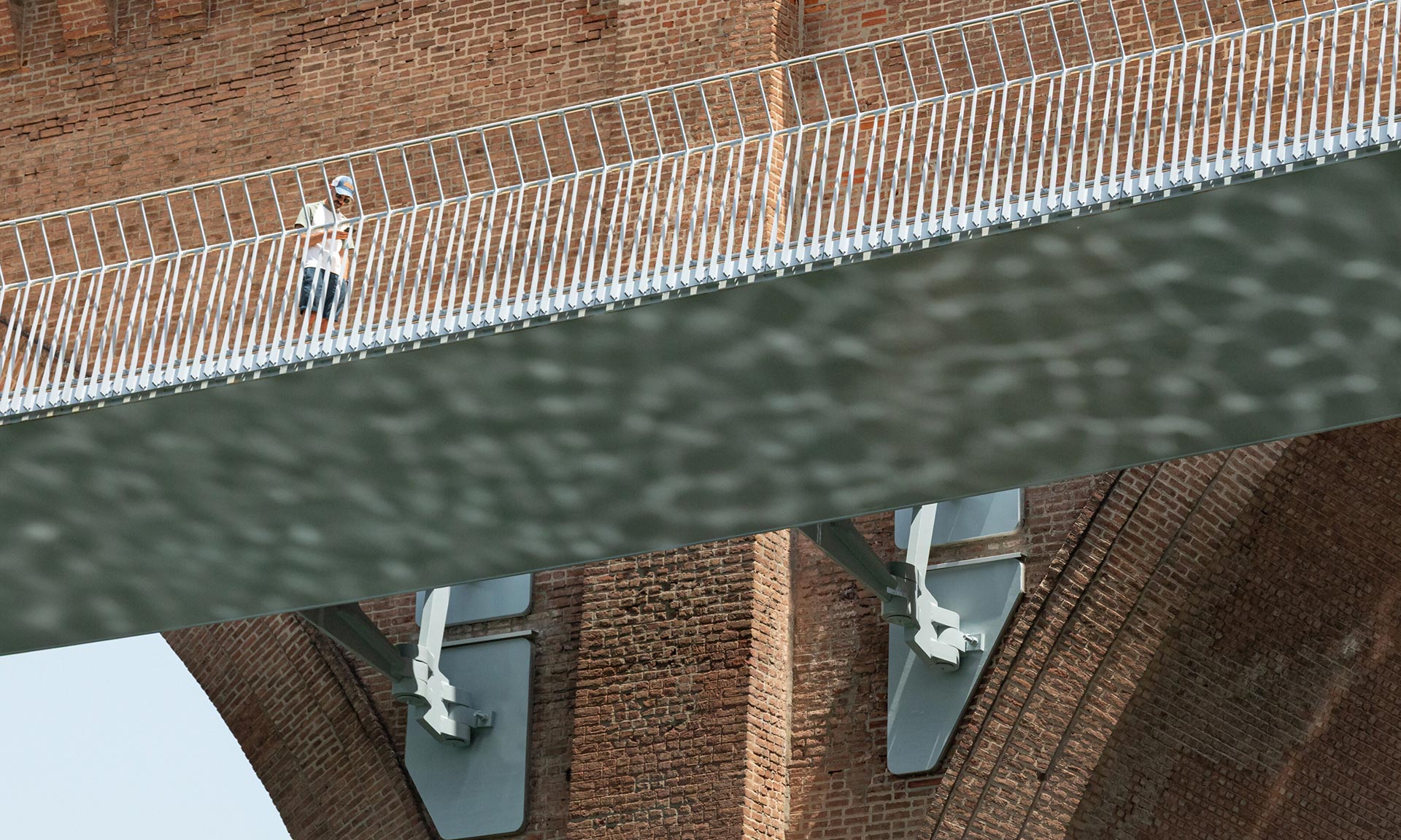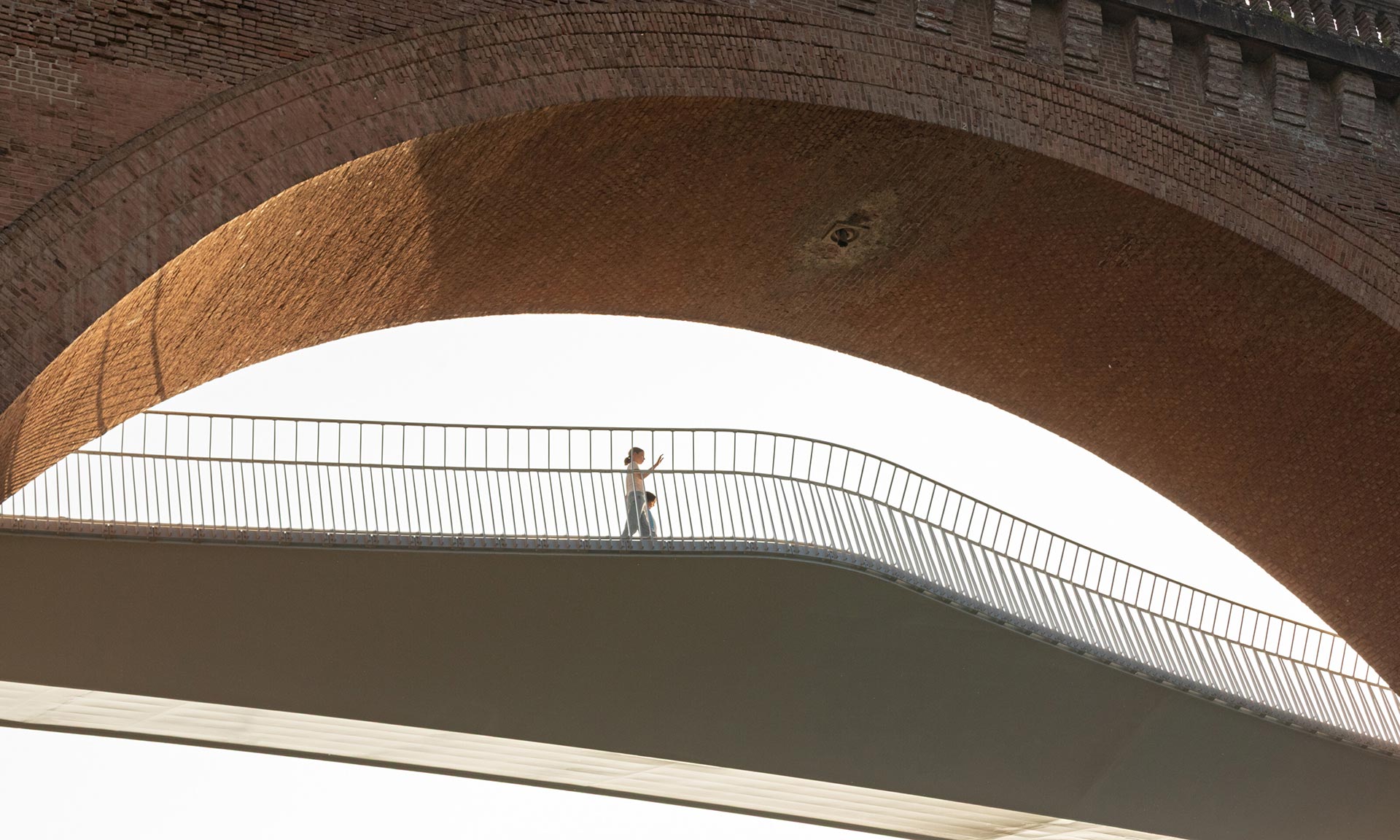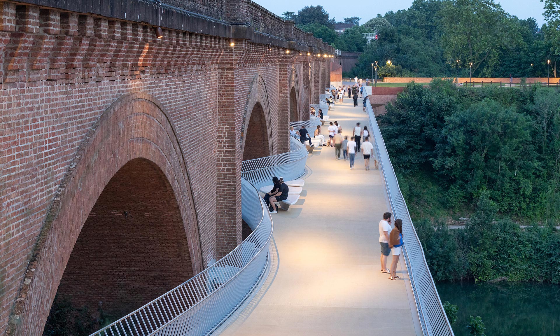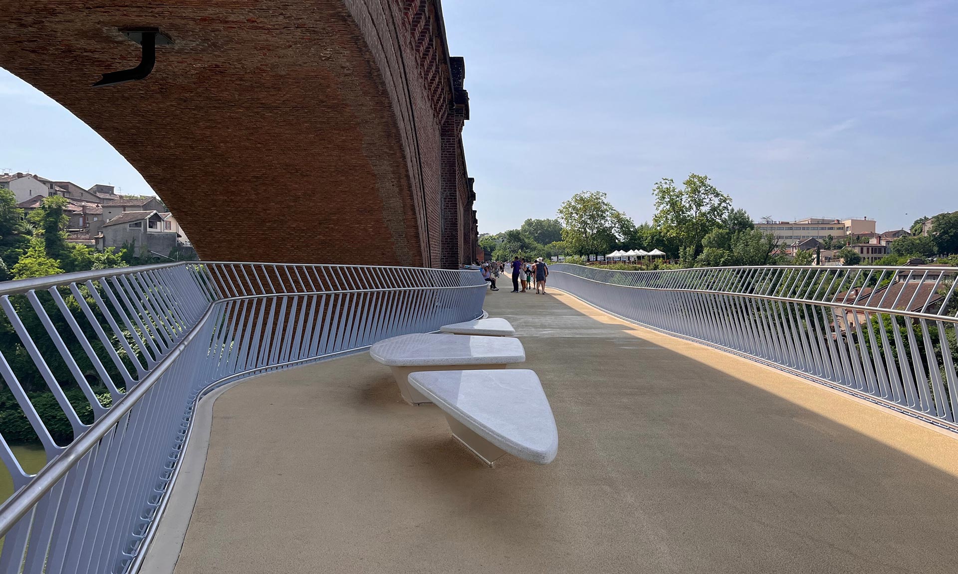 „Na okraji biskupského města Albi, zapsaného na seznamu světového dědictví UNESCO, zlepšuje nové propojení pro pěší a cyklisty podél železničního viaduktu spojení mezi čtvrtěmi Castelviel a Pratgraussal. Konstrukce se skládá z trojúhelníkového kovového profilu, který se rozšiřuje a vytváří vyhlídková místa. Štíhlost, čistá, lesklá spodní strana v pastelově modré barvě a filigránové zábradlí z nerezové oceli dodávají stavbě pocit nehmotnosti a pomíjivosti, které kontrastují s mohutností a racionalitou viaduktu,“ uvádí k projektu architekti z Ney & Partners.