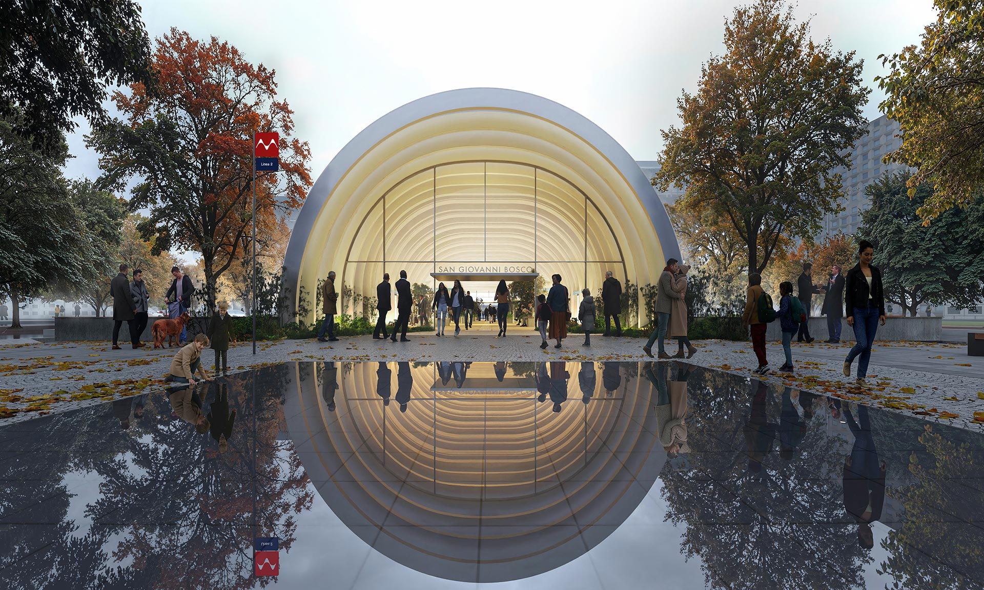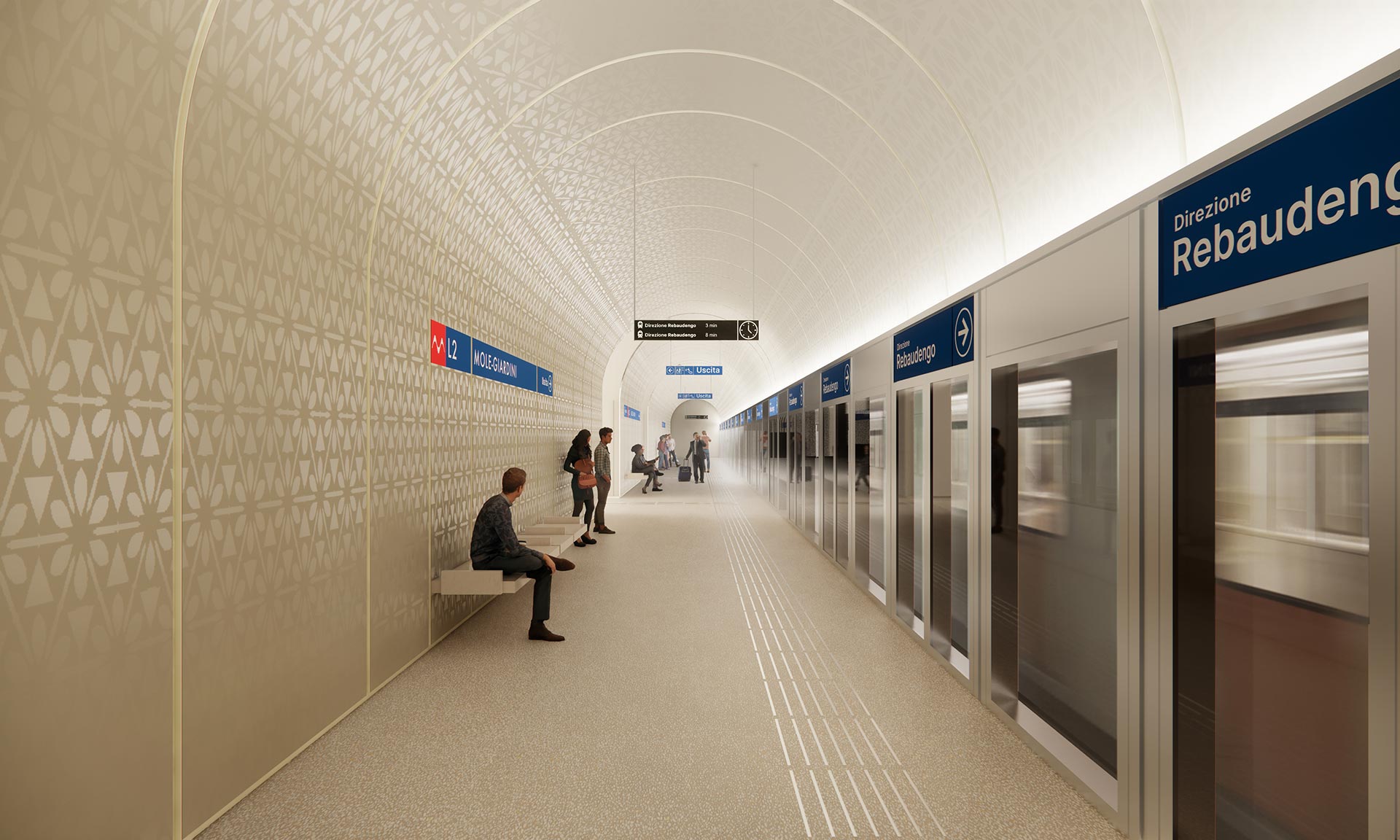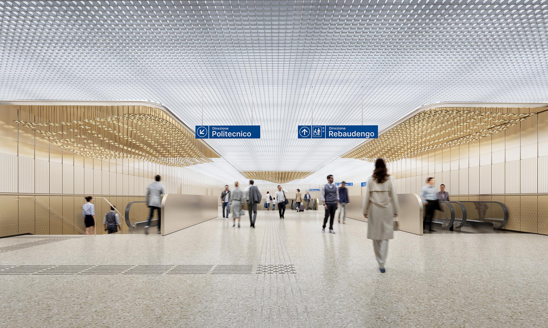 „Architektonický koncept je založen na přechodu. Vycházející z umírněných fasád Turína, výrazných geometrických tvarů a bohatších vnitřních prostorů se design přesouvá od klidné přítomnosti na úrovni ulice k teplejším a atmosférickým prostorům pod zemí. To vytváří moderní identitu linky a zároveň zachovává silný vztah k dědictví města. Návrh, vyvinutý jako flexibilní modulární systém, se dokáže přizpůsobit různým městským podmínkám a zároveň zachovat konzistenci v celé síti. Tento přístup umožňuje každé stanici reagovat na své umístění a program, aniž by ztratila přehlednost celku. Identita je organizována na třech úrovních: identita sítě, identita systému a identita stanice, což podporuje orientaci, rozpoznatelnost a výrazný pocit sounáležitosti s místem,“ uvádí k projektu architekti z UNStudia.
