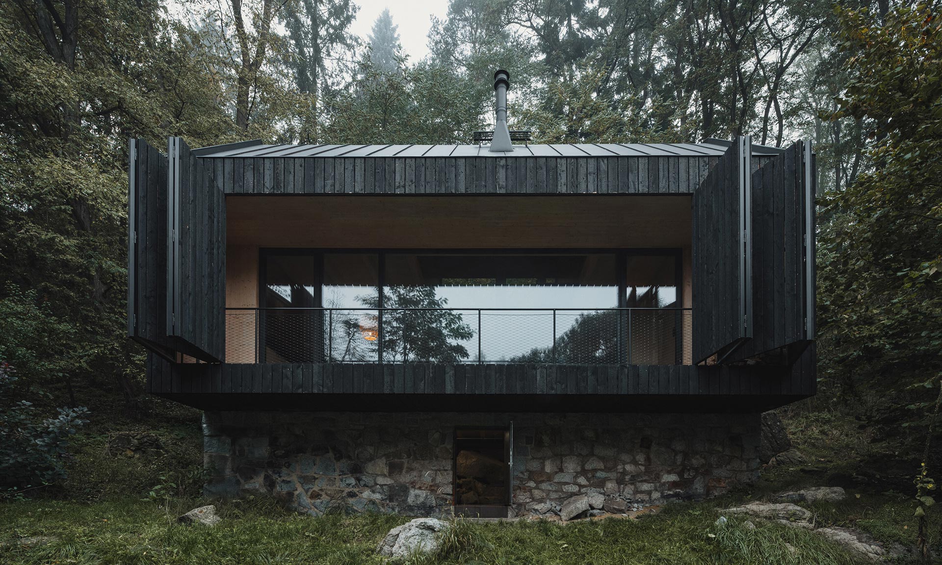 „Chata je lehkou dřevěnou stavbou posazenou na robustní kamenné podezdívce. Dřevěný skelet je z interiéru opláštěn smrkovou biodeskou, zvenčí fasádou z opálených modřínových prken. Opálením získala prkna fasády trvanlivost, současně chatu trochu zošklivěla pro nevítané hosty. V neposlední řadě ji propojila – byť možná trochu cynickým způsobem – s předchozí stavbou. Směrem ke svahu za chatou je chata opláštěna falcovaným plechem odolným vůči vodě stékající tady ze střechy. Interiér je díky jednotnému materiálu a barevnosti – biodesce s přírodní barevností a černému kovu – celistvou jeskyní nedělenou na dům a nábytek. Černý kov krbových kamen, schodiště a dalších částí interiéru přirozeně navazuje na opálenou fasádu jak barevností, tak blízkostí tématu ohně. Odolná podlaha z přírodního kaučuku s kamenným vsypem umožňuje svobodný pohyb mezi chatou a jejím okolím. Chata je s výjimkou elektřiny samostatnou jednotkou. Vodou je zásobována ze studny na pozemku, odpadní vody jsou zachycovány nádrží v podezdívce objektu. Vytápění zajišťují krbová kamna a přímotopy,“ uvádí architekti z ateliéru Mimosa.